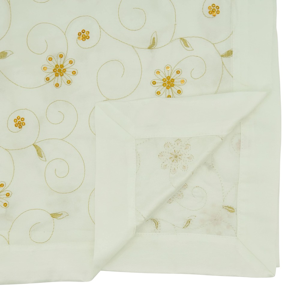 Add a bit of sparkle to your tabletop with this charming Sequined Design Embroidered Table Runner. Featuring a light ivory background and delicate embroidery, the table runner brings an elegant note to your table and elevates the décor. It is a great accent piece for special occasions and entertaining guests. Size: 16"x90" Design is not reversible Runner has no lining Beautiful embroidery, adds a delicate touch. Material: 100% polyester + Care: dry clean