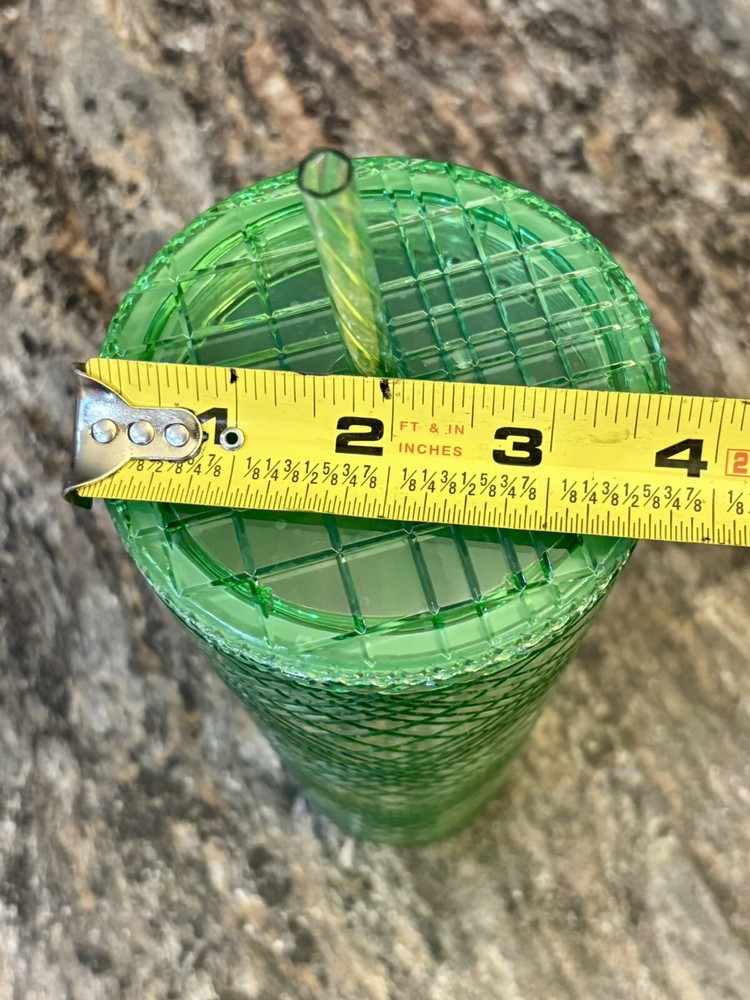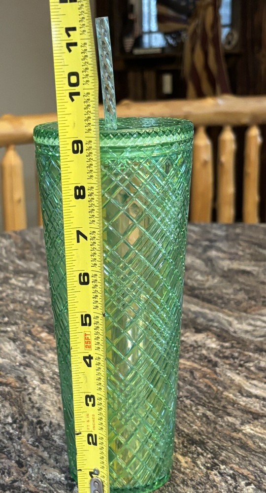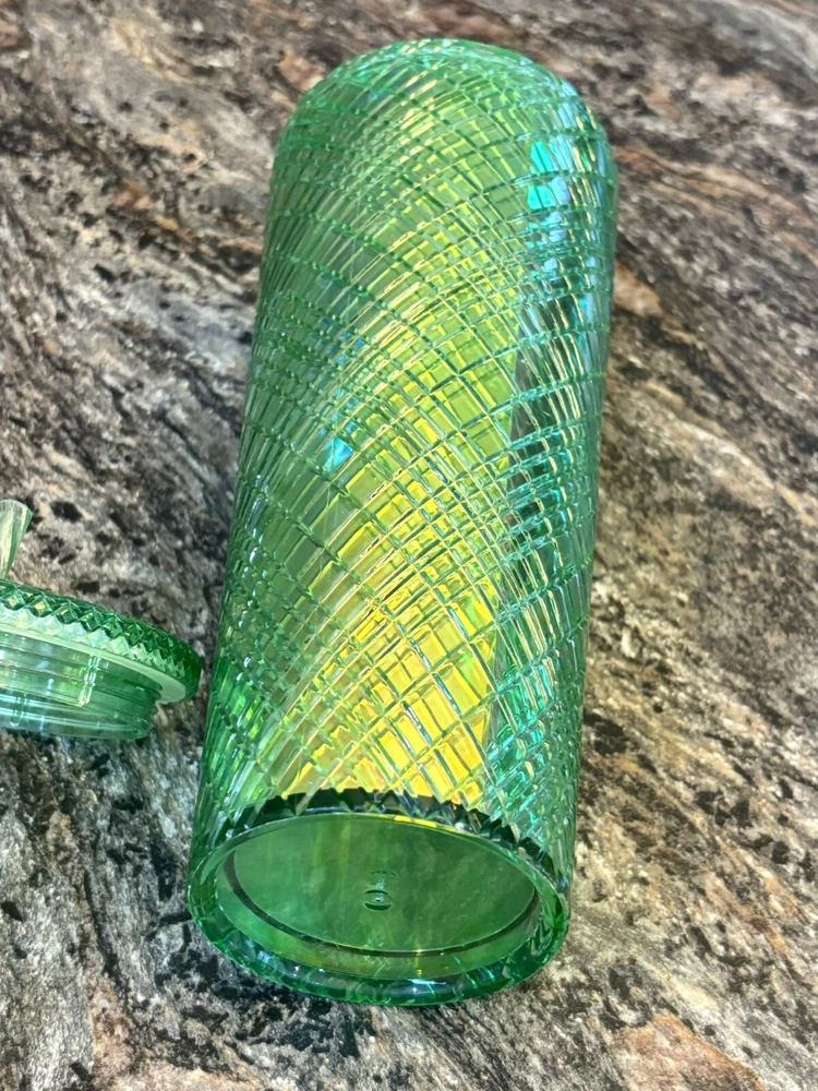 This Holiday Emerald Green Jeweled Tumbler Cold Cup is a three-piece set featuring a 24oz round tumbler made of plastic. The tumbler has a geometric oblong vertical design with a jeweled pattern in a festive holiday color. It comes with a lid and straw, making it suitable for cold beverages. Additionally, it is decorated with etched patterns and color-changing in light , perfect for the winter season. This stylish and insulated tumbler is ideal for festive occasions or everyday use. 2.2.25