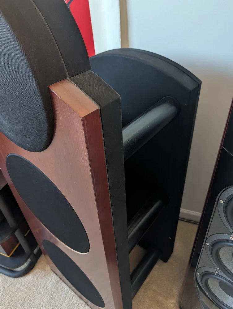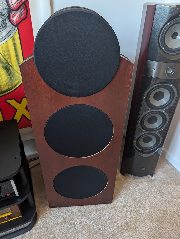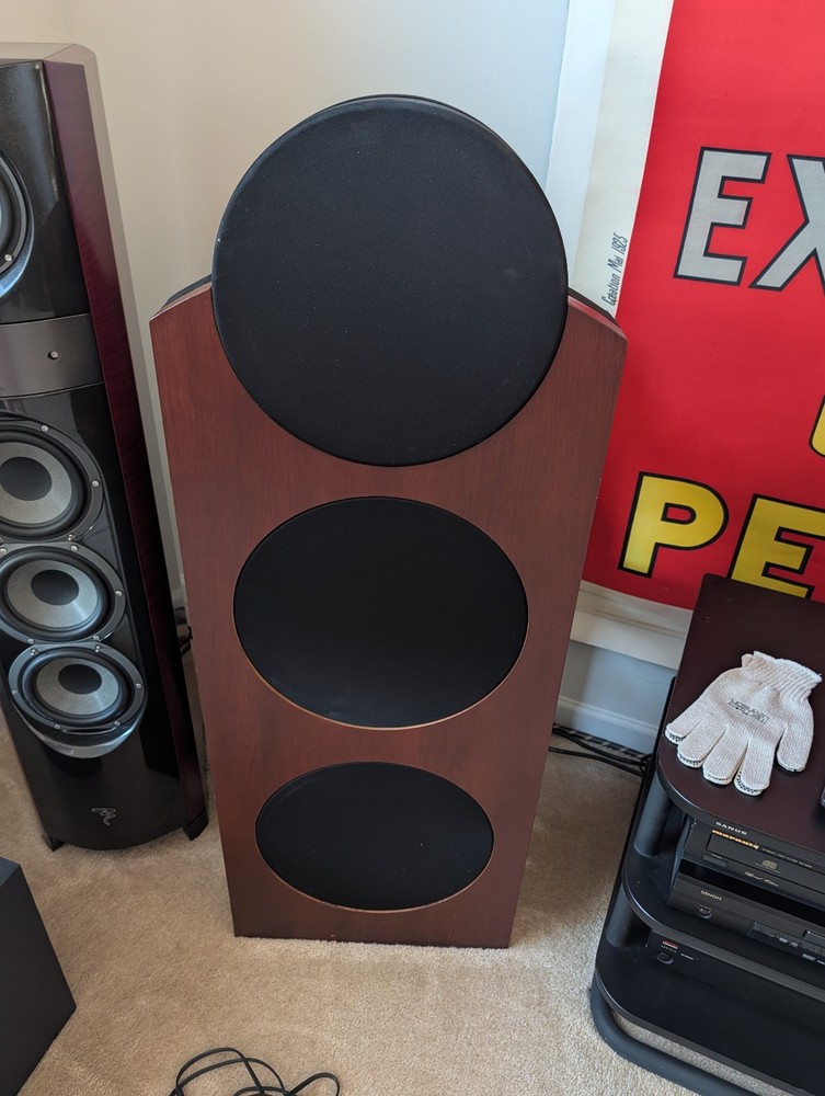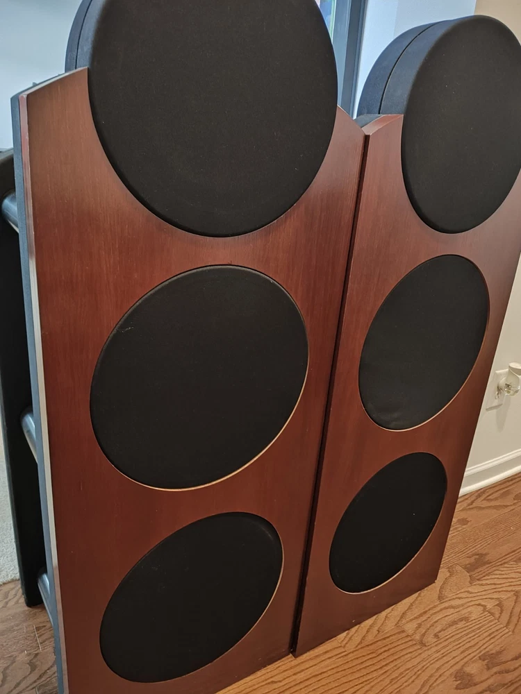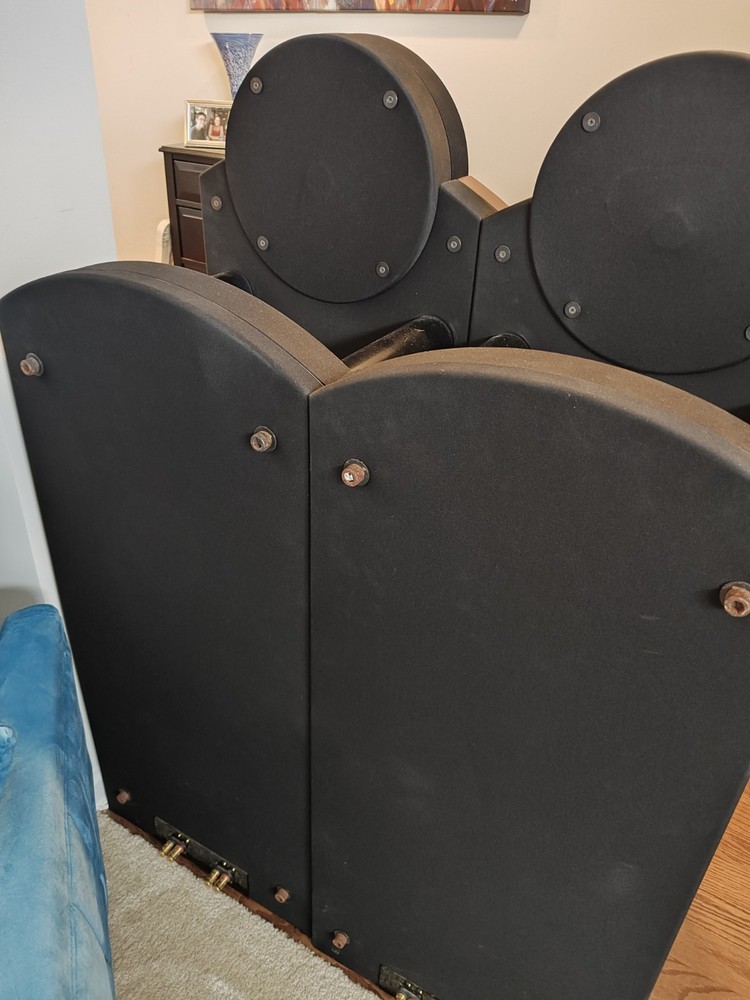 Award Winning Speakers from Denvers Rocky Mountain Audio Festival rated #1in Class with Dual Upgraded Behringer DSPs included! Like new! Same speakers as in pictures. The CS1, a two-way design that uses four 10" bass drivers, two mounted on the front and two on the back. They operate in pairs in a dipole configuration. When the top one on the front moves out, the corresponding one on the back top moves in, and vice versa. The same goes for the bottom woofers. The advantage of a dipole configuration is that because the woofers are moving out of phase, you get cancellation to the sides, resulting in null areas that cause less side-wall reflection. The higher frequencies (750Hz up) are reproduced by a front-mounted compression driver that has a waveguide surrounding it to direct most of its output straight ahead -- again, reducing wall reflections. In short, this is a speaker that directs most of its sound directly at the listener. If that's not enough, it has an external digital crossover, so you don't get the phase irregularities that you do with conventional crossovers.