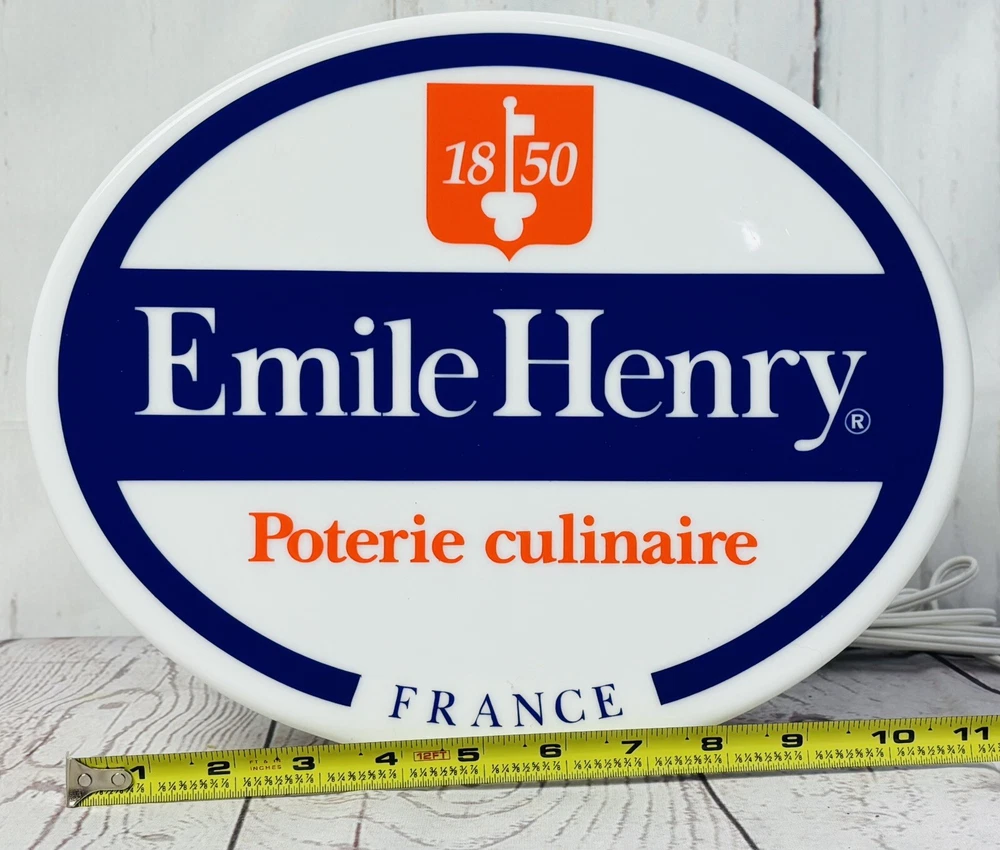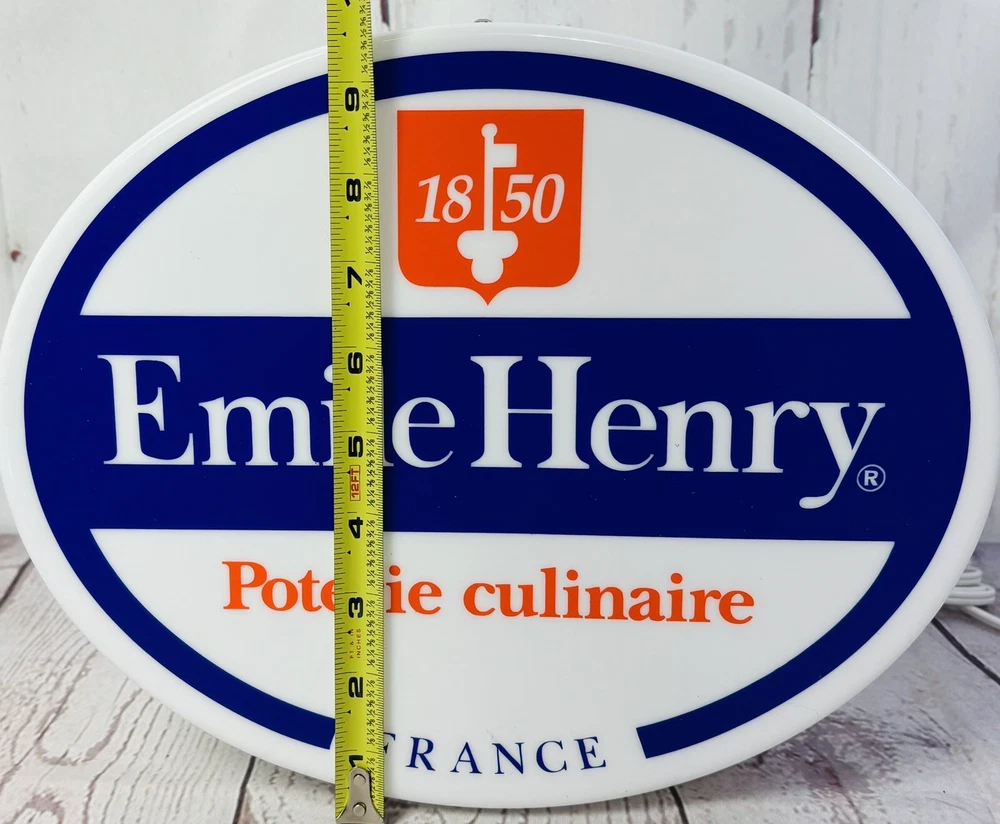 This is an extremely rare Emile Henry lighted plastic store display sign, measuring 12x9.5 inches. The sign features the brand's name in white letters and is an advertising piece for their merchandise and memorabilia. It is a collectible item and would make a great addition to any advertising or store display collection.
