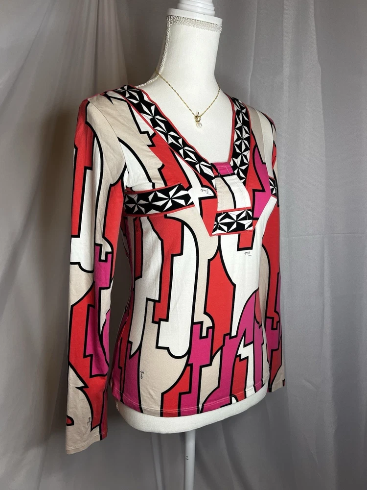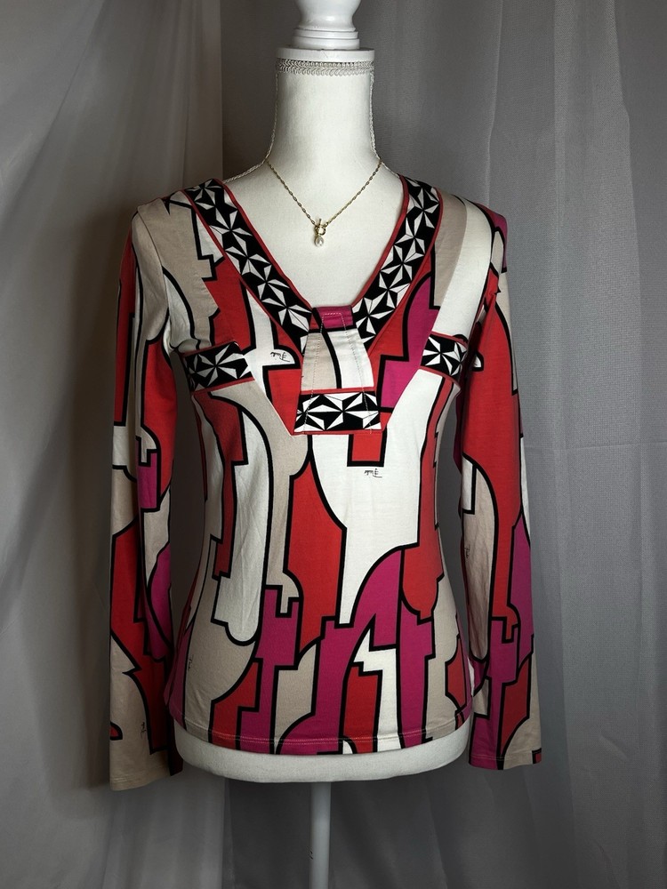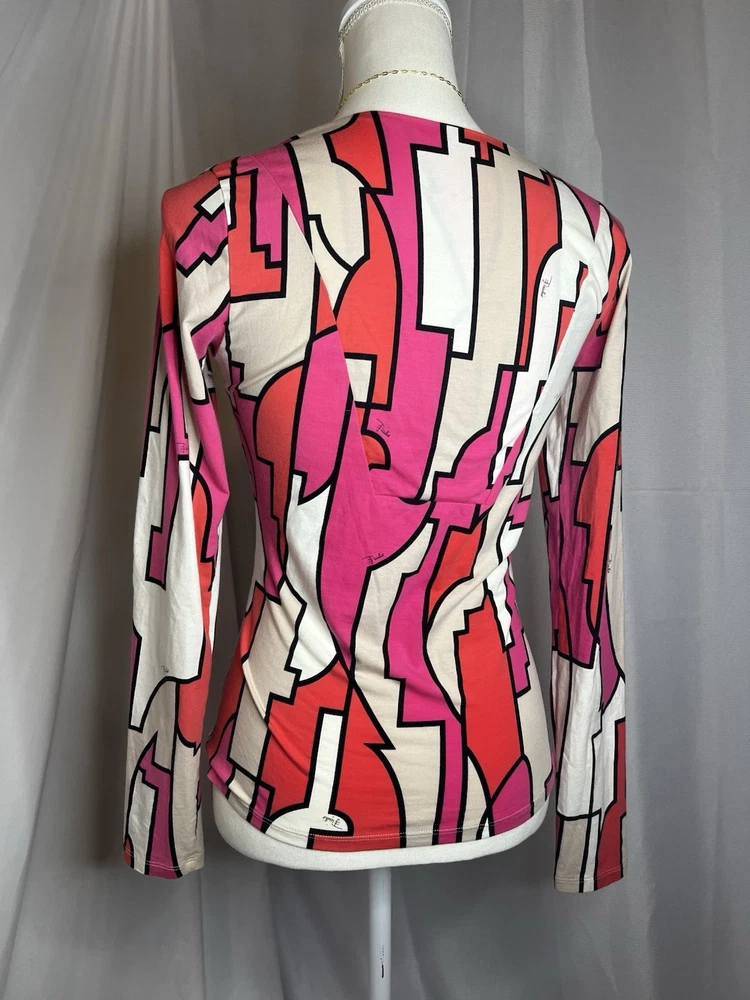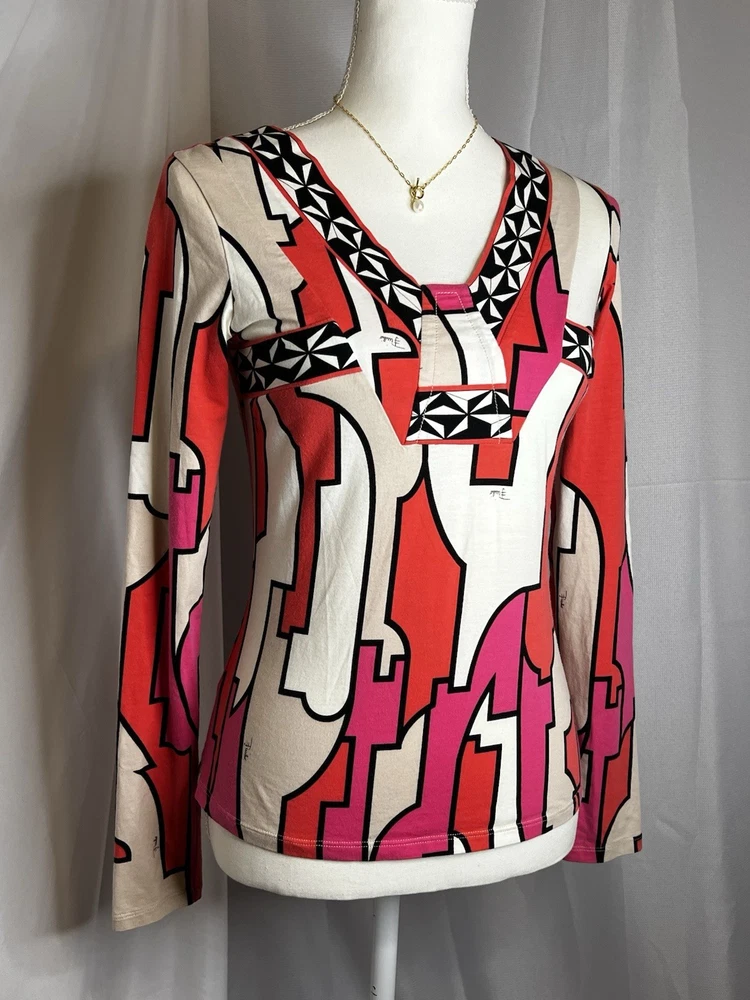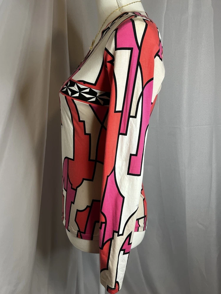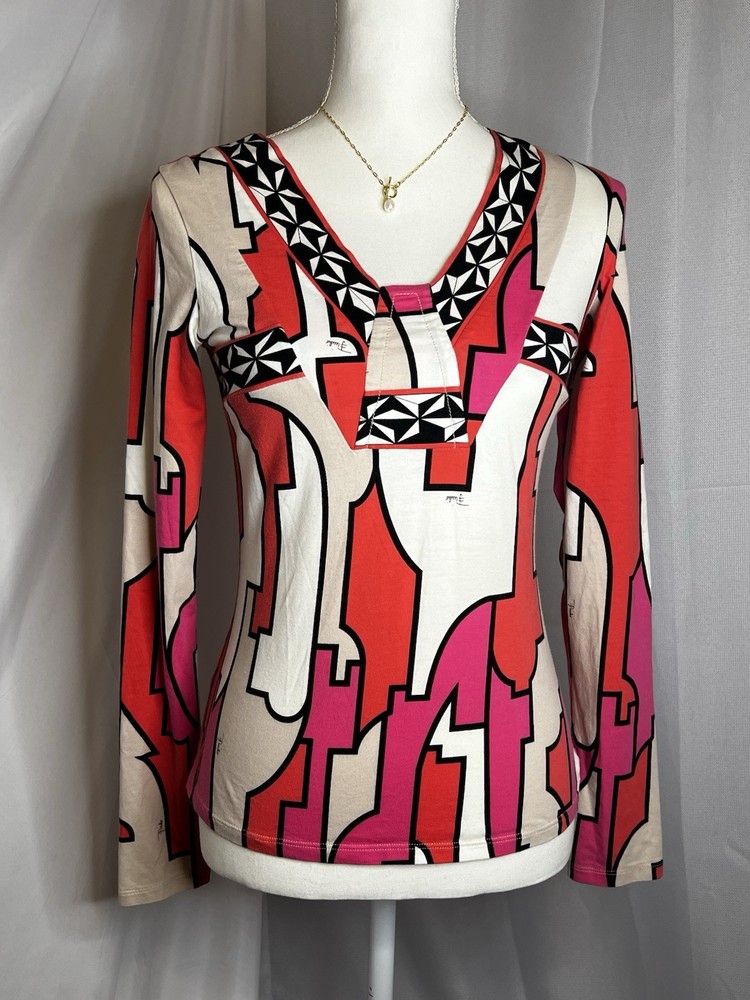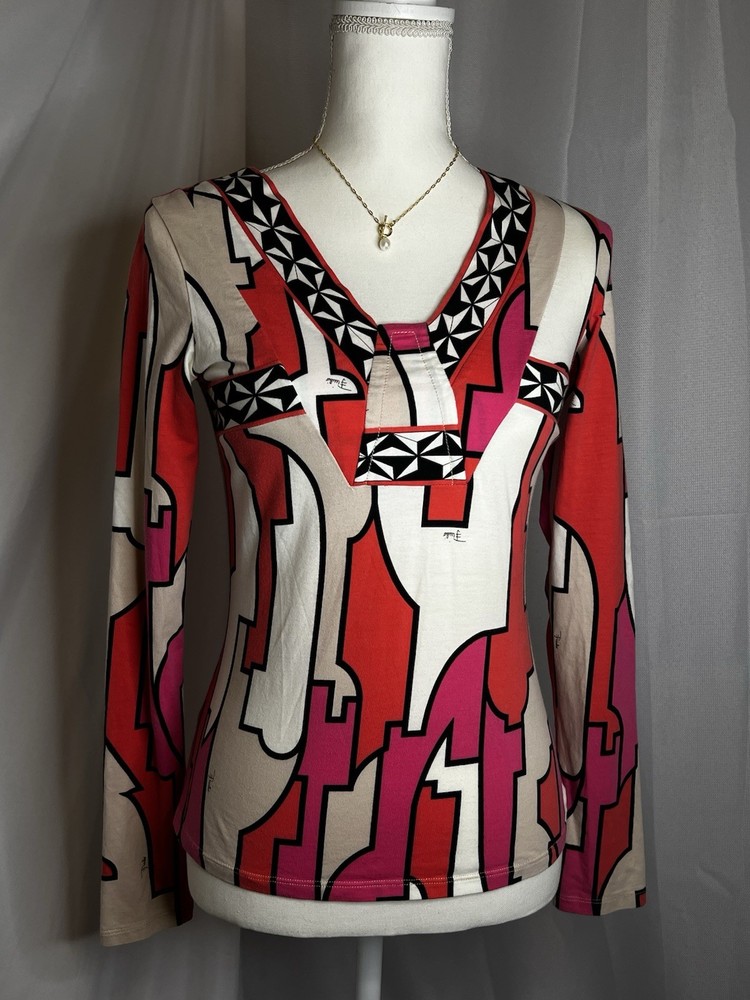 Brand: Emilio Pucci, estimated from 2008 Size: US 4, UK 6, F 36,I 34 (Check measurements) Notes: This rare long sleeve Emilio Pucci is a iconic staple in the long line of beautiful garments by the brand. The classic Emilio Signature is on the graphic geometric print all over the top, there is a tiny hole on the inside of top next to the brand label (I am assuming from previous price tag?) but it is not visible while wearing the top. There is a little stain on the sleeve of the shirt, of course right where it is white. I tried using stain remover, but had no luck. Measurements taken flat : pit to pit 15.5"inches, stretches to about 17.5/18"inches due to material length 23"in *mannequin's bust measures about 34"inches around for reference If unsure sizing, I highly recommend taking a top you own, lay it flat & measure pit to pit to compare!