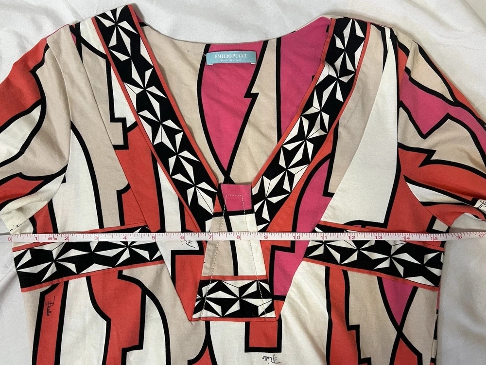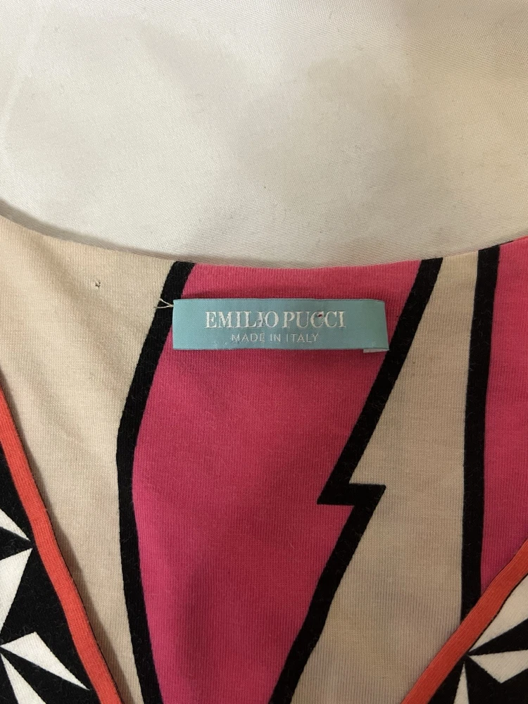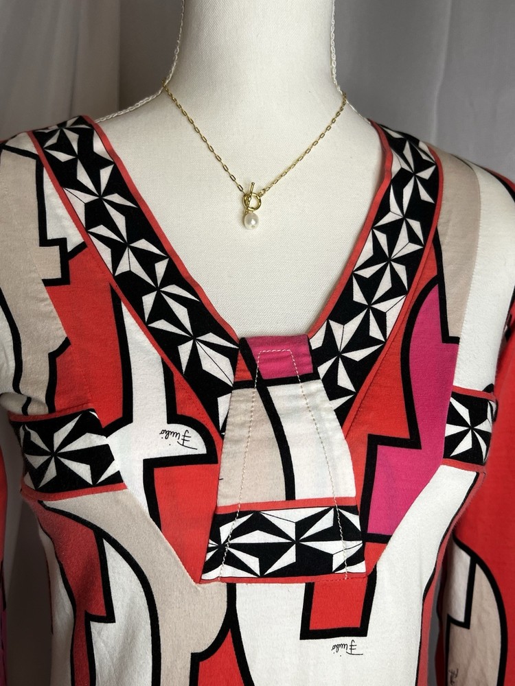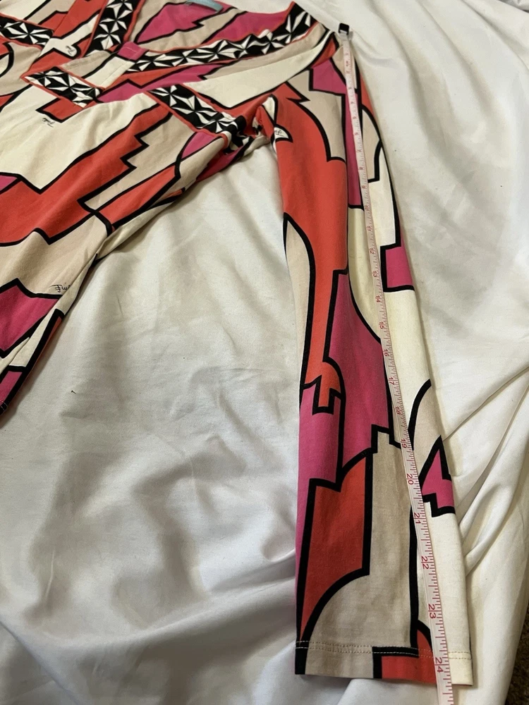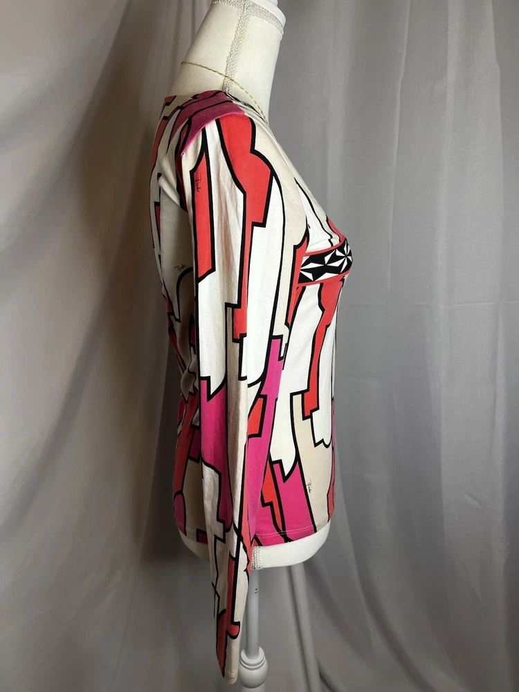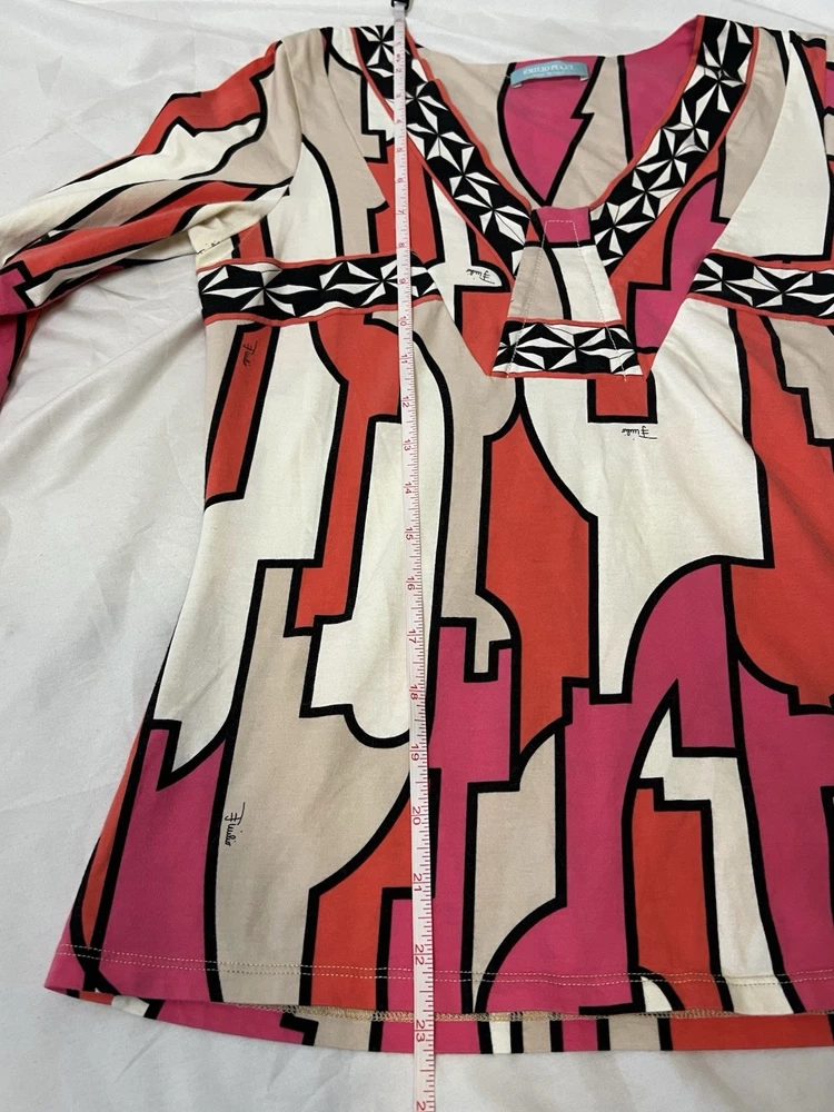 Brand: Emilio Pucci, estimated from 2008 Size: US 4, UK 6, F 36,I 34 (Check measurements) Notes: This rare long sleeve Emilio Pucci is a iconic staple in the long line of beautiful garments by the brand. The classic Emilio Signature is on the graphic geometric print all over the top, there is a tiny hole on the inside of top next to the brand label (I am assuming from previous price tag?) but it is not visible while wearing the top. There is a little stain on the sleeve of the shirt, of course right where it is white. I tried using stain remover, but had no luck. Measurements taken flat : pit to pit 15.5"inches, stretches to about 17.5/18"inches due to material length 23"in *mannequin's bust measures about 34"inches around for reference If unsure sizing, I highly recommend taking a top you own, lay it flat & measure pit to pit to compare!