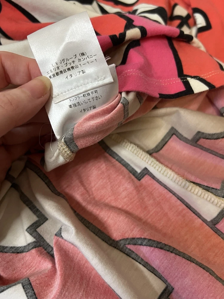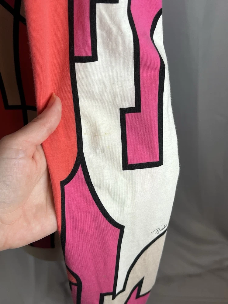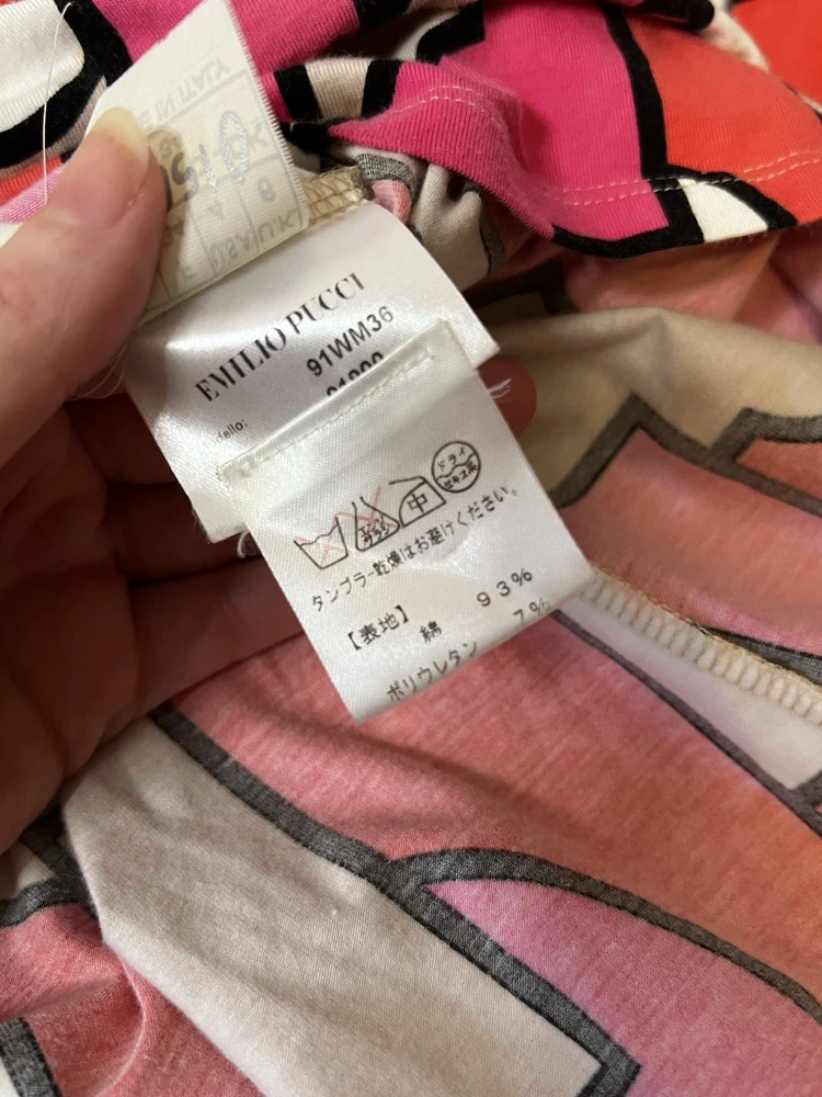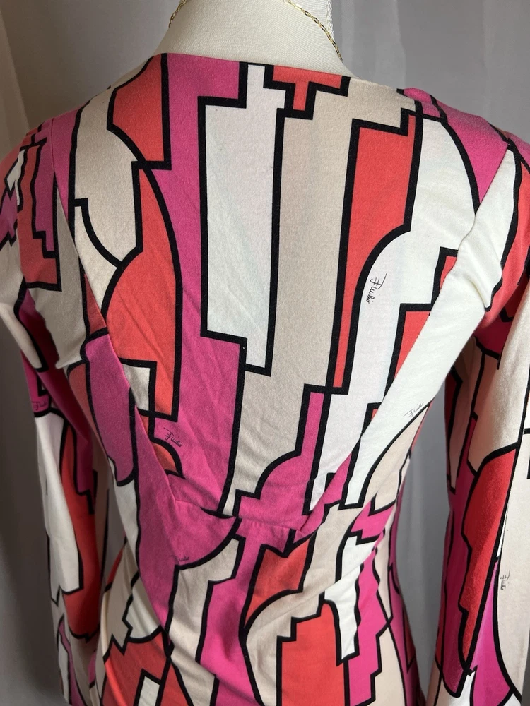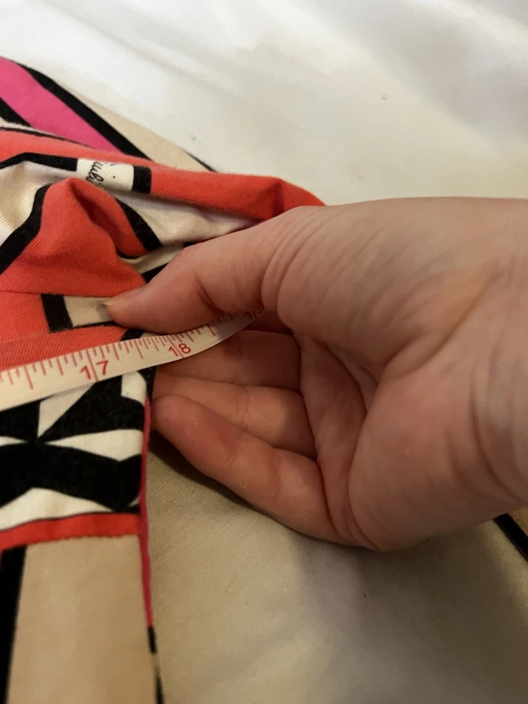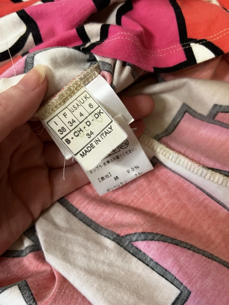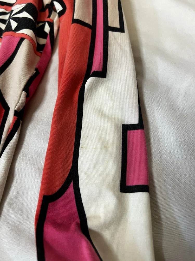 Brand: Emilio Pucci, estimated from 2008 Size: US 4, UK 6, F 36,I 34 (Check measurements) Notes: This rare long sleeve Emilio Pucci is a iconic staple in the long line of beautiful garments by the brand. The classic Emilio Signature is on the graphic geometric print all over the top, there is a tiny hole on the inside of top next to the brand label (I am assuming from previous price tag?) but it is not visible while wearing the top. There is a little stain on the sleeve of the shirt, of course right where it is white. I tried using stain remover, but had no luck. Measurements taken flat : pit to pit 15.5"inches, stretches to about 17.5/18"inches due to material length 23"in *mannequin's bust measures about 34"inches around for reference If unsure sizing, I highly recommend taking a top you own, lay it flat & measure pit to pit to compare!
