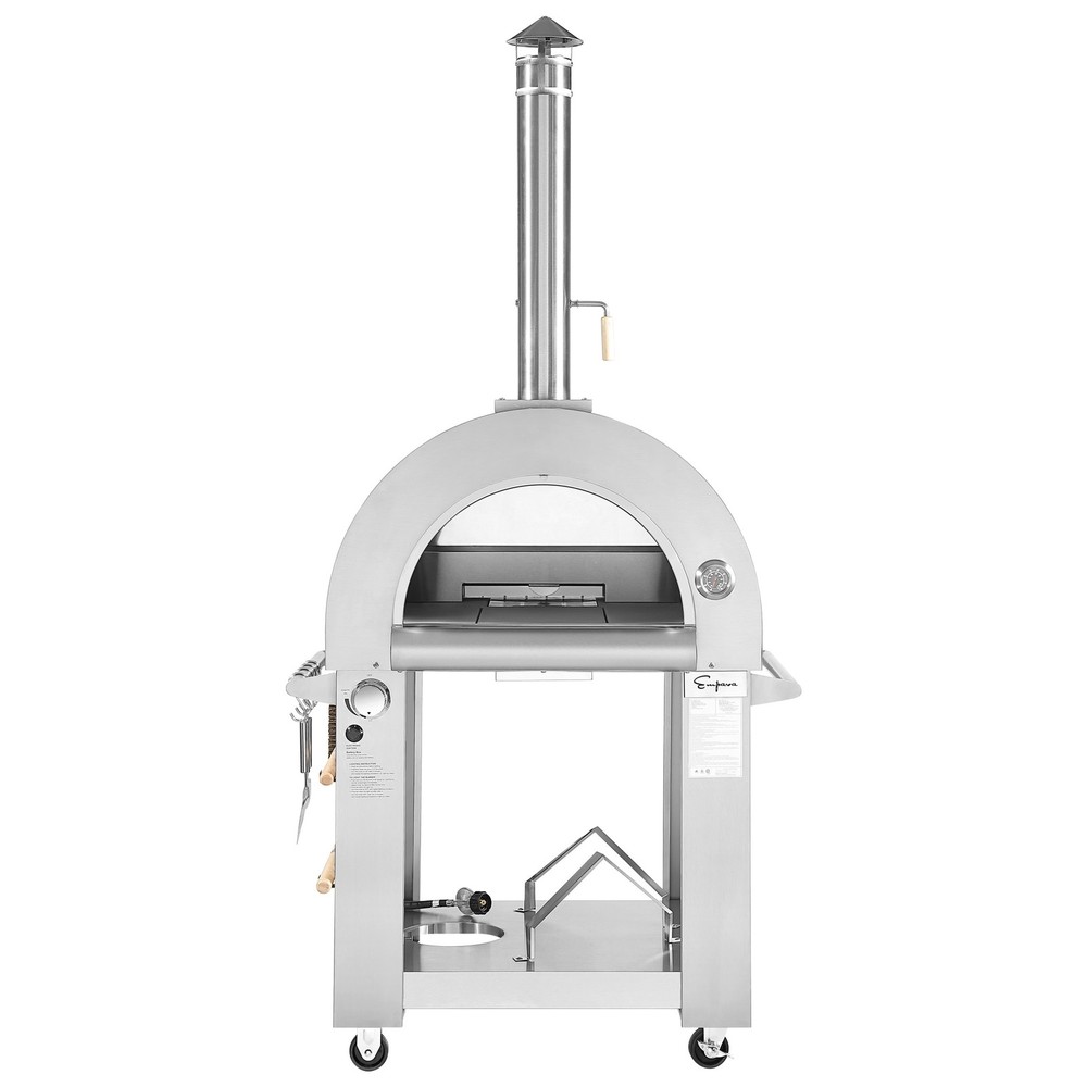 The Empava outdoor pizza oven is a perfect combination of style and practicality. Constructed with 18-gauge stainless steel for exceptional resistance to corrosion and rust. it can reach a higher temperature than conventional ovens, refractory tiles will help to store heat which cooks the food more evenly and quickly. Come with 4-wheels (2 swivel and 2 fixed) so you can easily move and lock the unit in place. You can cook using old world traditional Wood Fire and then simply switch to the modern Gas Fire. During the past years, Empava outdoor pizza oven has become more than a cooking appliance, its also an outstanding piece of furniture to liven up your garden or backyard and to turn it into a terrific cookout venue. With 2-years limited manufacture warranty, Product Dimensions: 39-inch W Free Shipping Over $49.99* Details Empava Outdoor Propane Gas Oven Pizza Maker with Thermometer - Wheels Product Description: The Empava outdoor pizza oven is a perfect combination of style and practicality. Constructed with 18-gauge stainless steel for exceptional resistance to corrosion and rust. it can reach a higher temperature than conventional ovens, refractory tiles will help to store heat which cooks the food more evenly and quickly. Come with 4-wheels (2 swivel and 2 fixed) so you can easily move and lock the unit in place. You can cook using old world traditional Wood Fire and then simply switch to the modern Gas Fire. During the past years, Empava outdoor pizza oven has become more than a cooking appliance, its also an outstanding piece of furniture to liven up your garden or backyard and to turn it into a terrific cookout venue. With 2-years limited manufacture warranty, Product Dimensions39-inch W x 36-inch D x 79-inch H The half-spherical dome shape forms a small pocket, the heat comes from the bottom up to the top of the dome and is then redirected back down to cook pizzas evenly in a few minutes The steel oven body is finished in high-temperature resistant paint, commercial grade refractory bricks will help to store heat and so pizzas cook evenly throughout. The pizza oven with a large mouth to get food in and out easier. 29.5-inch x 25.1-inch of cooking capacity to accommodate a various size of food items. Gas-fired pizza oven preinstalled an LPG gas tank regulator. Compatible with standard size 10KG gas fuel tanks, simply turn the knob to ON and it ignites automatically without needing to light it. A built-in chimney damper and oven thermometer allow for temperature control and monitoring. The 4 wheels turns the pizza oven into a portable oven, so you can move into the garage when not in use. Equipped with 4x s-shape pothooks, pizza cutter, pizza wheel, pizza oven brush, large pizza oven shovel, 1x 5A battery required (not included).