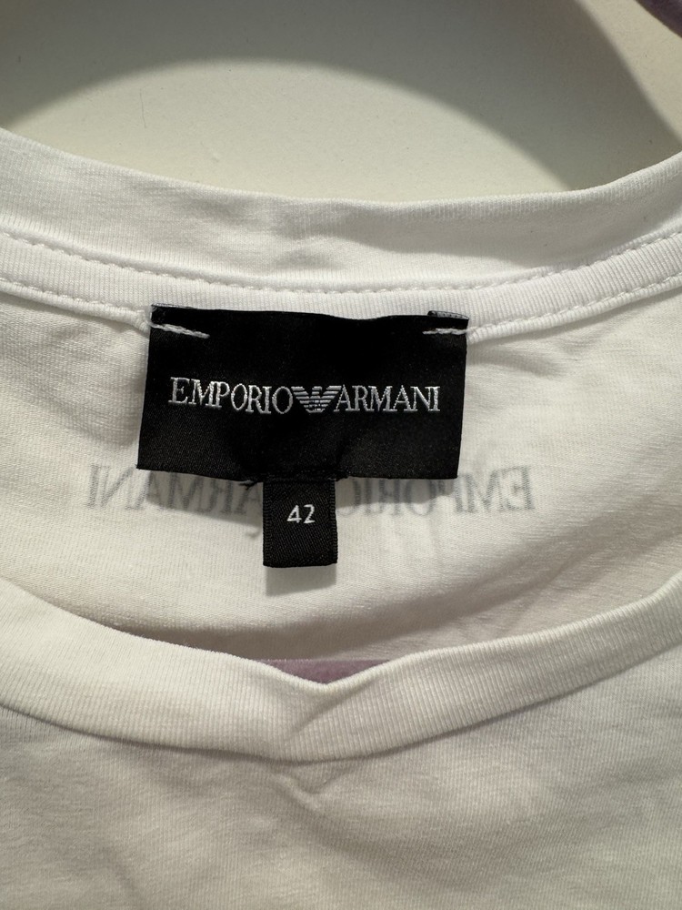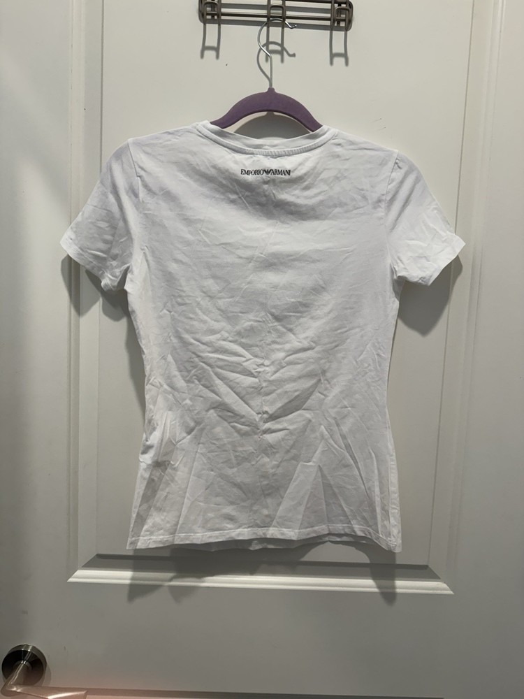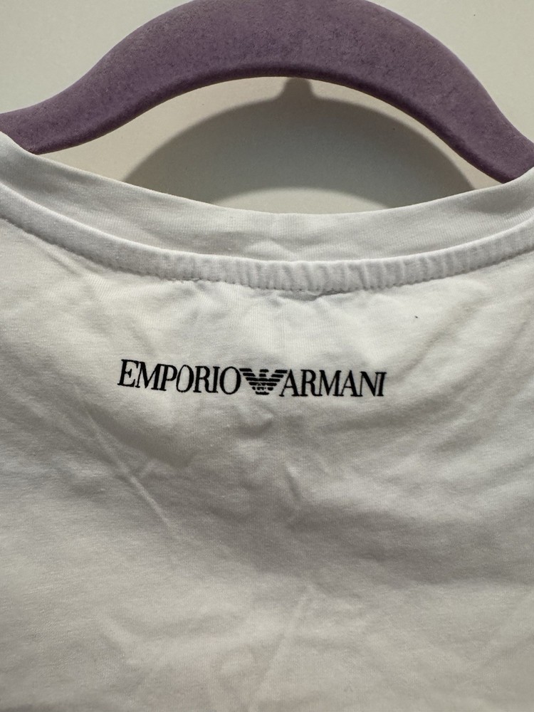 The Emporio Armani big logo t-shirt in white is a stylish and trendy piece of men's clothing. This t-shirt features a bold logo accent on the front, making it a great statement piece. The size small is perfect for a regular fit, and the classic white color makes it versatile for any casual outfit. Made by the prestigious brand Armani, this t-shirt is sure to elevate your wardrobe with its quality and timeless design.