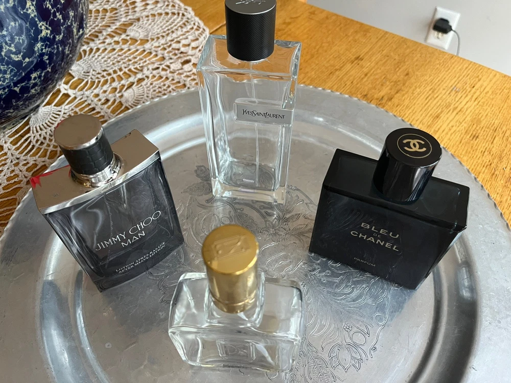 This lot consists of four empty designer glass bottles of Eau de Toilette and Parfum. These stylish and sleek bottles are perfect for storing or displaying your favorite fragrances. The bottles are not handmade and have not been modified, making them a practical and elegant addition to any space. Please take note of all photos.