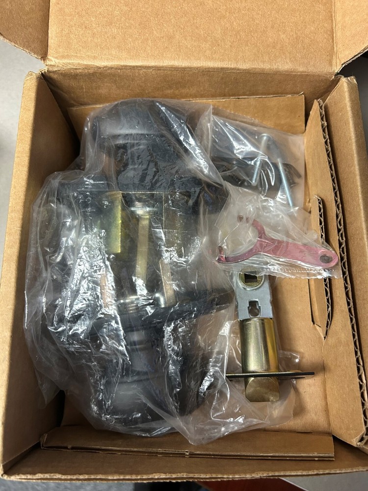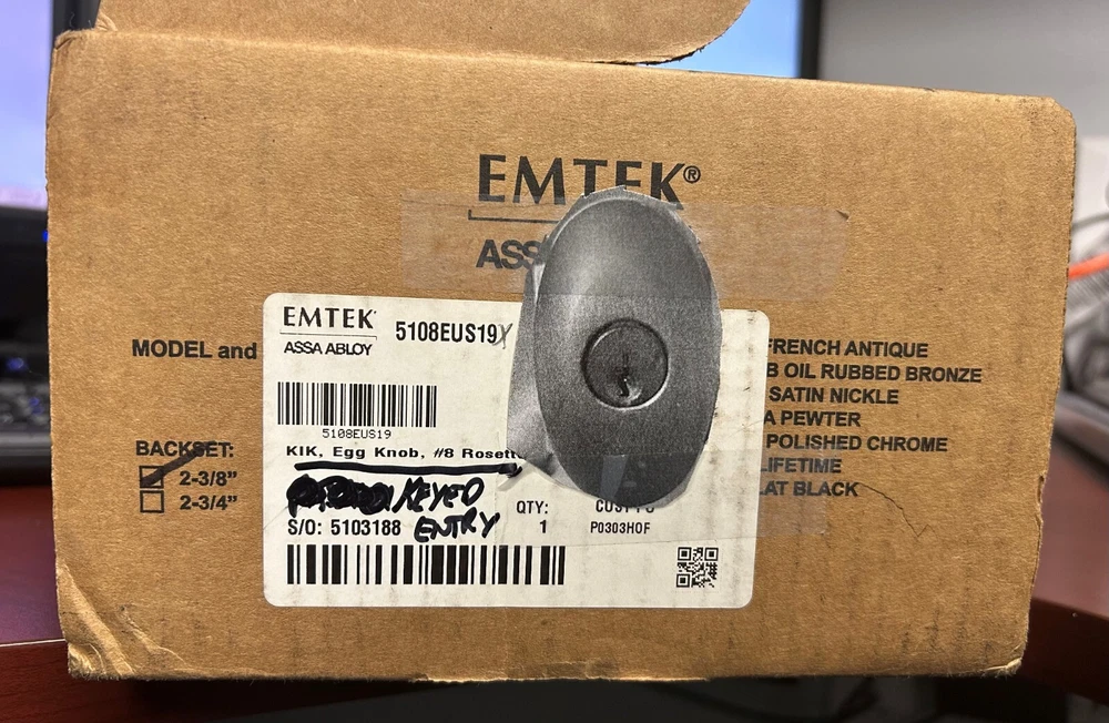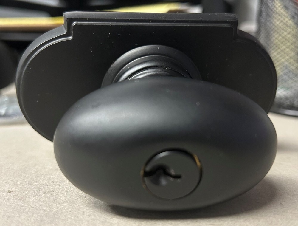 Brand:EmtekFinish:MatteColor:BlackShape:EggModel:5108EUS19Features:Keyed EntryCountry/Region of Manufacture:United StatesManufacturer Warranty:Sellers Offers No WarrantyType:Entry Door KnobSeller Notes:“Never Used - Key is missing and will need to be made - Box may show shelf wear and or dust”