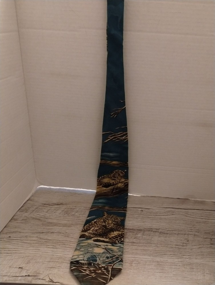 This high-quality silk tie by Endangered Species showcases a detailed leopard design in earthy tones. Crafted in the USA, it offers a distinctive wildlife-inspired style for professionals or collectors. The luxurious silk material exudes elegance for formal or semi-formal attire. • Made from 100% silk • Features a vibrant leopard wildlife design • 56 inches long for a versatile fit • Crafted in the USA for premium quality • Unique green and brown color scheme No visible flaws or damage. Top to bottom = 56 inches. Size: Mens 56 Condition: Pre-Owned