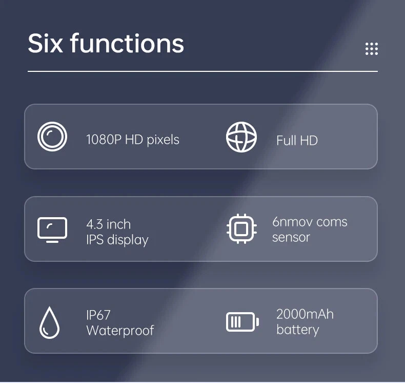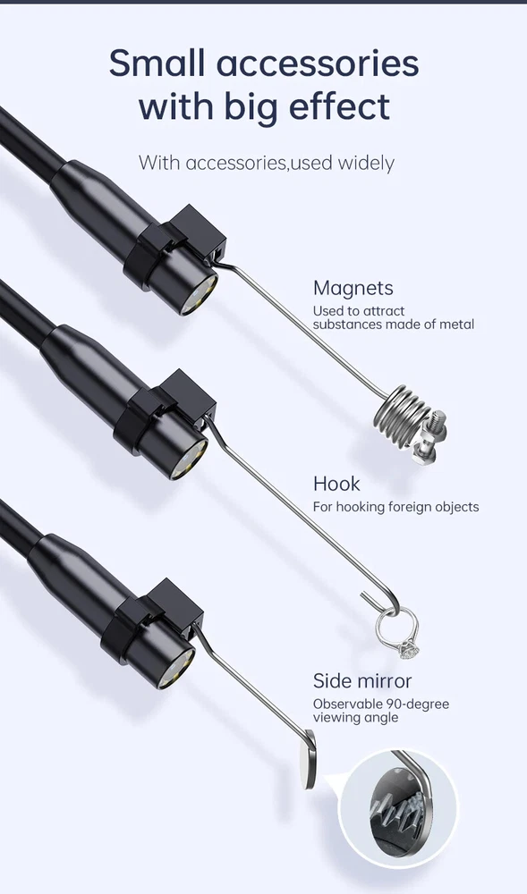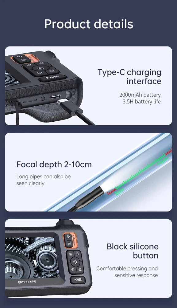 Feature: -Power on and play -Type-C charging interface -4.3 inche screen. -Both front camera and the side camera are up to 1080P resolution -IP67 waterproof camera. -Build-in 2000mAh battery for 3-5 hours working time. -Rigid cable can easily shape what you need. -Equipped with adequate accessories, Hook, Magnet, which can adapt to a variety of environments. Specification: Color: Orange Pixel: 2MP Monitor: 4.3-inch color IPS display Depth of field:2-10cm Camera waterproof: IP67 Viewing Angle:70° Temperature:-10℃-50℃ Battery capacity:2000mAh/3.5h Charge port: Type-C Line length:1/5m Light: 8 adjustable brightness LEDs Certification:CE/RoHS/ISO9001 Package includes: 1X inspection camera 1X charging cable 1X packing box 1X instruction manual 1X hook + magnet + side view mirror 2.7cm short lens is suitable for narrow pipe inspection 1080p HD pixels High definition pixels allow you to see details clearly Long-lasting Battery Life The 2000mAh capacity battery enables the endoscope camera with light to be charged for 2-3 hours and can be used for 2-5 hours. In addition, the convenient USB charging method is adopted to bid farewell to the trouble of difficult charging Waterproof Inspection Camera The endoscope has excellent waterproof performance and can be used in pools, pipes and rainwater, even in bad weather and humid environment, the endoscope can easily do the job. Wide Range Of Application Inspection camera do not require WIFI, mobile phones and APPs, and are ideal assistants for your industrial work. The plumbing camera that perfectly combines convenience, beauty, practicality, waterproof and other properties can make your work easier.Drain pipe cameras can be widely used for mechanical inspection,auto repair, plumbing, housework, wall, chimney or air conditioning maintenance.