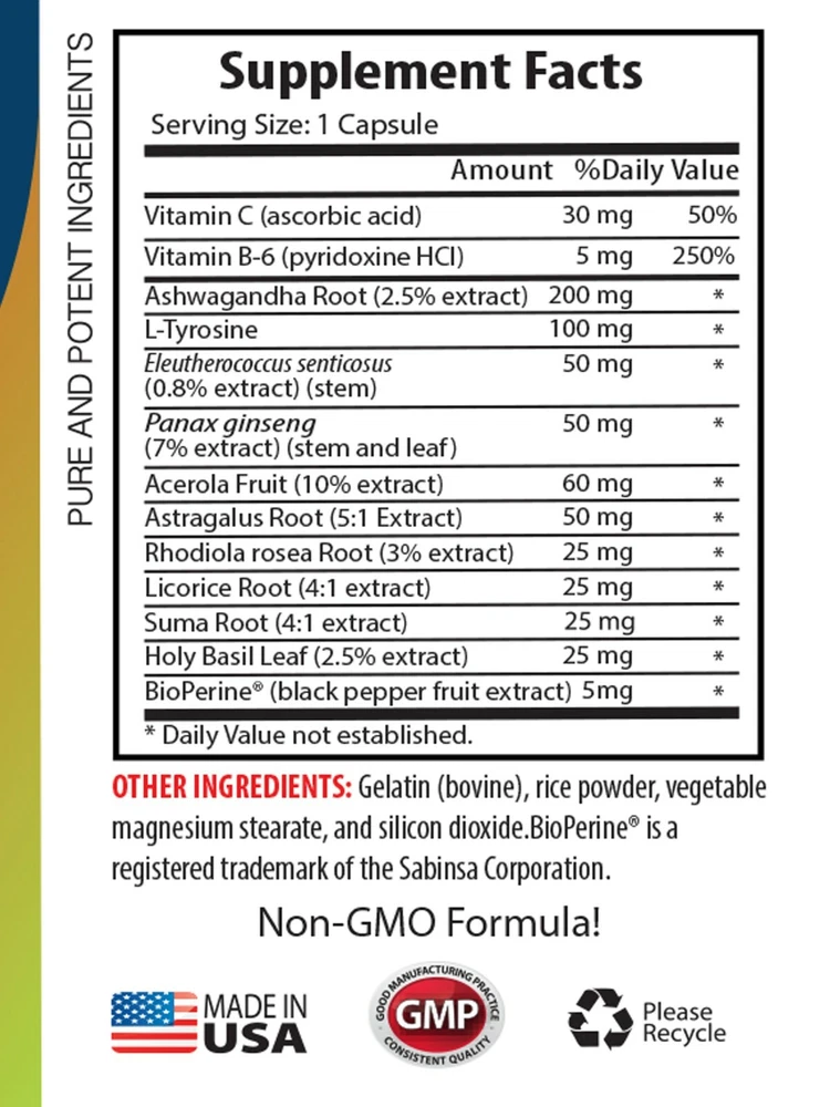 energy-boosting - ADRENAL SUPPORT - brain booster supplements 2BOTTLE ADRENAL SUPPORT PRODUCES ENERGY REINFORCE THE IMMUNE SYSTEM GIVES ANTIOXIDANTS HELPS WITH WEIGHT LOSS LOWERS THE GLUCOSE IN BLOOD REDUCES STRESS HORMONE LEVELS SUPPORTS BRAIN PROCESSES 2 BOTTLE = 120 CAPSULES ADRENAL SUPPORT COMPLEX: Today, modern day stress can wear us down little by little. Adrenal systems need support but often do not receive the attention needed. The carefully formulated ADRENAL SUPPORT is a natural herbal supplement that also include vitamins. Try it out for the support with the following benefits listed ahead. ADRENAL COMPLEX PRODUCES ENERGY: As a stimulant, eleuthero boosts energy levels and contains compounds known to help overcome exhaustion. One study found that eleuthero consumption significantly increased the exhaustion point of swimming mice by lessening the build up of lactic acid and blood urea nitrogen, in addition to increasing fat utilization. ADRENAL COMPLEX REINFORCE THE IMMUNE SYSTEM: Ginseng may strengthen the immune system. Going back to ancient times, Panax ginseng was used to increase energy and stamina and to give the immune system a boost. The antioxidants, especially the phyto-chemical compounds as well as Vitamin C, present in the berry play a key role in making our immune system stronger. It eventually helps us stay away from inflammation. ADRENAL COMPLEX GIVES ANTIOXIDANTS: Acerola is packed with polyphenolic anthocyanidin compounds, such as ferulic acid, quercetin, tannins, chlorogenic acid, cyanidin-3-glycoside, and many more, which offer excellent antioxidant properties. Moreover, the Vitamins A and C in the acerola juice concentrate work as natural antioxidants. All these help in managing infections and cellular aging by making the blood free from harmful free radicals. ADRENAL COMPLEX HELPS WITH WEIGHT LOSS: Being extremely low in fat and calories, acerola helps lose excess body weight. Moreover, it boosts metabolism and provides required nutrition to our cells, which are needed to control obesity and achieve optimum health. So, include acerola in your regular diet today and give yourself a significant health boost! ADRENAL COMPLEX LOWERS THE GLUCOSE IN BLOOD: In several studies, ashwagandha has been shown to lower blood sugar levels. One test-tube study found that it increased insulin secretion and improved insulin sensitivity in muscle cells. Also, several human studies have confirmed its ability to reduce blood sugar levels in both healthy people and those with chronic high blood sugar. Additionally, in one four-week study in people with schizophrenia, those supplemented with ashwagandha had an average reduction in fasting blood sugar levels of 13.5 mg/dL, compared to 4.5 mg/dL in those who received a placebo. ADRENAL COMPLEX REDUCES STRESS HORMONE LEVELS: Cortisol is known as a "stress hormone" because your adrenal glands release it in response to stress, as well as when your blood sugar levels get too low. Unfortunately, in some cases, cortisol levels may become chronically elevated, which can lead to high blood sugar levels and increased fat storage in the abdomen. Studies have shown that ashwagandha may help reduce cortisol levels. In one study in chronically stressed adults, those who supplemented with ashwagandha had significantly greater reductions in cortisol, compared to the control group. Those taking the highest dose had a 30% reduction, on average. ADRENAL COMPLEX SUPPORTS BRAIN PROCESSES: Getting plenty of tyrosine, either through diet or from a supplement, can make a major difference in your brain function. That is because tyrosine is a precursor to some of the most important neurotransmitters in your brain. Your brain turns tyrosine into three major neurotransmitters: Dopamine, Norepinephrine and Adrenaline. By increasing circulation, eleuthero may increase blood flow to the brain, improving mental functions such as memory and concentration. CAUTION: Do not exceed recommended dose. Pregnant or nursing mothers, children under the age of 18, and individuals with a known medical condition should consult a physician before using this or any dietary supplement. These statements have not been evaluated by the Food and Drug Administration. This product is not intended to diagnose, treat, cure, or prevent any disease. GREAT QUALITY PRODUCT