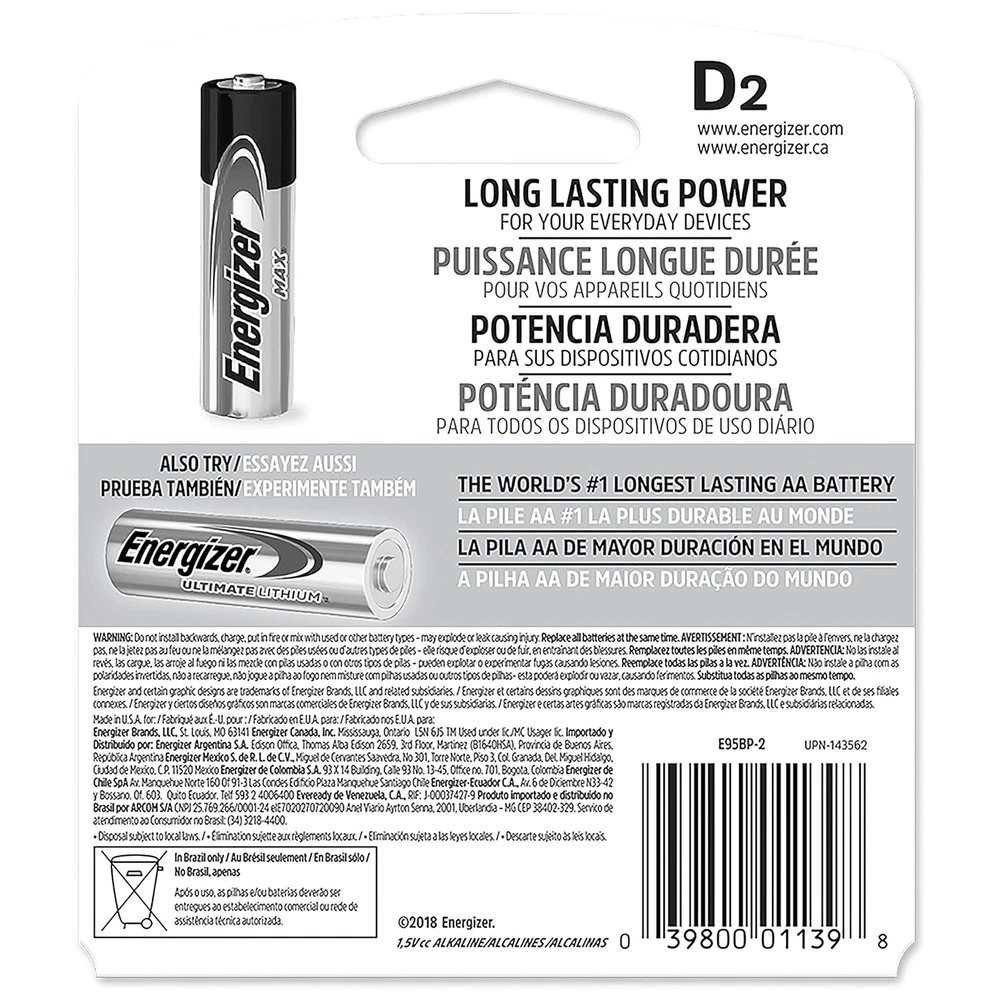 Product Description Energizer MAX D Batteries D Cell Alkaline Lithium General Purpose Batteries 2 Count (Pack Of 2) Energizer MAX D Alkaline Batteries. Energizer provides long lasting power for your everyday devices, whether you need replacement D cell batteries for high-tech flashlights, radios or children's toys. Made to last, not to leak, these Energizer D batteries have a shelf life of up to 10 years, so they're ready to keep your devices operating when you need them most. Each battery pack contains D batteries to keep your supply of backup batteries well stocked. Depend on Energizer MAX D batteries to fuel your everyday electronics, whether you're at home, work or play. Long-lasting power and innovation is what the Energizer MAX family is all about – up to 10-year shelf life for D batteries. Plus, Power Seal Technology is the Energizer innovation that delivers energy you can rely on. Energizer MAX Alkaline Batteries, D, 2 Batteries/Pack Dependable, long-lasting performance in a wide range of devices. Makers of the world's first zero mercury AA alkaline (commercially available since 1991); battery can be disposed with regular household trash. 10-year shelf life. Battery Type: Alkaline; Battery Size: D; Voltage: 1.5 V; Material(s): Alkaline Manganese Dioxide. Long-life alkaline From the Manufacturer Made in U.S.A. 2 pack of Energizer MAX D Batteries, Batteries D Size These alkaline D batteries provide long lasting power for your everyday devices The power you depend on for high-tech D battery flashlights, radios, toys and other high-drain devices MAX D alkaline batteries that hold power for up to 10 years in storage Energizer MAX D batteries are made to last. Not to leak Feel confident knowing you have the long-lasting power and protection you expect from Energizer MAX D battery pack that holds power for up to 10 years in storage D Alkaline batteries that are made to last. Not to leak. Also available in AAA batteries, AA batteries, C batteries and 9V batteries Alkaline batteries provide a long-lasting power source Use in calculators, Pencil sharpeners, cameras, flashlights and more Package Dimension : 3.4 centimeters L x 9.3 centimeters W x 13.0 centimeters H Country of Origin: UNITED STATES