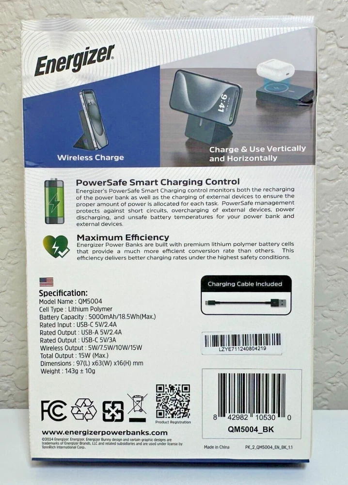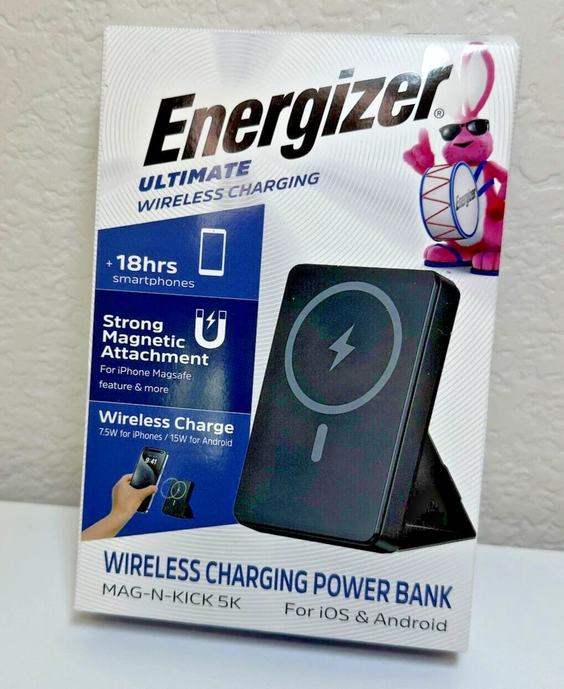 Energizer x Google Cloud Wireless Charging Power Bank Mag-N-Kick iphone/Android QM5004 This Energizer® Mag-N-Kick™ Power Bank magnetically holds to newer compatible phones. It has a convenient fold-out stand to prop up on a desktop surface to keep your hands free. Features: -Strong magnetic attachment (for iPhone Magsafe feature & more) -Wireless charge (7.5W for iPhones, 15W for Android) -Charge & use vertically or horizontally -Includes charging cable Specifications: Model: QM5004 Cell Type: Lithium Polymer Battery Capacity: 5000mAh/18.5 Wh(Max) Rated Input: USB-C 5V/2.4A Rated Output: USB-A 5V/2.4A Raed Output: USB-C 5V/3A Wireless Output: 5W/7.5W/10W/15W Total Output: 15W (Max) Dimensions: 97mm(L) x 63mm (W) x 16mm (H) Brand New, never used, in original box/packaging. Ready to ship!