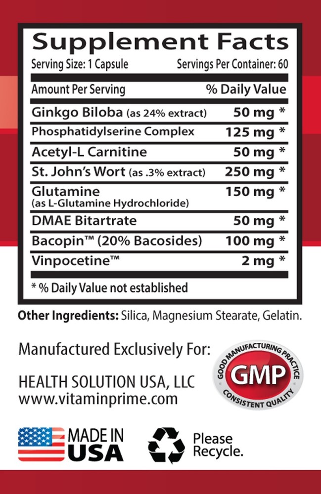 BRAIN & MEMORY BOOSTER ALL NATURAL FORMULA Dietary Supplement Made in USA 2 Bottles 120 Capsules Benefits: Supports mental clarity and improves memory Sharpen Focus Immune Booster Energy booster BRAIN & MEMORY BOOSTER : With this natural supplement you can achieve a faster thinking and clearer thinking brain that is healthy, happy, and overall in wellbeing! In Brain Memory Booster we have: Ginkgo Biloba, Phosphatidylserine Complex, Acetyl-L Carnitine, St. John's Wort, Glutamine, DMAE Bitartrate, Bacopin and Vinpocetine. All these ingredients are natural and will help you on your journey unlocking your highest potential. ALL the ingredients in this natural supplement does good for the immune system . The overall wellness while taking this supplement can be felt especially with a good exercise routine that fits your level of athleticism. Glutamine supplements may help improve immune function and preserve protein stores in the body. Ginkgo Biloba may help you with being calm yet vital and ready to move. It’s even useful for helping to stop a condition characterized by chronically low concentration, confusion, decreased physical performance, fatigue, headaches and mood changes. Ginkgo Biloba is an effective anti-inflammatory that increases antioxidant activity. Ginkgo may appear to be beneficial for eye health since it may improve blood flow to the eyes and fights free radial stress that is not healthy for the cornea, macula and retina. It might be especially beneficial for older adults in preserving vision and lowering UV damage or oxidative stress to eye tissue. Certain studies have demonstrated ginkgo biloba’s ability to increase memory and retention, boost focus, and stimulate creative thinking. It may also appear to have beneficial effects on mood and cognition in postmenopausal women and can help improve similar symptoms. If you have chronical stress that is hindering your quality of life, nervousness, depression or mood swings, ginkgo might be able to help. Research suggests ginkgo biloba may benefit your ability to handle stresses and counteracts the effects of high levels of stress compounds, like cortisol and adrenaline. Known as an adapotgen herb that may naturally raise your ability to cope with trouble and worry, it might be especially helpful for people with general and possibly seasonal sadness. Supplement Facts: Serving Size: 1 Capsule Servings Per Container: 30 Amount Per Serving % Daily Value Ginkgo Biloba (as 24% extract) 50 mg * Phosphatidylserine Complex 125 mg * Acetyl-L Carnitine 50 mg * St. John’s Wort (as .3% extract) 250 mg * Glutamine 150 mg * DMAE Bitartrate 50 mg * Bacopin™ (20% Bacosides) 100 mg * Vinpocetine™ 2 mg * (as L-Glutamine Hydrochloride) * % Daily Value not established Other Ingredients : Silica, Magnesium Stearate, Gelatin. SUGGESTED USE : As a dietary supplement, take one (1) capsule daily, do not exceed two (2) capsules per day. CAUTION : Do not exceed recommended dose. St. John’s Wort may contribute to photosensitivity resulting in skin irritation and redness in persons exposed to strong sunlight or tanning booths. Avoid in patients at risk of bleeding, taking anticoagulants, or with clotting disorders, based on case reports of bleeding. Discontinue use 2-3 weeks prior to some surgical and dental procedures due to increased risk of bleeding. Use cautiously in patients with history of seizure, based on reports of seizure due to Ginkgo seed ingestion. Use cautiously in children. Avoid use in couples who are trying to conceive, based on theoretical reduction of fertility. Pregnant or nursing mothers, children under the age of 18, individuals taking MAO Inhibiting Drugs, or with a known medical condition should consult a physician before using this or any dietary supplement. This product is manufactured and packaged in a facility which may also process milk, soy, wheat, egg, peanuts, fish, and crustacean shellfish. KEEP OUT OF THE REACH OF CHILDREN. DO NOT USE IF SAFETY SEAL IS DAMAGED OR MISSING. STORE IN A COOL, DRY PLACE. *These statements have not been evaluated by the Food and Drug Administration. This product is not intended to diagnose, treat, cure or prevent any disease. PREMIUM QUALITY PRODUCT At Health Solution Prime, We provide the best experience with only premium ingredients