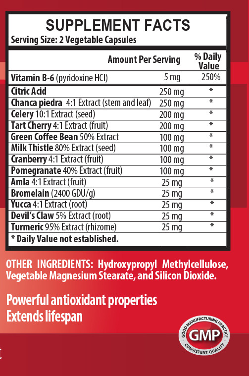 energy boost - URIC ACID FORMULA - KIDNEY SUPPORT 1B - urinary nature cranberry URIC ACID SUPPORT 1425MG 1 Bottle 60 Capsules Supports Healthy Kidney Function Dietary Supplement Health Solution Prime GMP Certified And Made In USA Benefits: Antioxidant Brain Health Urinary Tract Support Anti-Inflammatory Energy Boost Immune Boost Cardiovascular Boost URIC ACID FORMULA: This natural supplement is used for kidney and urinary tract support. The ingredients included are: Vitmain B6, Citric Acid, Chanca piedra, Celery, Tart Cherry, Green Coffee Bean, Milk Thistle, Cranberry, Pomegranate, Amla, Bromelain, Yucca, Deil's Claw, and Turmeric. SUPPORT BRAIN FUNCTION: Milk thistle has also been used to fight off a variety of aging effects including cognitive decline. It may have a positive effect on the central nervous system. A 2015 study found that milk thistle improved resistance to oxidative stress. Oxidative stress is caused by an imbalance in free radicals and antioxidants and can contribute to poor brain health. Another study found that milk thistle helped learning and memory impairment. ANTIOXIDANTS FOR YOUR HEALTH: Chanca piedra has been evaluated for antioxidant activity and it can help with high blood pressure and high blood sugar. The high phenolic content of chanca piedra has shown antioxidant activity, which has been found to support balanced blood sugar and normal blood pressure. This has created excitement about the potential of chanca piedra during times of distress. In one study researchers noted that chanca piedra engages an enhanced antioxidant defense system. URINARY TRACT SUPPORT AND HEALTH: Because celery helps to reduce uric acid and stimulates urine production, it’s beneficial for fighting bad bacteria within the digestive tract. Similarly to cranberries that are known for fighting poor urinary tract conditions, celery can help, as well as bladder conditions and kidney problems. Citric acid also helps to keep the kidneys in a proper functioning state. ANTI-INFLAMMATORY BENEFITS: Research shows that the antioxidants in tart cherry juice can reduce inflammation. A 2004 study found that cherry juice supplements can reduce inflammation and pain-related behavior in test subjects, showing promise as an aid against swelling in humans. Tart cherry juice's anti-inflammatory effects may help reduce symptoms of inflammatory conditions. SUPPORT YOUR ENERGY LEVELS: Green coffee beans included in this product will increase your energy levels due to caffeine and also because of its immune boosting properties. Due to all the benefits of our natural ingredients in this supplement such as supporting digestion, promoting blood flow, decreasing inflammatory stresses it is evident that the body will have more efficiency in producing energy and supporting you in your everyday life. IMMUNE SYSTEM BOOSTER: Like all fruits and vegetables, cherries pack a powerful antioxidant and antiviral punch. Flavonoids, a type of antioxidant in cherry juice, are made by plants to fight infection. Research shows that these chemicals can have a significant impact on immune system function. Tart cherry juice is rich in a variety of nutrients that may strengthen the immune system. BOOST YOUR CARDIOVASCULAR HEALTH: The study showed that tart cherries activate compounds that break down peroxide. These factors help the body maintain and promote a healthy cardiovascular system. Green Coffee beans also work for a healthier cardiovascular system. It keeps LDL "bad cholesterol" levels in check while also lowering the blood pressure lessening the stress on the heart. Serving Size: 2 Vegetable Capsules CAUTION: KEEP OUT OF THE REACH OF CHILDREN. DO NOT USE IF SAFETY SEAL IS DAMAGED OR MISSING. STORE IN COOL DRY PLACE Do not exceed recommended dose. Pregnant or nursing mothers, children under the age of 18, and individuals with a known medical condition should consult a physician before using this or any dietary supplement. *These statements have not been evaluated by the Food and Drug Administration. This product is not intended to diagnose, treat, or prevent any disease. PREMIUM QUALITY PRODUCT At Health Solution Prime, We provide the best experience with only premium ingredients