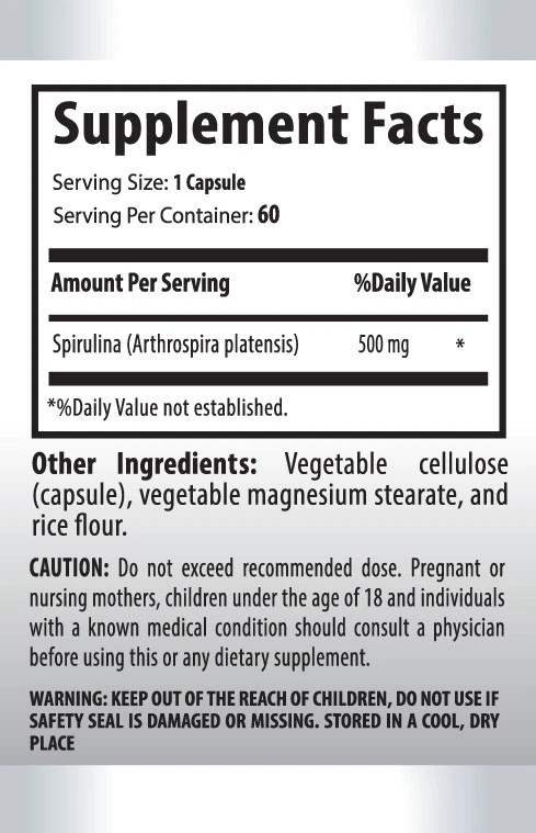 GREEN TEA EXTRACT & SPIRULINA Beneficial for blood vessel health Obesity and weight loss Health promoting properties Powerful Antioxidant Improvement of health function Support Memory performance Improve the process of brain aging Strengthen the immune system Made In USA COMBO GREEN TEA – SPIRULINA Green tea is well-known of its benefits. It has been implicated in benefiting almost every part system in the body. It beneficial for blood vessel health, obesity and weight loss. Spirulina often gets classified as an herb because of its amazing health promoting properties, but it's actually a blue-green algae that's found in pristine freshwater lakes, ponds, and rivers. It is most commonly recognized as one of the world's most nutritionally complete superfoods, as it offers health benefits to practically every part and bodily function. Antioxidant Properties Green tea extract is, first and foremost, a powerful Antioxidant. Green tea may be beneficial for improvement of health function and memory performance. This herbal supplement may improve the process of brain aging and deal with , and memory improvement. Green Tea has been found to reliably increase the presence of catechins in the blood and overall antioxidative potential of the blood. Modulates the Immune Response Spirulina has long been revered for its ability to strengthen the immune system. Because it actively promotes the body function and regeneration, it helps to boost the immune response and increase the recovery process. Spirulina fortifies one's immune system, leaving the person less likely to experience any influences. Green tea’s benefits are due to its effects on the immune system. Green tea extract has been shown to push the immune system. Enhances Memory, Attention, and Learning Green tea extract is linked to better mood, memory, and other cognitive functions. The green tea works synergistically with caffeine and l-theanine to improve memory, attention, and learning. Taking this herbal supplement may better attention, memory, and information processing. This supplement works is by raising levels of acetylcholine that is responsible for memory and learning. Assists in Keeping Eyes Healthy Spirulina is an excellent supplement for those looking to improve their eye health. This blue-green algae is very rich in vitamin A, and this vitamin is exceptionally important for healthy eyes. For this same reason, eating more carrots has long been recommended to those looking to improve their eye health, but spirulina actually has ten times the vitamin A concentration gram per gram of carrots. Spirulina can benefit your eye health in many ways, one of the most significant ways comes from its vitamin A content. Deal with Stress and Eating a diet rich in polyphenols like green tea extract is one of the best ways to support a healthy brain and protect against problems as well as with and stress. One way it reduces stress and is by normalizing activity of the calming GABA. It improves brain activity, calming you down when you are overstimulated, overwhelmed, and stressed out. It can lower your heart rate and help you maintain proper blood pressure levels when under stress. Helps Improve the Digestive System Spirulina eases the passage of unwanted elements through the digestive system, thereby reducing stress on the entire system. It also promotes healthy bacteria in the digestive system, and helps to improve the absorption of dietary nutrients. There is increasing interest in the potential role of green tea extract in fat Metabolism and its influence on health and exercise performance. Our herbal supplementation may be beneficial for improving the digestion and increase Metabolism. For Brain Function Green tea extract may help to support the brain and inhibits the activity of enzymes associated with the brain functions. It promotes new brain cell creation in the parts of the brain. It may also prevent the brain health. L-theanine raises levels of the neurotransmitters serotonin, dopamine, and GABA, thus improving recall, learning, motivation, and positive mood. L-theanine and caffeine together can help you perform better on cognitively demanding tasks than caffeine alone, yet will leave you less wired. Supplement Facts Serving Size: 1 Capsule Servings Per Container: 60 Green tea leaf extract 300 mg * (Camellia sinesis) (Standardized to 50% [150 mg] Catechins) OTHER INGREDIENTS: Gelatin, Water (Capsules), Rice Powder, Cellulose, Magnesium Stearate and Silica. CONTAINS: No Sugar, Salt, Dairy, Yeast, Wheat, Gluten, Corn, Soy, Preservatives, Artificial Colors or Flavors. SUGGESTED USE: As a dietary supplement, adults take one (1) capsule, two (2) times daily with meals or, as directed by a health care professional. Supplement Facts Serving Size: 1 Capsule Servings Per Container: 60 Spirulina (Arthrospira platensis) 500mg * OTHER INGREDIENTS: Vegetable cellulose (capsule), vegetable magnesium stearate and rice flour. SUGGESTION USE: 1 capsule taken 1 to 2 times daily preferably with meals or as directed by a healthcare professional. KEEP OUT OF THE REACH OF CHILDREN. DO NOT USE IF SAFETY SEAL IS DAMAGED OR MISSING. STORE IN A COOL, DRY PLACE. *These statements have not been evaluated by the Food and Drug Administration. This product is not intended to diagnose, treat, cure, or prevent any disease. GREAT QUALITY SUPPLEMENTS