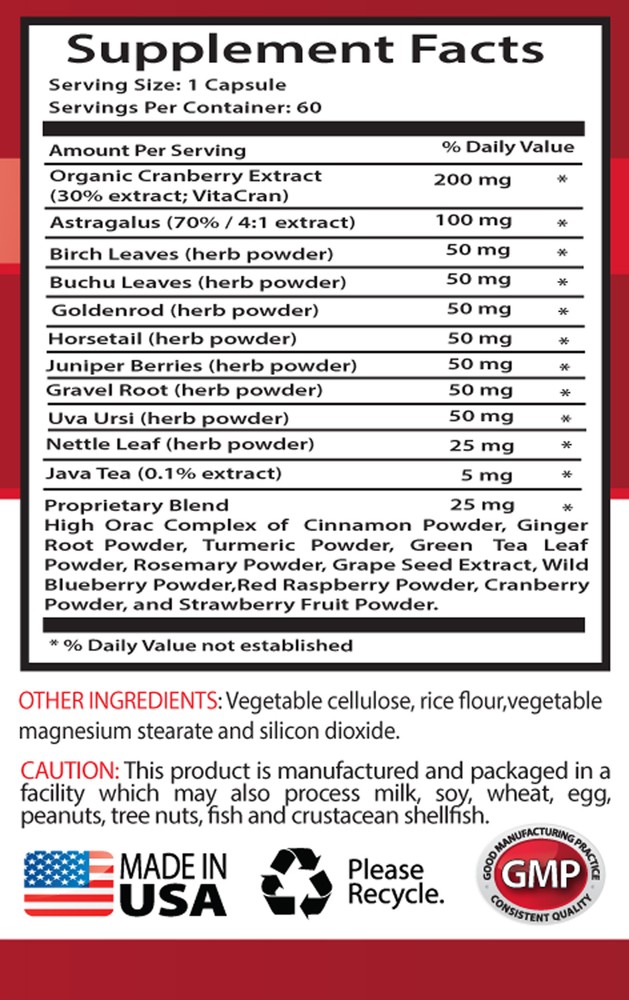 KIDNEY SUPPORT FORMULA promote kidney function improve bladder conditions muscle support supplement Immune system health help improve vessel walls improve body function boost brain health 2 BOTTLES Supplement for Kidney Health The kidneys play a pivotal role in clearing the body as well as helping to regulate blood pressure. Healthy kidney or kidney function is beneficial for body functioning. You may include some of the best supplements and foods in your daily routine to support and maintain kidney health. This herbal supplement for Kidney support all high in vitamin C. Buffered vitamin C supplements, available in health food stores, are also helpful in maintaining kidney health. Bladder and Urinary Tract Health Goldenrod has a history for use with the bladder and urinary system. The beneficial qualities support and tone the urinary system and bladder making it useful for Urinary tract health. Taking this Kidney Support Formula on regular basis may promote urinary and bladder conditions. It is a kidney support health, so it both nourishes and restores balance to the kidneys. Uva Ursi Benefits Uva ursi is a plant species of the genus Arctostaphylos. The leaves of this small shrub have been used as an herbal folk supplements for centuries as a mild that may improve of urinary tract . Uva ursi may help to reduce many bladder problems and improve urinary tract health. As a nutritional supplement and muscle support supplement, Uva ursi soothes, strengthens, and tightens numerous body tissues. Boosts Immune System The flavonoids found in nettle tea, along with the high concentration of vitamin C, all make this beverage an effective Immune system booster. Antioxidants are substances that can may promote metabolism. By freeing up your Immune system, nettle tea can work as your first line of Immune health. Taking our natural nettle supplement may help build up immunity. Turmeric Antioxidant Capacity of The Body The main reason Antioxidants are so beneficial, is that they may provide and supply our bodies with essential fatty acids. Curcumin happens to be a potent Antioxidant that can neutralize influence on our body. But curcumin also boosts the activity of the body's own Antioxidant enzymes. This natural Kidney Support supplement may stimulates the body's own Antioxidant mechanisms. Curcumin has powerful Antioxidant effects. Protects the Cardiovascular System The flavonoids present in astragalus are Antioxidants that help improve vessel walls. Astragalus extract in combination with other herbal ingredients may show improvements in heart conditions. Astragalus may show its ability to control blood pressure. Astragalus may promote heart muscle functioning by regulating calcium in the heart. Kidney and Gallbladder Health Stinging nettle can have a diuretic effect on some people, so if you have kidney or bladder issues. Stinging nettle has long been known due to its natural and beneficial compounds, but it also support the kidneys in a different way. Stinging nettle has some qualities, meaning that it can help improve the kidney and gallbladder health and improve numerous conditions. Stinging nettle helps to improve body function and provide many health benefits. Curcumin for brain function The neurons are capable of forming new connections, but in certain areas of the brain, they can also multiply and increase in number. Curcumin may increase brain healthy functioning. There is also the possibility that it could help improve memory and make you smarter. Curcumin boosts brain health, has positive effects on the Immune system and improvement of the function of the brain. KIDNEY SUPPORT FORMULA. Supplement Facts Serving Size: 1 Capsule Servings Per Container: 60 Organic Cranberry Extract (30% extract; VitaCran) 200 mg Astragalus (70% / 4:1 extract) 100 mg * Birch Leaves (herb powder) 50 mg * Buchu Leaves (herb powder) 50 mg * Goldenrod (herb powder) 50 mg * Horsetail (herb powder) 50 mg * Juniper Berries (herb powder) 50 mg * Gravel Root (herb powder) 50 mg * Uva Ursi (herb powder) 50 mg * Nettle Leaf (herb powder) 25 mg * Java Tea (0.1% extract) 5 mg * Proprietary Blend High Orac Complex of Cinnamon Powder, Ginger Root Powder, Turmeric Powder, Green Tea Leaf Powder, Rosemary Powder, Grape Seed Extract, Wild Blueberry Powder, Red Raspberry Powder, Cranberry Powder, and Strawberry Fruit Powder. OTHER INGREDIENTS: Vegetable cellulose, rice flour,vegetable magnesium stearate and silicon dioxide. SUGGESTED USE: 1 capsule taken 1 to 2 times daily preferably with meals or as directed by a healthcare professional. CAUTION: This product is manufactured and packaged in a facility which may also process milk, soy, wheat, egg, peanuts, tree nuts, fish and crustacean shellfish. Do not exceed recommended dose. Pregnant or nursing mothers, children under 18, and individuals with a known medical condition should consult a physician before using this or any dietary supplement. If you are taking a birth control pill, are considering becoming pregnant or have questions about the advisability of taking this product, consult your physician prior to use. Supports *These statements have not been evaluated by the Food and Drug Administration. This product is not intended to diagnose, treat, cure or prevent any disease. PREMIUM QUALITY PRODUCT At Health Solution Prime, We provide the best experience with only premium ingredients