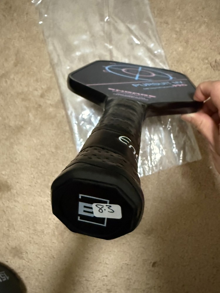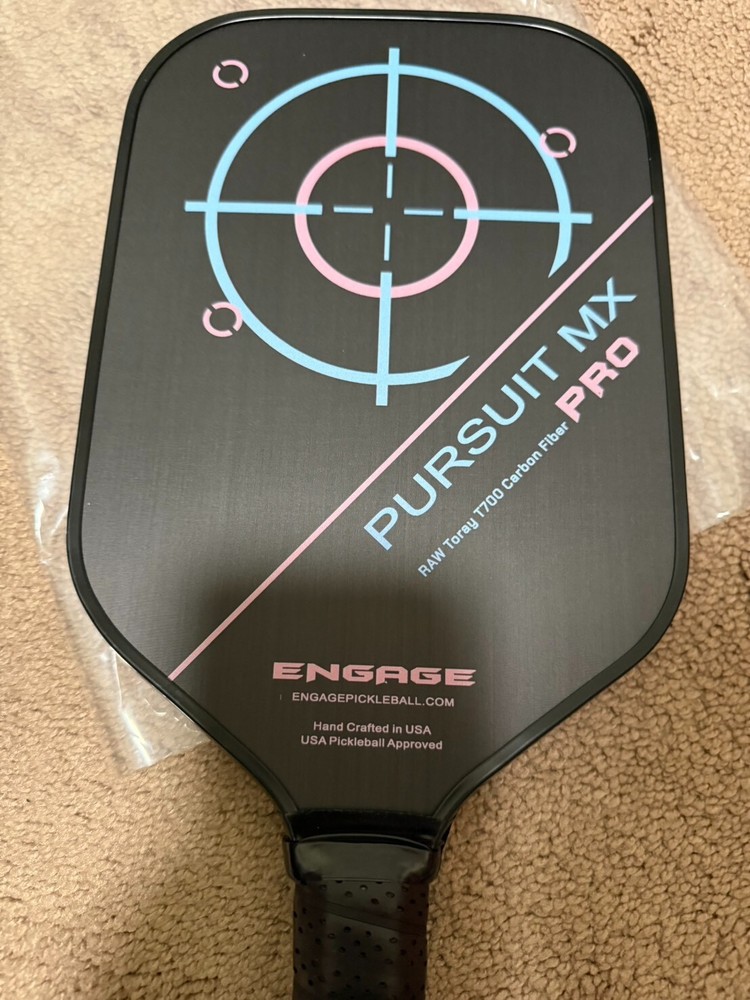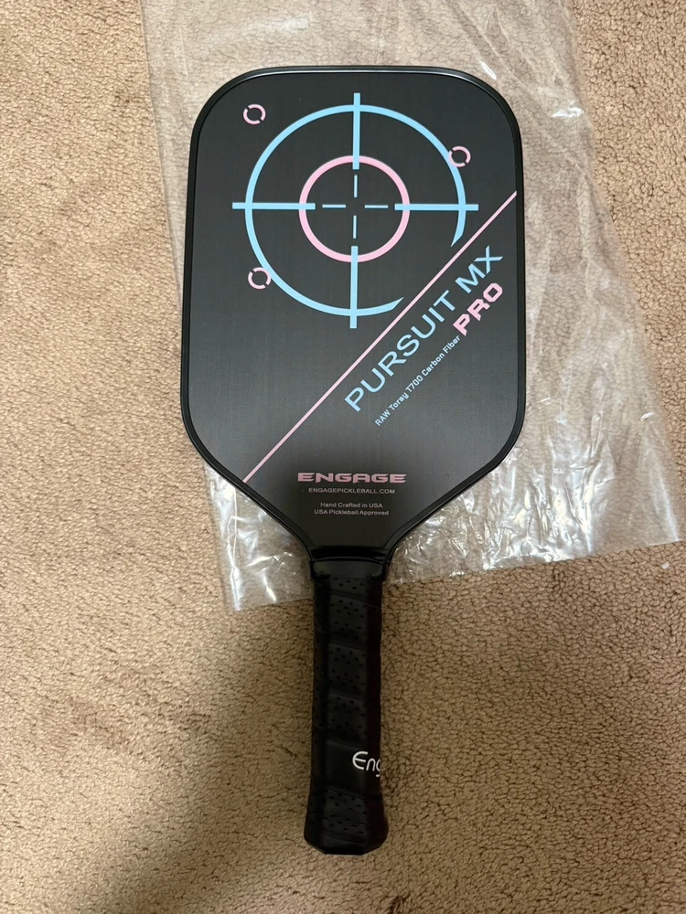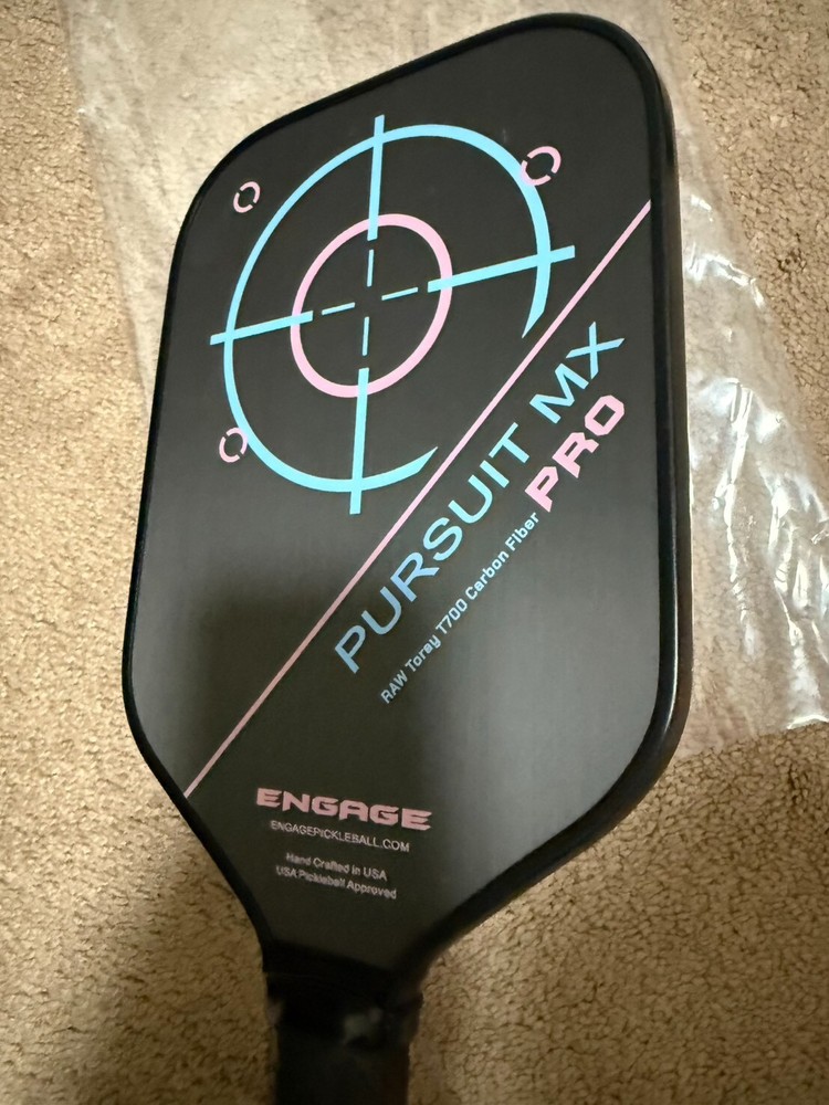 This is for a brand new Engage Pursuit Pro MX Raw T700 Carbon Fiber Elongated Jessie Irvine limited edition 8.3 oz. Will ship via either UPS/USPS. All sales are final Technologies: Raw Toray T700 Carbon Fiber and Inner Application Layer - Proprietary layering and bonding technology (with the Raw T700 exposed outer surface) for maximum texture and friction between the ball and surface for unmatched spin. Vortex Barrier Edge Technology - Next generation composite injected into the outer cells for weight distribution and vibration control. Uniform Guard Technology - Bonding of the edge guard and paddle for improved force distribution. Counter Balance Technology - Lowering the balance point of the paddle for quicker hand speed and less arm fatigue. Control Pro Black Polymer Core - Proprietary innovation that creates the softest core in the market that controls the rate of paddle compression and rebound rate. Variable Release Technology (MX version only) - Paddle won’t flex while swinging slow (for more control) but the faster you swing the more it will flex (providing additional power and spin when you need it). Specifications: Colors: Jessie Irvine Signature Shape: M X (16.5" x 7.5") with a 5.75" handle length Core Thickness: 1/2" thick core for maximum control and feel (with power)