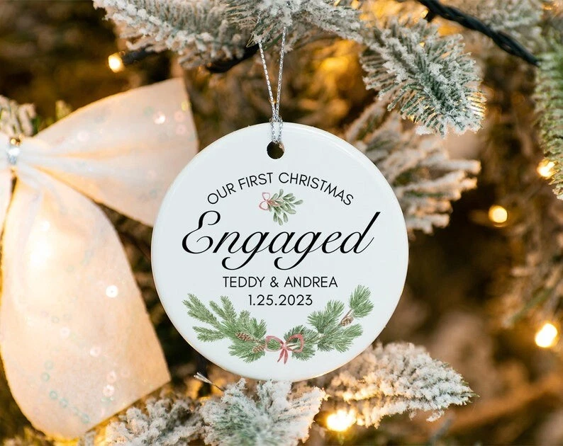Engaged Christmas Ornament - Custom Engagement Keepsake Burgundy - Personalized First Christmas Engaged - Engaged 2024 OR-0046 If you need to buy more, please inbox us We have two material options (Ceramic & MDF), please read the product description as below to choose your favorite options. MDF Ornaments 1-sided design. Print type: Sublimation printing. Crafted from durable MDF with a high-gloss plastic finish so your designs last a lifetime. Shapes: Round, star, heart and oval . Product Dimensions: Circle & Heart, 2.75” tall; Oval & Star, 3.25” tall. Ships with a festive gold cord for easy hanging. CERAMIC Ornaments 125" (3mm), 2.75" height (circle), thick high-quality porcelain One-sided print Hole for the hanging string Gold-toned string included Available in 4 shapes - Snowflake, Star, Heart and Circle The height of the hole can slightly deviate Shipping, Return and Refund Policy On average, merchandise is produced and shipped from our facility 2-4 business days after purchase. Standard Shipping: 5-7 working days for USA. Please contact us if you have any dissatisfaction with the item you buy so that we give you the solution. It is easier for us to handle your issue if you send us the proof like an image. We can replace another within 30 days without fee if the item is defective, damaged, or an error is made on our end.