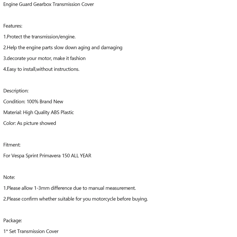 Gas Tank Fuel Cock Valve Petcock fit for Yamaha YZF R1 XJ900 YZ80 4KM-24500-00 18.76 USD Free shipping For BMW E46 323i 325i 328i 330i M3 305 02-06 LHD Center Console Trim Base BE F13 70.61 USD 74.33 USD Free shipping 5% off 7" LCD Digitizer Touch-Screen C070EAT01.0 For Uconnect Radios VP2 2018-2022 83.4 USD 87.79 USD Free shipping 5% off 6L80 6L90 Transmission Rebuild 1-2-3-4 3-5-Reverse Clutch Seals Pack O-Rings 20.89 USD 21.99 USD Free shipping 5% off NEW Set of 4 Door Handles Chrome For Chrysler 300 & 300C 2005-2010 4589009AH USA 74.87 USD Free shipping 1pcs Fuel Injectors 7561277 13537561277 Fit BMW N45 N46N E93 320I 2.0L 17.87 USD Free shipping Oil Cooler Filter Housing Seal Gasket O-ring 21304-JA11A For Nissan Armada Titan 10.68 USD Free shipping CARBURETOR CARB REPAIR REBUILD KIT FOR GY6 125CC Aprilia PD24J BMW ATV Go Kart 15.79 USD Free shipping M18X1.5 Female Aluminum Weld On Fitting Bung US 11.2 USD 11.79 USD Free shipping 5% off CNC Adjustable Kickstand Side Stand Fit HONDA CBR 600 1000 RR 600RR 1000RR 41.86 USD Free shipping Car Windscreen Window Rear Wiper Arm Wiper Blade Set for VW Golf 5 MK5 2004-2008 17.87 USD Free shipping NOX Sensor 8R0907807G 8R0907807Q For Audi Q5 8R/8RB 2008-2018 126.15 USD 132.79 USD Free shipping 5% off A Fantastic Shop Send us a message Our Store Seller Profile Feedbacks Save this seller Contact Engine Guard Gearbox Transmission Cover For Vespa Sprint Primavera 150 Red US Engine Guard Gearbox Transmission Cover Features: 1.Protect the transmission/engine. 2.Help the engine parts slow down aging and damaging 3.decorate your motor, make it fashion 4.Easy to install,without instructions. Description: Condition: 100% Brand New Material: High Quality ABS Plastic Color: As picture showed Fitment: For Vespa Sprint Primavera 150 ALL YEAR Note: 1.Please allow 1-3mm difference due to manual measurement. 2.Please confirm whether suitable for you motorcycle before buying. Package: 1* Set Transmission Cover About US About Our Items We strive to describe all items accurately and thoroughly, with the utmost care and attention to detail. However, to ensure a mutually satisfactory transaction, we kindly ask for your assistance in thoroughly reviewing the item description and photos, and addressing any questions before placing a bid. Customer Satisfaction We stand behind our commitment with exceptional service, a 100% money-back guarantee, and a dedication to customer satisfaction. I am readily available to address any inquiries or concerns you may have, both before and after your purchase. Our aim is to ensure your shopping experience is enjoyable and that you're delighted with your purchase. Feedback Your feedback is crucial to our business's success. If you're satisfied with your purchase and the service you received, we would greatly appreciate your positive feedback, along with an overall Detailed Selling Rating (DSR) of 5. Please take a moment to leave us positive feedback. Our eBay account is set up to automatically reciprocate positive feedback once yours is received. If you're considering leaving neutral/negative feedback or opening an eBay/PayPal case, we encourage you to reach out to us immediately. We're committed to resolving any issues to the best of our ability. Shipping Parcel will be shipped using Standard shipping method. For security purposes, items will be shipped exclusively to the confirmed address on Paypal. Please ensure your Shipping address is up to date before proceeding with payment. Estimated delivery time within the United States ranges from 3 to 10 business days, depending on your location. Returns We accept returns within 60 days from the date the buyer receives the item. If the item is found to be defective upon receipt, the customer has up to 30 days from the date of receipt to request an exchange for a new item or a refund. For returns due to a change of mind, we accept items in their original selling condition. However, if the package has been opened due to a mistaken order, it does not qualify for our return policy. Please note that the buyer is responsible for covering the cost of return postage. If you encounter any issues, please reach out to us via eBay message, and we'll respond within 24 hours. Unpainted ABS Headlight Guard Bracket Fairing For YAMAHA MT09 FZ09 2017-2020 44.87 USD Free shipping Red Flames Injection Fairing Kit Plastic Fit for Kawasaki ZX10R 2006 2007 US 299.0 USD Free shipping Injection ABS Plastic Bodywork Fairing Fit for Kawasaki Z650 2017-2019 V1 284.08 USD 299.03 USD Free shipping 5% off Chrome Side Panel Storage Box Plating Trim Strip For BMW K1600GTL 2011-2018 ⏳ 65.35 USD 68.79 USD Free shipping 5% off Windshield Plate Side Panels for BMW R1200GS ADV 2014-2020 R1250GS ADV 19-21 QL 23.79 USD Free shipping Fork Lower Leg Deflectors Shield Cover For Touring Electra Glide FLHT 2000-13 TU 26.79 USD Free shipping Fairing Kit Bodywork ABS fit For Ducati 1098 2007-2012 #4 359.0 USD Free shipping Unpainted Rear Fairing Rear Tail Cover Trim For Suzuki GSXS GSX-S 750 2017-2024 95.55 USD 100.58 USD Free shipping 5% off Gas Fuel Oil Tank Pad Protector Cover For BMW R1250GS R1200GS 2014-2022 13.51 USD Free shipping NEW Injection Fairing Kit Bodywork Plastic ABS For BMW M1000RR S1000RR 2019-2022 609.78 USD Free shipping Windshield Headlight Bezel Upper Fairing fit For Indian Scout sixty 2015-2022 178.69 USD Free shipping Frame Fairing Cowl Guards Radiator Cover For BMW R1250GS ADV 2018-2023 Carbon 73.14 USD 76.99 USD Free shipping 5% off