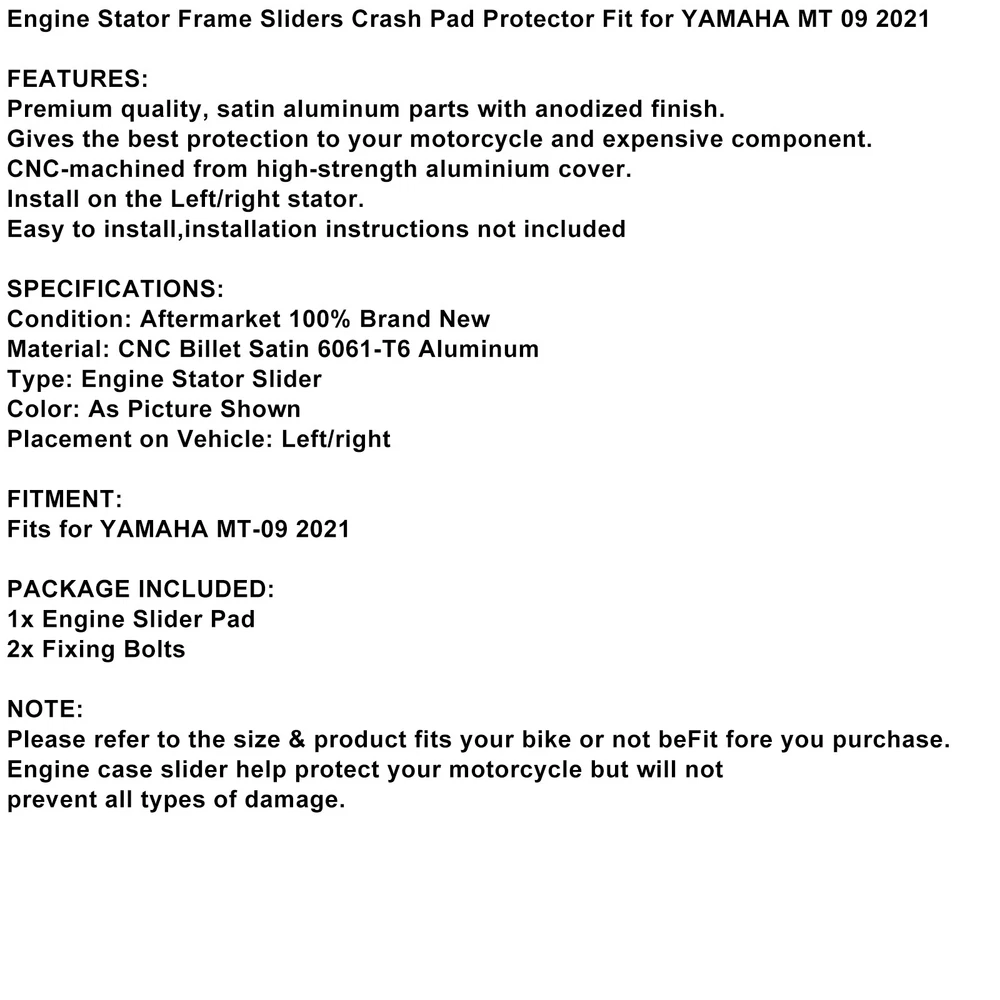 Air Filter Cleaner For Motorcycle Sportster 1200 Custom XL1200C Low XL883L USA 28.13 USD Free shipping ABS Anti-Lock Brake Pump Assembly 57110-T2F-L22 for Honda Accord Sport 2.4L 2014 582.79 USD Free shipping CNC Adjustable Kickstand Side Stand Fit HONDA CBR 600 1000 RR 600RR 1000RR 35.99 USD Free shipping 50x Small M5 5mm Motorcycle Fairing Spring Clips Speed Spire Nuts Clip U Nut 16.79 USD Free shipping Gbox Detent Kit for Porsche Transmission 996 997GT3 Boxster S Fixes 2ND Gear WR 18.99 USD Free shipping All Three Catalytic Converter Flex Y-Pipe Fits For Nissan Maxima 3.5L 2009-2014 175.87 USD Free shipping 67mm Cylinder Jug Top End Piston Gaskets Kit for Yamaha YFM200 Moto 4 1985-1989 97.99 USD Free shipping FUEL PUMP FUSE RELAY fit for Yamaha YZF R1 R6 FZ1 Fazer FZ8-N Naked 5VK-81950-40 28.99 USD Free shipping 6L80 6L90 Transmission Rebuild 1-2-3-4 3-5-Reverse Clutch Seals Pack O-Rings 21.99 USD Free shipping 0B5 DL501 Transmission Valve Body For Audi VW Porsche 629.99 USD Free shipping 50cc Cylinder Piston Gasket Kit For Yamaha YW50F YW50FX Zuma 50F 4T 2012-2019 58.7 USD 61.79 USD Free shipping 5% off Pulsing Electrical Coil AM105573 AUC15118 For John Deere 325 335 345 425 445 455 24.92 USD Free shipping A Fantastic Shop Send us a message Our Store Seller Profile Feedbacks Save this seller Contact Engine Guards Protective Stator Engine Cover Black For Yamaha Mt 09 2021 Engine Stator Frame Sliders Crash Pad Protector Fit for YAMAHA MT 09 2021 FEATURES: Premium quality, satin aluminum parts with anodized finish. Gives the best protection to your motorcycle and expensive component. CNC-machined from high-strength aluminium cover. Install on the Left/right stator. Easy to install,installation instructions not included SPECIFICATIONS: Condition: Aftermarket 100% Brand New Material: CNC Billet Satin 6061-T6 Aluminum Type: Engine Stator Slider Color: As Picture Shown Placement on Vehicle: Left/right FITMENT: Fits for YAMAHA MT-09 2021 PACKAGE INCLUDED: 1x Engine Slider Pad 2x Fixing Bolts NOTE: Please refer to the size & product fits your bike or not beFit fore you purchase. Engine case slider help protect your motorcycle but will not prevent all types of damage. About US About Our Items We strive to describe all items accurately and thoroughly, with the utmost care and attention to detail. However, to ensure a mutually satisfactory transaction, we kindly ask for your assistance in thoroughly reviewing the item description and photos, and addressing any questions before placing a bid. Customer Satisfaction We stand behind our commitment with exceptional service, a 100% money-back guarantee, and a dedication to customer satisfaction. I am readily available to address any inquiries or concerns you may have, both before and after your purchase. Our aim is to ensure your shopping experience is enjoyable and that you're delighted with your purchase. Feedback Your feedback is crucial to our business's success. If you're satisfied with your purchase and the service you received, we would greatly appreciate your positive feedback, along with an overall Detailed Selling Rating (DSR) of 5. Please take a moment to leave us positive feedback. Our eBay account is set up to automatically reciprocate positive feedback once yours is received. If you're considering leaving neutral/negative feedback or opening an eBay/PayPal case, we encourage you to reach out to us immediately. We're committed to resolving any issues to the best of our ability. Shipping Parcel will be shipped using Standard shipping method. For security purposes, items will be shipped exclusively to the confirmed address on Paypal. Please ensure your Shipping address is up to date before proceeding with payment. Estimated delivery time within the United States ranges from 3 to 10 business days, depending on your location. Returns We accept returns within 60 days from the date the buyer receives the item. If the item is found to be defective upon receipt, the customer has up to 30 days from the date of receipt to request an exchange for a new item or a refund. For returns due to a change of mind, we accept items in their original selling condition. However, if the package has been opened due to a mistaken order, it does not qualify for our return policy. Please note that the buyer is responsible for covering the cost of return postage. If you encounter any issues, please reach out to us via eBay message, and we'll respond within 24 hours. Engine Case Stator Cover Frame Sliders Metal For Suzuki Gsxr600 750 06-11 Blue 38.79 USD Free shipping Engine Stator Cover Alternator Clutch Pulse Guard For Yamaha Yzf R1 Mt10 15 16 48.79 USD Free shipping Engine Guards Protective Stator Engine Cover Silver For Ka Z900 Rs Cafe 17-23 59.79 USD Free shipping Stator Engine Cover Slider Protector Plastic For Yamaha Yzf-R25 Yzf-R3 19-23 74.79 USD Free shipping CNC ALUMINUM RED CRANKCASE CAP COVER for Honda REBEL CMX 300 500 2017-2019 24.79 USD Free shipping Timing Ignition Timer Cover Domed Point For Fltr Electra Glide Dyna Fxst V 15.79 USD Free shipping Engine Case Stator Cover Frame Sliders Protector Metal For Honda Cbr1000Rr EO 46.79 USD Free shipping CNC Right Crankcase Cap Cover Gold for Honda CMX 500/300 Rebel 2017-2019 24.79 USD Free shipping Stator Engine Cover Slider Protector Plastic Titanium For Kawasaki Z900 Rs 17-23 59.79 USD Free shipping CNC ENGINE GENERATOR CLUTCH COVER PROTECTION Fit for Honda CB650R 2019 2020 96.79 USD Free shipping Engine Cover Plate Side Panel Green For Kawasaki Vulcan S En650 Vn650 15-22 Cafe 19.79 USD Free shipping Alternator Cover/Clutch Cover/Timing Cover Fit Yamaha-YZF R1 MT10 2015 2016 64.79 USD Free shipping