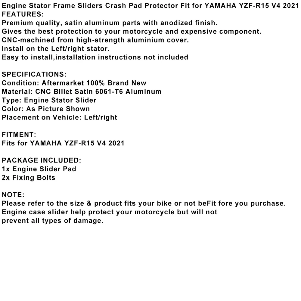 You may also like Universal Motorcycle CNC Carbon Fiber 6mm Swingarm Sliders Spools Gray UE 18.85 USD Free shipping Steering Horn Head Cover fairing Tie For VESPA GTS300 GTV300 2019-2022 Black 48.85 USD Free shipping Billet Rear Fender Brace Brackets Stays For Yamaha Banshee 350 YFZ350 1987-2006 15.85 USD Free shipping Unpainted ABS Headlight Side Fairing Cover Panel Fit YAMAHA MT09 FZ09 2017-2020 33.85 USD Free shipping Aluminum Shifting Gear Lever Stabilizer Black For Kawasaki Z900Rs 18-21 19 20 17.85 USD Free shipping Moto Universal Rear Master Cylinder Hydraulic Brake Pump Fluid Reservoir Red US 22.66 USD 23.85 USD Free shipping 5% off Injection Fairing Kit Bodywork Plastic ABS fit For Yamaha FZ6R 2009-2015 679.0 USD Free shipping Side Frame Cover Panels Trim Fairings Cowls For Honda CBR650R 2019-2021 Red 161.85 USD Free shipping CNC Black Rear Brake Fluid Reservoir Cap For Honda ST125 Dax Z125 Monkey 18-2023 13.85 USD Free shipping Engine Guards Protective Pad Engine Slider Black Fits For Suzuki Gsxr1300 08-20 135.85 USD Free shipping Headlight Fairing Windshield Cover For Yamaha XVS 950 SPEC BOLT 950 2013-2022 M2 85.85 USD Free shipping Unpainted Rear Lower Tail Seat Side Fairing For Suzuki GSX-S 1000 2015-2020 144.85 USD Free shipping Engine Stator Frame Sliders Crash Pad Protector Fit for YAMAHA YZF-R15 V4 2021 FEATURES: Premium quality, satin aluminum parts with anodized finish. Gives the best protection to your motorcycle and expensive component. CNC-machined from high-strength aluminium cover. Install on the Left/right stator. Easy to install,installation instructions not included SPECIFICATIONS: Condition: Aftermarket 100% Brand New Material: CNC Billet Satin 6061-T6 Aluminum Type: Engine Stator Slider Color: As Picture Shown Placement on Vehicle: Left/right FITMENT: Fits for YAMAHA YZF-R15 V4 2021 PACKAGE INCLUDED: 1x Engine Slider Pad 2x Fixing Bolts NOTE: Please refer to the size & product fits your bike or not beFit fore you purchase. Engine case slider help protect your motorcycle but will not prevent all types of damage. -About US Founded in 2012, VIPJQ have professional development and sales, and are involved in various products, providing customers with various high-quality products. Since its establishment, VIPJQ has always adhered to the service concept of "customer first" and the management concept of "pursuit of quality", and is committed to providing customers with high-quality original designs. We commit to provide you the best innovative, quality products & professional services with competitive prices. We value every customer, and we look forward to providing solutions for your business needs to help your business achieve its goals, please contact us immediately! We are all about you! We are a Japanese seller,but with large warehouse in USA. We are profesional on Auto Parts,Car Parts,Motorcycle Parts,3C,other hot sale items and so on. We aim to provide to customers high quality product and best service. -About Shipment&Returns The item usually will be dispatched within 3 days after you ordered.All are free shipping. And it usually takes 3-10 working days to delivery depends on buyers' address or other majeure on the way. If you are not satisfied with the items and want to return the item,we hope you could message us first,we will give you the return details, we think we could give you the best service to save your time and money.Thank you. -About Feedback&Customer Service If you are enjoy your shopping here,not only enjoy the items but also the service,we are appreciate you could give us a 5-star feedback. If you are not satisfied with the item,before you give us the negative feedback,we hope we could give you the best solution through our commutication. We think we could do it if you give us the chance.Thank you.