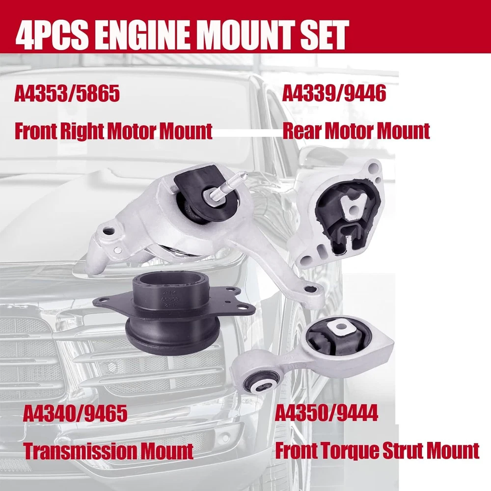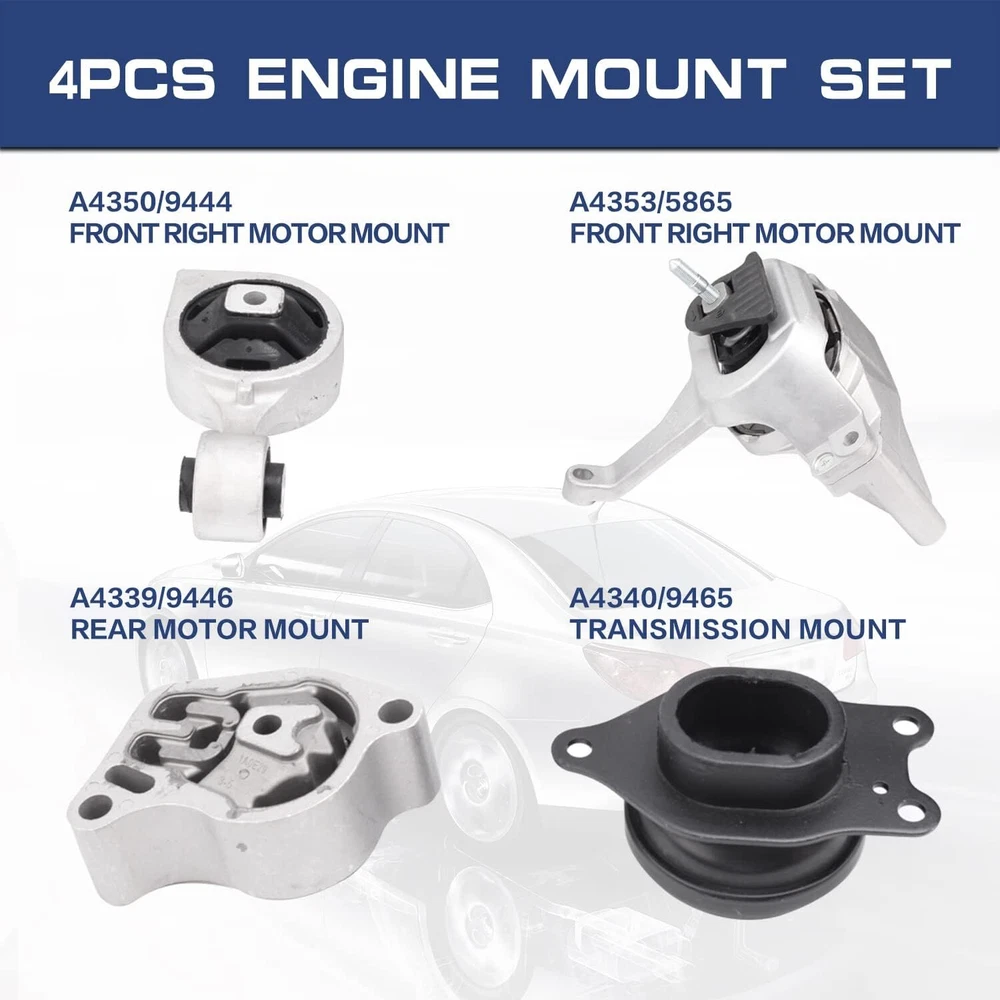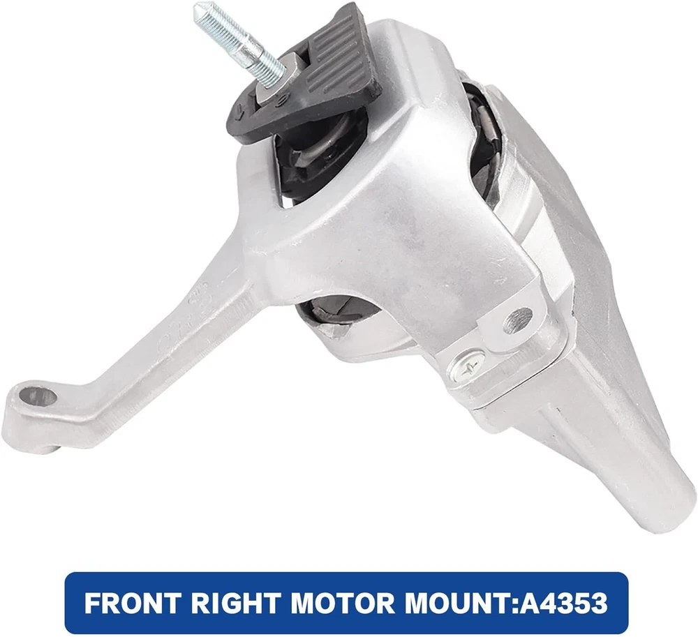 Engine Motor Transmission Mount Kit For Nissan Altima 2007-2015 L4 2.5L Auto CVT Autopartszone Introduction We are committed to presenting high-quality products to buyers and selling them at the most favorable price. Excellent after-sales service will escort your purchase. Item Description ⭐Engine Motor Transmission Mount Kit For Nissan Altima 2007-2015 L4 2.5L Auto CVT⭐ [Compatible Model] Compatible with 2007-2017 Nissan Altima 2.5L Engine. [Replace Part Number] A4350, A4353, A4340, A4339, 11210-JA000, 11220-JA000, 11350-JA00A, 11360-JA000. [Enhanced Stability] Each mount is designed to securely hold the engine in place, reducing vibration and noise while driving, and maintaining stability for a smoother and more comfortable ride. [Durable Construction] Constructed from superior iron aluminum and rubber, these mounts offer durability and longevity. [Package List] right motor mount x1 ; front right torque strut mount x1 ; left transmission mount x1 ; rear motor mount x1 DEA: A4350 OEM NO.: 11350-JA00A DEA: A4353 OEM NO.: 11210-JA000 DEA: A4339 OEM NO.:11360-JA000 DEA: A4340 OEM NO.:11220-JA000 Engine mount description The engine motor and transmission mounts absorbs noise and vibrations from the engine and transmission while securing them in place. Having put through constant pressure, these mounts do not last forever and will need replacing after some time. If you are hearing clunks, weird noises and feel like the engine is bouncing during stops, sudden acceleration or even tight turns then the engine and transmission mounts may likely be the culprit. Our store includes the front right motor mount, rear lower torque strut mount, front upper torque strut mount and the transmission mount. The engine and transmission mounts can easily be located inside the engine bay. It is advisable to replace with the whole kit while you are at it also to maintance balance and weight distribution. An engine mount doesn't need any maintenance or regular servicing. It only needs to be replaced when it fails or wears out. How long can an engine mount last? In some cars, engine mounts can last the life of the vehicle.We see the most of the problems with engine mounts starting to show in 5-7 year-old vehicles. Transmission mounts last longer. Engine mount problems 1.The most common problem with the engine mount is when the rubber part breaks or separates or when liquid starts leaking out of the liquid-filled mount. 2.Common symptoms of a failed engine mount is the increase in engine noise and vibration felt inside the car.Often, the excessive vibration is more noticeable at idle with the transmission engaged. For example, in some 07-08 Honda Civic models, a failing passenger side mount can cause a vibration and growling noise felt in Reverse when the engine is started cold.In some cars, a failed engine mount can cause vibration felt in the steering at idle when the transmission is in Drive. The vibration disappears when shifted to Neutral.A bad transmission mount may also cause squeaking when shifting gears. For example, in some Mazda cars with a manual transmission, a rubber insert inside the transmission mount may cause squeaking when starting the engine or shifting gears.In some cars, a bad engine mount can cause rattling noise when the engine is started or shut down. How a failed engine mount is diagnosed 1.Visible signs of a failed engine mount include cracks, tears and separation in the rubber, as well as leaking liquid. 2.When a bent or damaged exhaust pipe touches one of the chassis components, it also creates vibration and rattling noise when shifted to Drive or Reverse noticeable inside the car. 3.Often, when one of the mounts is bad, an engine may appear seating lower on the side of the bad mount. 4.When one engine mount goes bad, it adds more strain on all other mounts. For this reason, it's not uncommon to see two mounts that need replacement at the same time. Installation Steps Follow the steps below for some handy tips for replacing engine mounts. Inspecting and replacing worn or broken engine and transmission mounts will help the rubber meet the load. Step 1: Check for clearance against the firewall before attempting to raise the engine. Tearing radiator hoses, crimping AC lines or cracking distributor caps should be avoided. Step 2: Secure the engine on a jack with various blocks of wood. Never jack an engine directly by the oil pan. The pan will bend and rupture. Step 3: Loosen the engine from the mount bolts. Sometimes a long extension and universal joint is the way to go. Step 4: Next, crawl under the vehicle and loosen the mount-to-frame bolts. Step 5: Jack-up the engine a little at a time and remove the motor mount. Step 6: Compare the old and new motor mounts. Transfer any heat or drip shields to the new mount. Step 7: Thread in the mount-to-frame bolts before lowering the engine. This will simplify mount alignment. Step 8: Lower the engine and fully tighten all bolts. Step 9: Front-wheel-drive vehicles often have third "dog-bone" motor mounts. Fitment 2007-2016 Nissan Altima 2.5L for Automatic CVT Transmission Package Included 1 x 9809 / A4353 / 9809 / EM-5865 - Front Right Motor Mount 1 x 9465 / A4340 / 9465 / EM-9465 - Transmission Mount 1 x 9444 / A4350, A7363 / 9444, 9545 / EM-9444, EM-9545 - Front Torque Strut Mount 1 x 9446 / A4339 / 9446 / EM-9446 - Rear Motor Mount (As pictures show) FAQ: I purchased by mistake, how do I cancel the order? Please contact us ASAP. If the item has not been shipped out we can cancel the order for you. If the item was shipped out you can refuse the package and wait for the item to return to us. I received your item but it does not fit or is defective Please contact us so we can assist you on the matter. Buy with confidence Our quality is based on meeting the requirements of the manufacturer and improvement them in design problems manufacture. NOTE: (1)It would be highly appreciated if you might contact us first once you have any problems concern