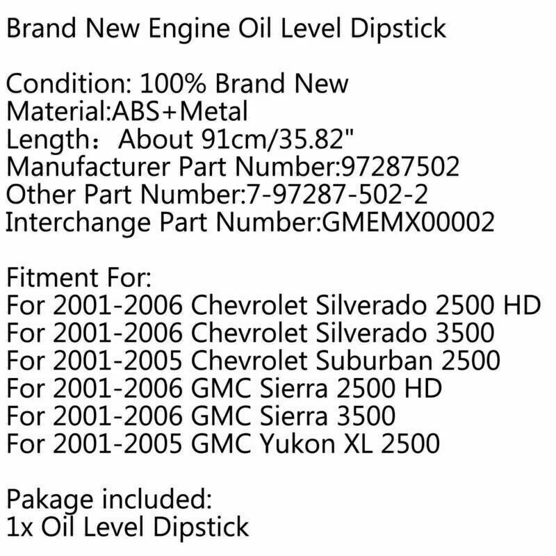 Gas Tank Fuel Cock Valve Petcock fit for Yamaha YZF R1 XJ900 YZ80 4KM-24500-00 18.76 USD Free shipping For BMW E46 323i 325i 328i 330i M3 305 02-06 LHD Center Console Trim Base BE F13 70.61 USD 74.33 USD Free shipping 5% off NEW Set of 4 Door Handles Chrome For Chrysler 300 & 300C 2005-2010 4589009AH USA 74.87 USD Free shipping 7" LCD Digitizer Touch-Screen C070EAT01.0 For Uconnect Radios VP2 2018-2022 83.4 USD 87.79 USD Free shipping 5% off 6L80 6L90 Transmission Rebuild 1-2-3-4 3-5-Reverse Clutch Seals Pack O-Rings 20.89 USD 21.99 USD Free shipping 5% off Oil Cooler Filter Housing Seal Gasket O-ring 21304-JA11A For Nissan Armada Titan 10.68 USD Free shipping CNC Adjustable Kickstand Side Stand Fit HONDA CBR 600 1000 RR 600RR 1000RR 41.86 USD Free shipping CARBURETOR CARB REPAIR REBUILD KIT FOR GY6 125CC Aprilia PD24J BMW ATV Go Kart 15.79 USD Free shipping 1pcs Fuel Injectors 7561277 13537561277 Fit BMW N45 N46N E93 320I 2.0L 17.87 USD Free shipping M18X1.5 Female Aluminum Weld On Fitting Bung US 11.2 USD 11.79 USD Free shipping 5% off 18213-65J00 Upstream Lambda O2 Sensor For Suzuki Grand Vitara 1.6 2.0L 06-15 29.79 USD Free shipping Speedometer Upper Dash Display Gauge Instrument For Honda Civic Sedan 06-11 113.17 USD Free shipping A Fantastic Shop Send us a message Our Store Seller Profile Feedbacks Save this seller Contact Engine Oil Level Dipstick Fit For GM Silverado Sierra 2500 3500 HD 6.6 Duramax Brand New Engine Oil Level Dipstick Condition: 100% Brand New Material:ABS+Metal Length:About 91cm/35.82" Manufacturer Part Number:97287502 Other Part Number:7-97287-502-2 Interchange Part Number:GMEMX00002 Fitment For: For 2001-2006 Chevrolet Silverado 2500 HD For 2001-2006 Chevrolet Silverado 3500 For 2001-2005 Chevrolet Suburban 2500 For 2001-2006 GMC Sierra 2500 HD For 2001-2006 GMC Sierra 3500 For 2001-2005 GMC Yukon XL 2500 Pakage included: 1x Oil Level Dipstick About US About Our Items We strive to describe all items accurately and thoroughly, with the utmost care and attention to detail. However, to ensure a mutually satisfactory transaction, we kindly ask for your assistance in thoroughly reviewing the item description and photos, and addressing any questions before placing a bid. Customer Satisfaction We stand behind our commitment with exceptional service, a 100% money-back guarantee, and a dedication to customer satisfaction. I am readily available to address any inquiries or concerns you may have, both before and after your purchase. Our aim is to ensure your shopping experience is enjoyable and that you're delighted with your purchase. Feedback Your feedback is crucial to our business's success. If you're satisfied with your purchase and the service you received, we would greatly appreciate your positive feedback, along with an overall Detailed Selling Rating (DSR) of 5. Please take a moment to leave us positive feedback. Our eBay account is set up to automatically reciprocate positive feedback once yours is received. If you're considering leaving neutral/negative feedback or opening an eBay/PayPal case, we encourage you to reach out to us immediately. We're committed to resolving any issues to the best of our ability. Shipping Parcel will be shipped using Standard shipping method. For security purposes, items will be shipped exclusively to the confirmed address on Paypal. Please ensure your Shipping address is up to date before proceeding with payment. Estimated delivery time within the United States ranges from 3 to 10 business days, depending on your location. Returns We accept returns within 60 days from the date the buyer receives the item. If the item is found to be defective upon receipt, the customer has up to 30 days from the date of receipt to request an exchange for a new item or a refund. For returns due to a change of mind, we accept items in their original selling condition. However, if the package has been opened due to a mistaken order, it does not qualify for our return policy. Please note that the buyer is responsible for covering the cost of return postage. If you encounter any issues, please reach out to us via eBay message, and we'll respond within 24 hours. Engine Oil Pan 11110-6RC1B For Nissan Rogue 1.5 2023-2024 55.99 USD Free shipping Swap Oil Pan Retrofit Low Profile 81073 For LS1 LS2 LS3 4.8L 5.3L 6.0L 6.2L Rear 165.87 USD Free shipping Transmission Oil Pan 31390-1XJ0C For Infiniti 110.79 USD Free shipping