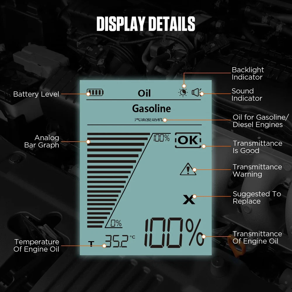 AS503 Engine Oil Tester with Digital Display for Auto Check Gasoline & Diesel Car Engine POA Oil Quality Repair Tools AS503 Engine Oil Tester is a specialized oil testing device tailored for the automotive inspection and maintenance sector. Its primary function involves measuring the transparency of engine oil within gasoline or diesel engines. This measurement reflects the presence of impurities and contaminants within the oil. Consequently, it assesses the quality and performance of engine oil, effectively preventing potential engine issues and malfunctions, thereby ensuring the engine operates normally and efficiently. Note : The main functions of AS503 and AS505 include measuring the transparency of engine oil in gasoline or diesel engines. The measured value reflects the existence of impurities and pollutants in the oil. It can detect impurities produced by mechanical friction of metals. You can directly use the old engine oil for the test. thank you AUTOOL AS503 Engine Oil Tester Features: 【Optical Principle Precision Test】Auto Oil Quality Check,The 2.8 Inchs LED display can accurately display the results and the readings are clearer.Use the optical principle to check the engine oil condition,with a clear display for efficient operation even in varying lighting conditions,be it bright daylight or dim nighttime.Use the optical principle to check the engine oil condition and get the latest oil condition in anytime and anywhere.get the latest oil condition in anytime and anywhere. 【Sound Alarm】when the transmittance is between 100% and 60%,there is no need to change engin oil.when the transmittance is between 60% and 30%,an exclamation mark will be displayed on the screen to remind you to change the engin oil. when it isbelow 30%.the engin oil tester will emit a “beep”alarm to remind you to change the engin oil immediately to ensure safety.[ T] to indicate the current oil measurement temperature. 【Premium Quality】The body's handheld portion is lined with silicone substrate,providing excellent grip & lightweight design for easy single-handed operation. The 800mm long probe designoffers a more flexible & convenient way ofconducting tests.The hose is made of PTFE material,highly resistant to oil&oxidation,and boasts exceptional corrosionresistance, effectively extending the product's lifespan. Operation steps: 1.wipe the test probe clean 2.remove the oil dipstick 3.press the ↶ button to select the vehicle's engine type 4.submerge the testing probe into the engine oil 5.press the ►buteon to start the test 6.the interface will display the test results Oil Temperature Measurement: Built-in temperature sensor measures and displays the actual oil temperature, reflecting the engine's operational status and load. Ensures measurement results are within the normal working temperature range. Compatible with Various Lubricant Oil Standards: Suitable for the majority of gasoline and diesel engine lubricant oils available in the market. Separate sampling and measurement for gasoline and diesel engines allow for more precise assessment of lubricant oil health. Flexible Hose Probe for Convenent Testing: The 800mm long probe design offers a more flexible&convenient way ofconducting tests. The hose is made of PTFE material, highly resistant to oil&oxidation, and boasts exceptional corrosion resistance, effectively extending the product's lifespan. High-pregision Optical Probe: Integrated with a high-precision optoelectronic sensor, ensuring more accurate measurement results. Large LCD with High Definition: Equipped with a backlit 2.8-inch LCD screen, providing users with a clear display for efficient operation even in varying lighting conditions, be it bright daylight or dim nighttime. User-friendly Handheld Design: The body's handheld portion is lined with silicone substrate,providing excellent grip & lightweight design for easy single-handed operation. Why Choose the AUTOOL Automotive Engine Oil Tester? The AUTOOL Automotive Engine Oil Tester is a professional tool designed for the automotive maintenance field. It is capable of measuring parameters like engine lubricant transparency and oil temperature. This device stems from AUTOOL's independent research and development, boasting several intellectual property rights. Moreover, it has received authoritative certifications from organizations like CE, FCC, and ROHS. Since engine oil play a key role in lubrication, cooling, rust prevention, cleaning, sealing, and buffering, using the AUTOOL Car Engine Oil Tester can effectively prevent engine issues and breakdowns. Through simple testing procedures, users can obtain accurate lubricant quality analysis and maintenance recommendations, ensuring the engine operates efficiently and extending its lifespan.
