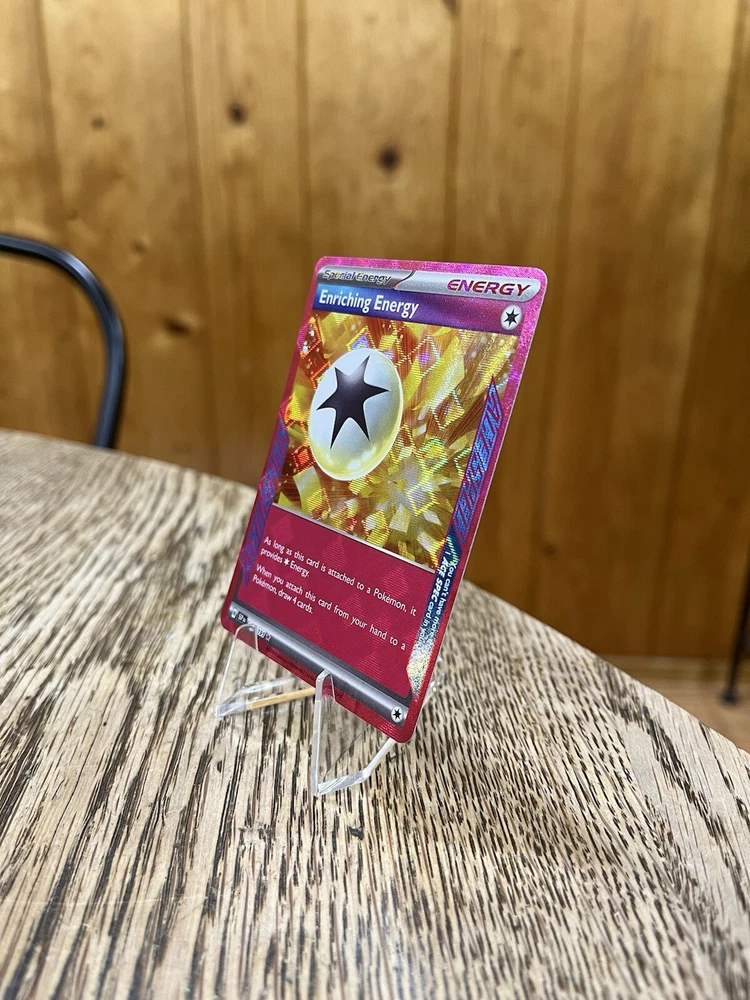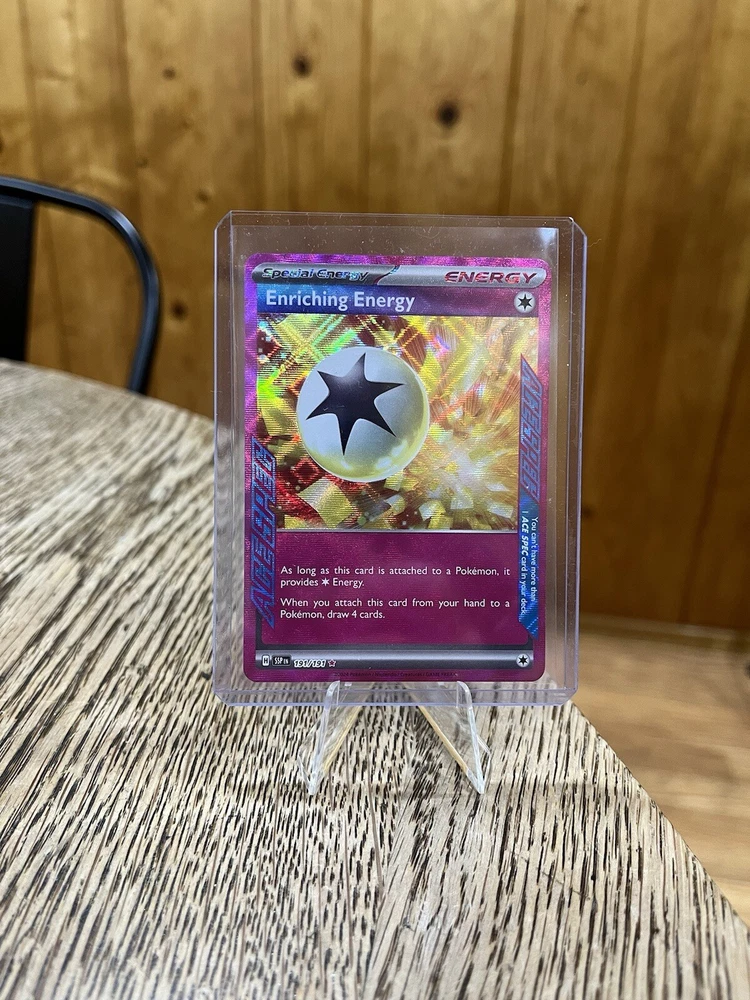 Elevate your Pokémon TCG collection with the Enriching Energy Ace Spec card from the Scarlet & Violet set. This card, numbered 191/191, features the iconic Enriching Energy illustration by 5ban Graphics, capturing the essence of the beloved Ace character. The card boasts a stunning holo finish that accentuates its unique design, making it a standout addition to any deck or display. The Enriching Energy Ace Spec card is a must-have for players and collectors alike, offering the EX speciality that enhances gameplay experience. Crafted from quality card stock, this English-language card is suitable for ages 4 and up. Add this gem from the 2024 manufactured series to your collection and enjoy the strategic depth it brings to your battles.