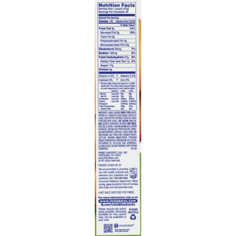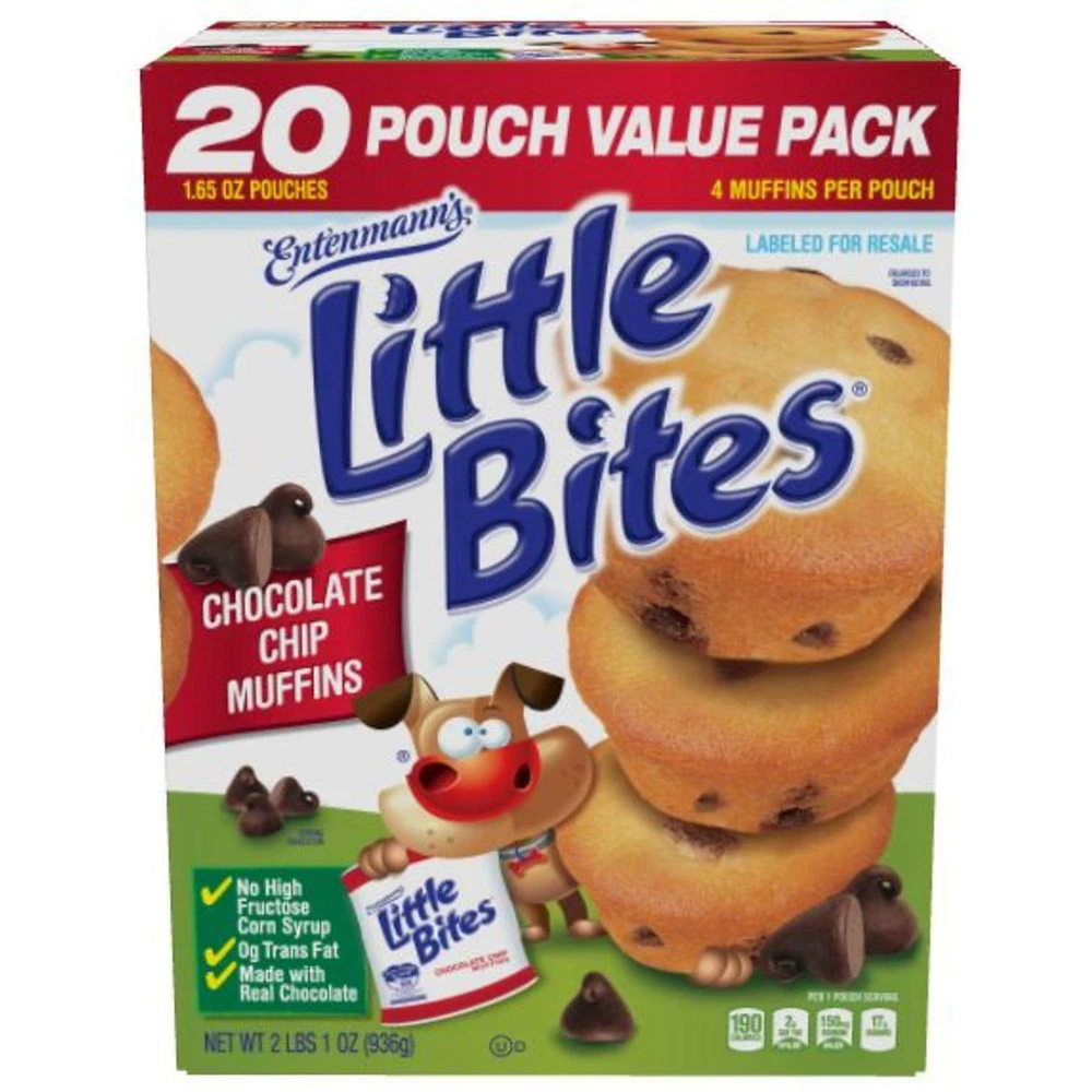 Entenmann's Little Bites Chocolate Chip Muffins 20 CT 33 OZ Made with real chocolate Each pouch contains four muffins Individually wrapped so they're easy to carry Only 190 calories per serving 20 Packs - 1.65 oz NET WT 33 OZ (2 LBS 1 OZ) 936 G EACH PACK Feel free to ask any questions regarding to this item