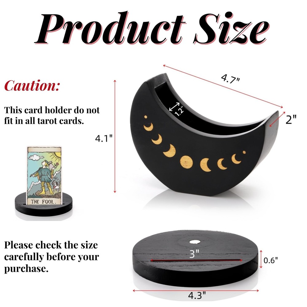 The round base of our tarot deck holder with moon shape case measures a thickness of 0.6 inch and 4.3 inch in diameter. The moon shape case measures 4.7" x 4.1" x 2.0", 3.9" in inner length and 1.2" in inner width, which is big enough to hold tarot, oracle, or any other type of card deck. Our wood tarot card stand case is made of high-quality wood that is light but sturdy and durable. And the careful package makes sure our deck holder in good condition. Our tarot card stand case is crafted in the shape of a curved moon with a round base matched together and is carved golden moon phase pattern. And there is a slot on the base for placing a daily card. The altar supply meditation accessories case features a hidden magnet design that connects the moon shape container and and the round base so that you can rotate the moon shape case as you like. This witchy decor organizer is a distinctive mystical addition to your altar or desk in your room or office to connect you with natural super power or simply decorate your space. It would also be a remarkable gift for your friend as a tarot fan. Premium Material: Our wood tarot card stand case is made of high-quality wood that is light but sturdy and durable. The surface is smoothly finished and evenly colored black. And the careful package makes sure you will receive our deck holder in good condition. Perfect Size: The round base measures a thickness of 0.6 inch and 4.3 inch in diameter. The moon shape case measures 4.5" x 4.1" x 2.1", 3.9" in inner length and 1.2" in inner width, which is big enough to hold tarot, oracle, or any other type of card deck. Exquisite Design: Our tarot card stand case is crafted in the shape of a curved moon with a round base matched together. On both sides of the moon case are delicately carved moon phase pattern, which shine gold against the black tone, making our showcase aesthetically pleasing. And there is a slot on the base for placing a daily card. Magnet Connection: Our altar supply meditation accessories case features a hidden magnet design that connects the moon shape container and and the round base. You can easily rotate the moon shape case to any angle to face you as you like, creating an enchanting ambiance for you while meditating or working. Special Decoration: Our witchy decor organizer is of mysterious psychic witchy atmosphere, making it a distinctive addition to your altar or desk in your room or office to connect you with natural super power or simply decorate your space. It would also be a remarkable gift for your friend as a tarot fan.