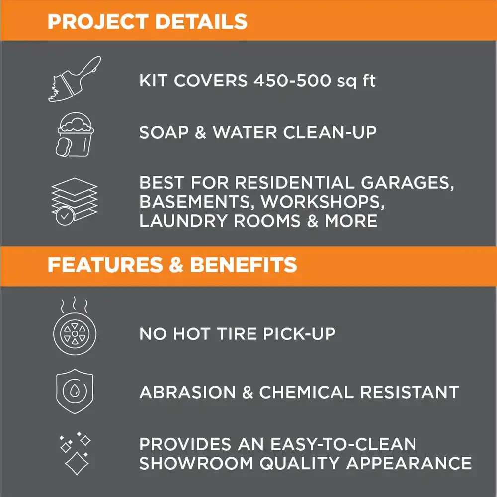5x more durable than 1-part epoxy on interior concrete floors Waterproofing sealer resists chemicals and hot tires on concrete Use on garage floors and more, covers up to 500 sq. ft. Rust-Oleum EpoxyShield 240 oz. Gray High-Gloss Low VOC 2.5-Car Garage Floor Kit beautifies and protects your garage floor or workshop area. Specially formulated, 2-components, water-based epoxy floor coating provides superior adhesion and durability. Designed for one coat coverage, easy to apply and provides professional-looking results.