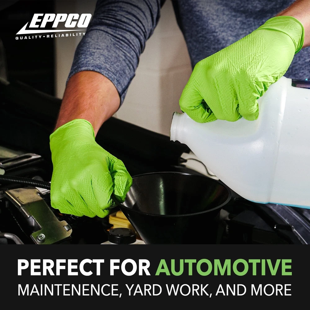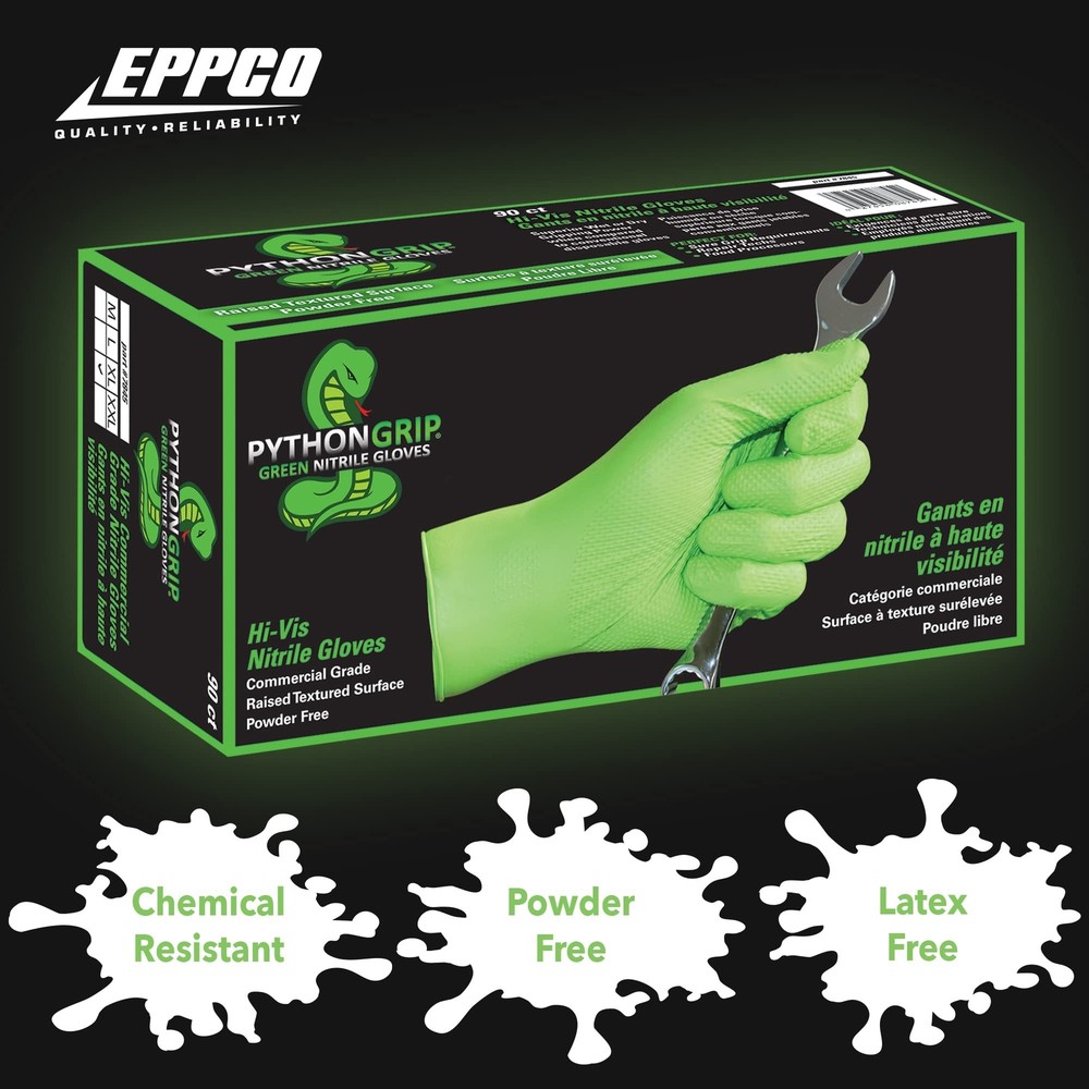 NEW! Eppco PythonGrip Hi-Vis Green Nitrile Gloves - Size L 100 count box - Buy Now with Fast Shipping! NEW! Eppco PythonGrip Hi-Vis Green Nitrile Gloves - Size L 100 count box Product Details Material: Nitrile Brand: EPPCO Size: 100 Count (Pack of 1) Color: High Visibility (Hi-vis) Neon Green Special Feature: Latex-free,Disposable Manufacturer: EPPCO Part Number: B015RN6RI8 Item Weight: 1.4 pounds Product Dimensions: 4.9 x 3.7 x 9.6 inches Item model number: B015RN6RI8 Is Discontinued By Manufacturer: No Size: 100 Count (Pack of 1) Color: High Visibility (Hi-vis) Neon Green Style: Large, Box of 100 Material: Nitrile Pattern: Large, Box of 100 Item Package Quantity: 1 Number Of Pieces: 100 Special Features: Latex-free,Disposable Batteries Included?: No Batteries Required?: No Date First Available: September 24, 2015 Key Features ✅ NITRILE DISPOSABLE GLOVES The Python Grip nitrile gloves 6-mil are of commercial grade. Perfect mechanic gloves for automotive work, for repair techs, cleaning, and more. ✅ COMMERCIAL GRADE Industrial nitrile gloves, durable, and super resistant to punctures, tears, and rips. Ideal for extended-duration wear. ✅ SUPERIOR GRIP Strong grip nitrile gloves offering superior gripping power with a raised diamond textured surface. A smart choice for working with tools or machinery. ✅ POWDER AND LATEX-FREE Powder-free nitrile gloves latex-free, eliminating the risk of adverse latex reactions. ✅ BOX OR CASE AVAILABLE Easily seen hi-vis Lime Green nitrile gloves in sizes M-XXL are available in a box of 90 and 100 gloves or cases of 900 and 1000. Product Description