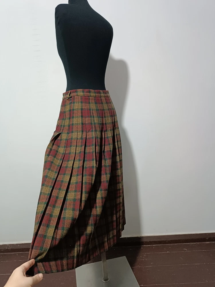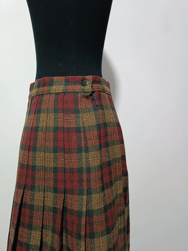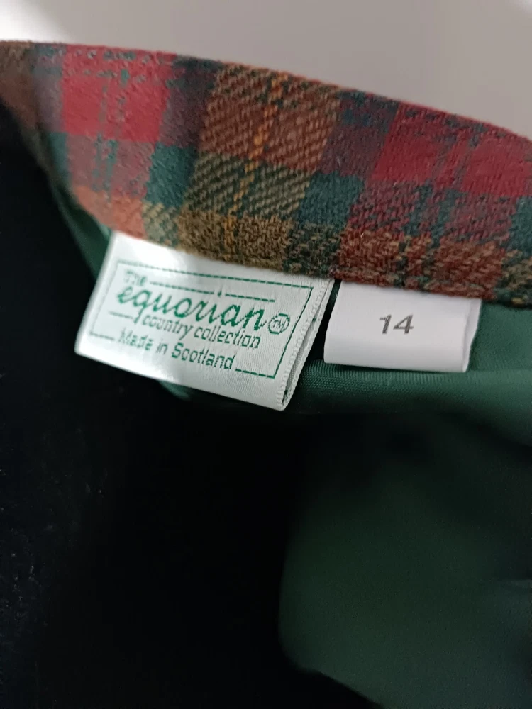 length 80 cm/31,5" width at waist half girth 36 cm/14" width at hips 72 cm/28" 100% virgin wool with quality mark, lining 100% polyester Made in Scotland.