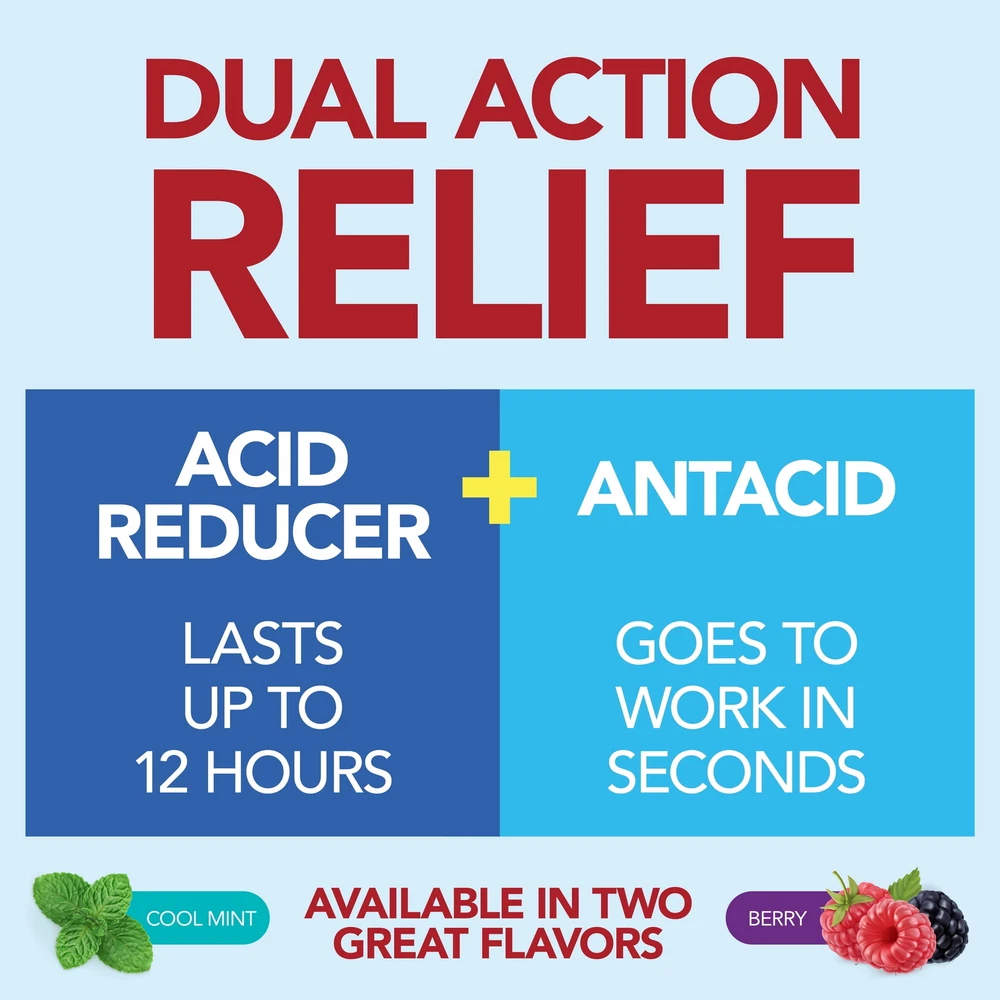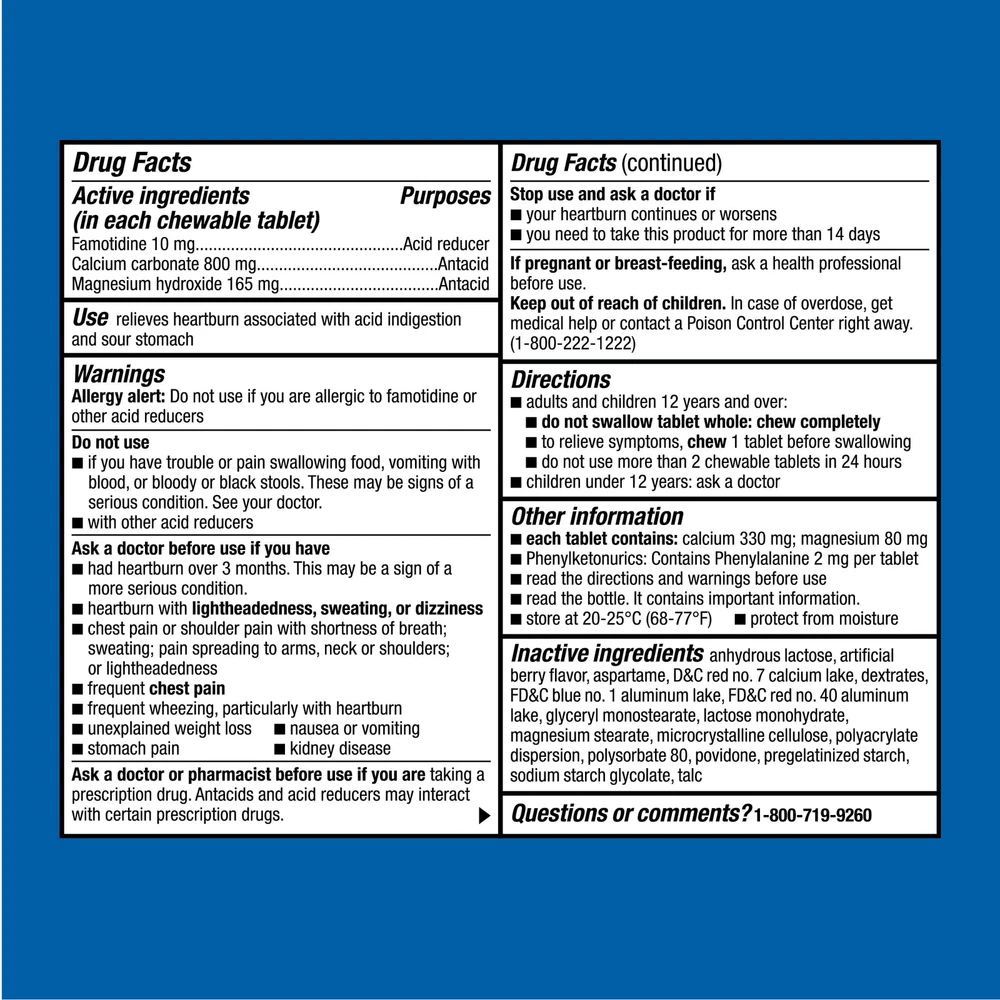 Product details Compare to Pepcid Complete active ingredients.Equate Dual Action Complete, Chewable Tablets, Berry Flavor, with the active ingredients famotidine 10 mg, calcium carbonate 800 mg and magnesium hydroxide 165 mg, helps relieve heartburn due to acid indigestion. Gluten free heartburn medicine with acid reducer plus antacid is intended for adults and children 12 years and over. Chewable tablets, no water required. Active Ingredients:Compare to the active ingredients of Pepcid Complete Heartburn Relief:Just one dual action tablet relieves heartburn due to acid indigestion for adults and children ages 12 years and over Acid Reducer:When stomach acid backs up into the esophagus, here is a chewable, berry flavor tablet for heartburn relief; no water required; great when you are on the go Dual Action Complete:One acid reducer and two antacids work together to relieve acid indigestion and sour stomach known as heartburn; famotidine 10 mg, acid reducer; calcium carbonate 800 mg, antacid; magnesium hydroxide 165 mg, antacid Heartburn Relief Tips:Do not lie flat or bend over after eating; do not eat before bedtime; eat slowly and avoid big meals info: We aim to show you accurate product information. Manufacturers, suppliers and others provide what you see here, and we have not verified it. See our disclaimer Specifications Features Medicated Brand Equate Assembled Product Weight 0.33 lb Assembled Product Dimensions (L x W x H) 2.30 x 2.30 x 4.75 Inches Indications Stop Use Indications Warnings: Allergy alert: Do not use if you are allergic to famotidine or other acid reducers. Do not use: if you have trouble or pain swallowing food, vomiting with blood, or bloody or black stools. These may be signs of a serious condition. See your doctor; with other acid reducers. Ask a doctor before use if you have: had heartburn over 3 months. This may be a sign of a more serious condition; heartburn with lightheadedness, sweating, or dizziness; chest pain or shoulder pain with shortness of breath; sweating; pain spreading to arms, neck or shoulders; or lightheadedness; frequent chest pain; frequent wheezing, particularly with heartburn; unexplained weight loss; nausea or vomiting; stomach pain; kidney disease. Ask a doctor or pharmacist before use if you are taking a prescription drug. Antacids and acid reducers may interact with certain prescription drugs. Stop use and ask a doctor if: your heartburn continues or worsens; you need to take this product for more than 14 days. If pregnant or breast-feeding, ask a health professional before use. Keep out of reach of children. In case of overdose, get medical help or contact a Poison Control Center right away. (1-800-222-1222) Health Concern Acid Reflux Directions Dosage Directions: Adults and children 12 years and over: do not swallow tablet whole: chew completely; to relieve symptoms, chew 1 tablet before swallowing; do not use more than 2 chewable tablets in 24 hours. Children under 12 years: ask a doctor. Instructions Directions: adults and children 12 years and over: do not swallow tablet whole: chew completely; to relieve symptoms, chew 1 tablet before swallowing; do not use more than 2 chewable tablets in 24 hours. Children under 12 years: ask a doctor. Ingredients Inactive Ingredients Inactive ingredients: anhydrous lactose, artificial berry flavor, aspartame, D&C red no. 7 calcium lake, dextrates, FD&C blue no. 1 aluminum lake, FD&C red no. 40 aluminum lake, glyceryl monostearate, lactose monohydrate, magnesium stearate, microcrystalline cellulose, polyacrylate dispersion, polysorbate 80, povidone, pregelatinized starch, sodium starch glycolate, talc. Ingredients Active ingredients (in each chewable tablet): famotidine 10 mg, calcium carbonate 800 mg, magnesium hydroxide 165 mg. Inactive ingredients: anhydrous lactose, artificial berry flavor, aspartame, D&C red no. 7 calcium lake, dextrates, FD&C blue no. 1 aluminum lake, FD&C red no. 40 aluminum lake, glyceryl monostearate, lactose monohydrate, magnesium stearate, microcrystalline cellulose, polyacrylate dispersion, polysorbate 80, povidone, pregelatinized starch, sodium starch glycolate, talc. Active Ingredients Active ingredients (in each chewable tablet): famotidine 10 mg, calcium carbonate 800 mg, magnesium hydroxide 165 mg. Mg OH- Active Ingredient Name Calcium Carbonate