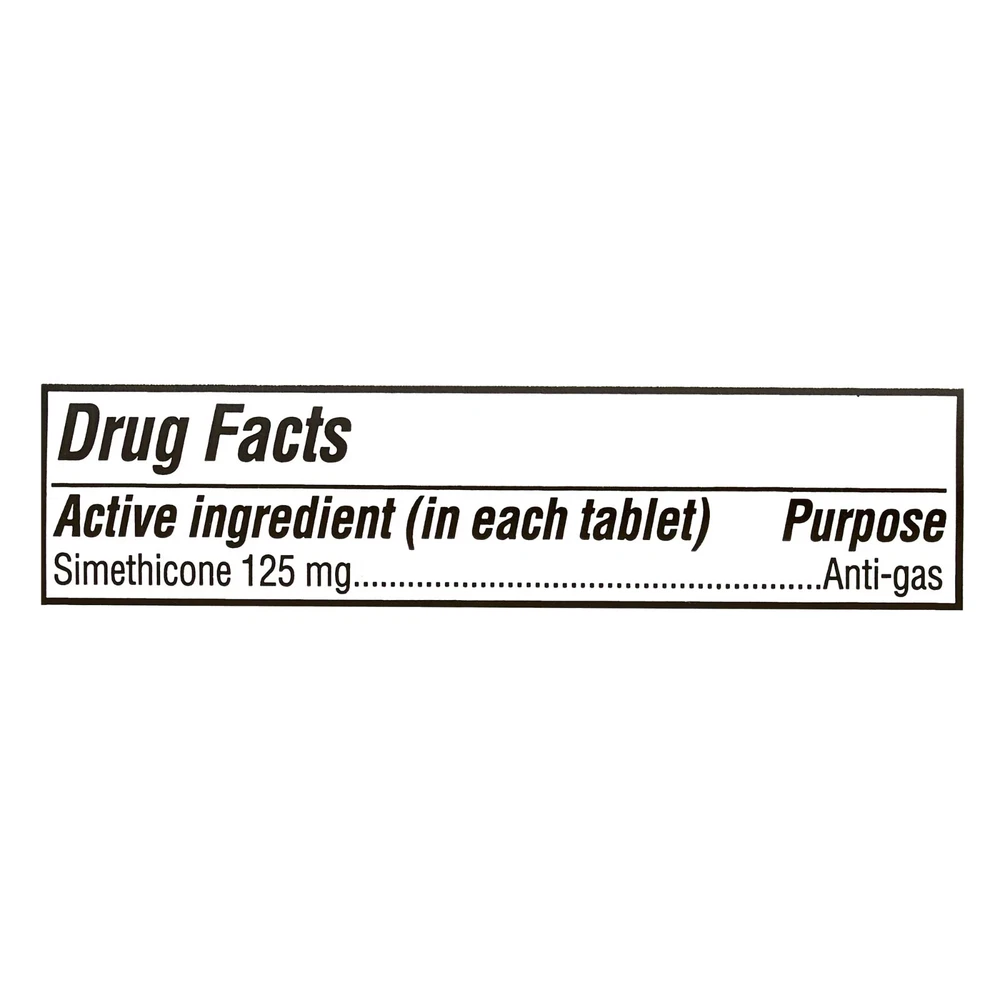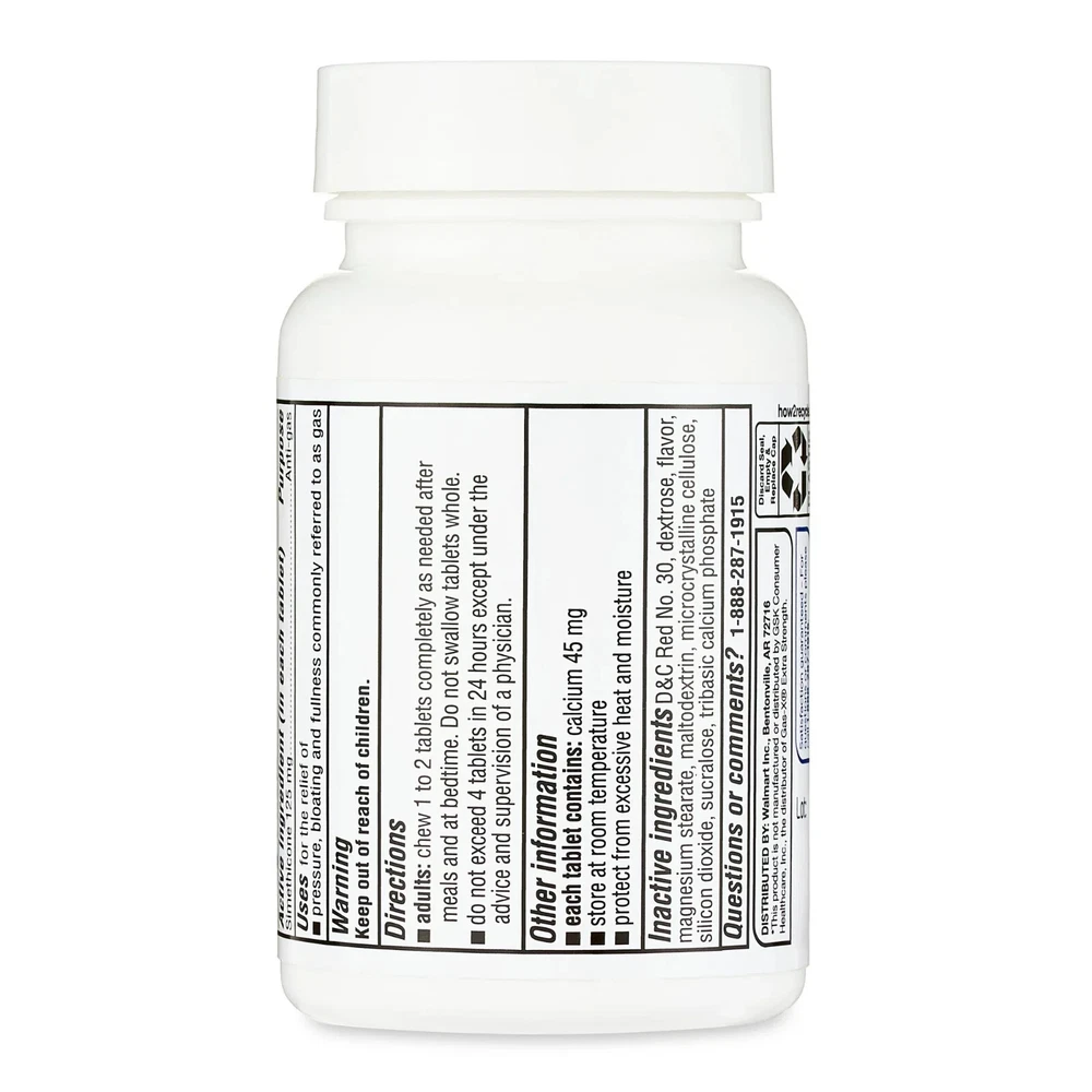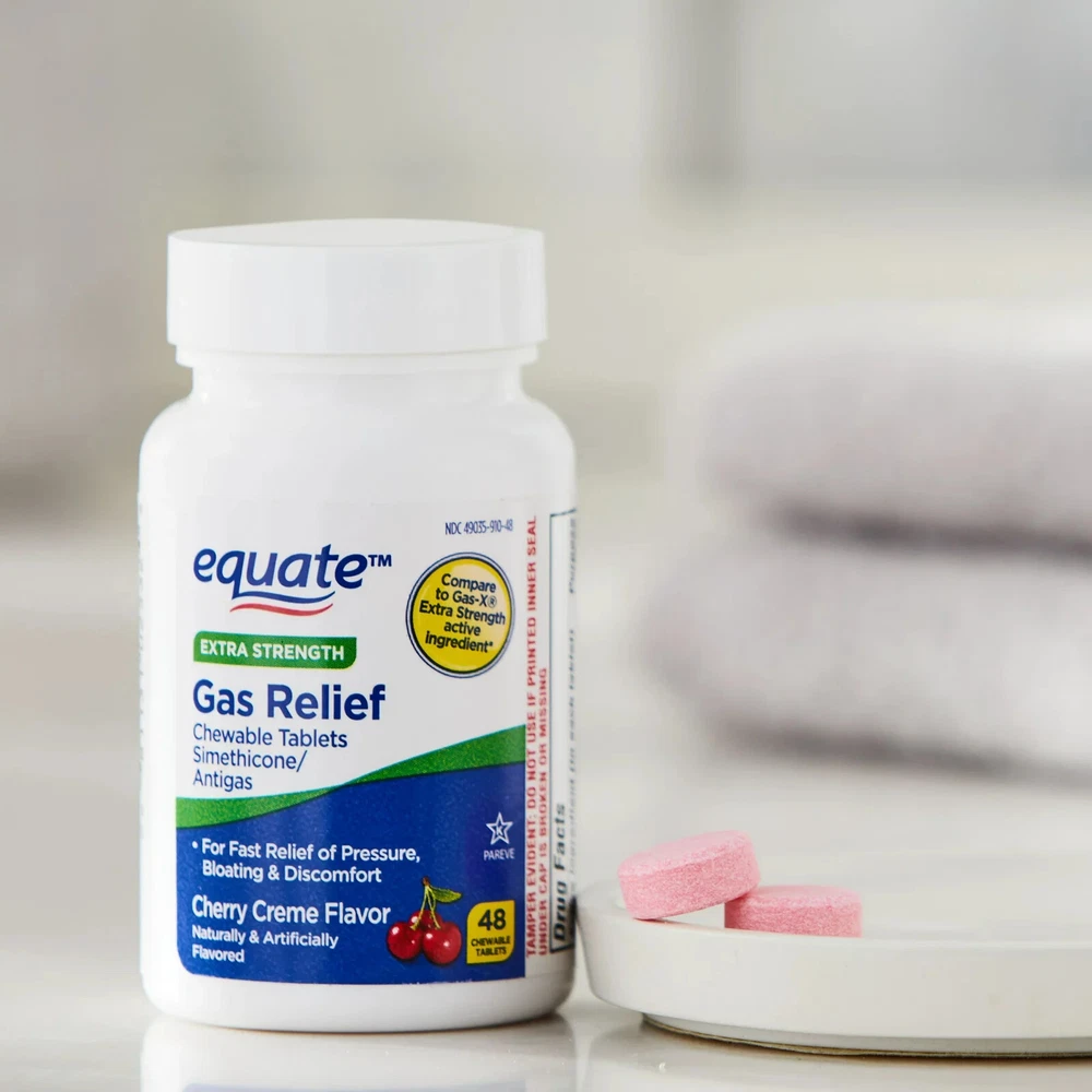 About this item Product details Equate Cherry Creme Extra Strength Gas Relief Chewable Tablets are specially formulated with simethicone to relieve gas pressure, bloating and discomfort. Gas may be caused by foods high in indigestible fiber, certain medical conditions, or a side effect of some medications. Bloating is caused by the buildup of gas in the digestive system, making you feel overly full and uncomfortable. These tablets help to break up gas bubbles in your stomach and intestines. Once the trapped gas is broken down, your body is then able to deal with it naturally. The tablets come in a chewable form with a sweet cherry creme taste, making them ideal for those with trouble swallowing pills. Let Equate Extra Strength Gas Relief Cherry Creme Chewable Tablets relieve you of gas-related discomfort. Making the right health decisions can be challenging. With a complete range of products and simple solutions, Equate allows you to take care of your family with confidence. Equate Extra Strength Gas Relief Chewable Tablets, Cherry Creme, 48 Count: Easy to take chewable tablets Sweet cherry creme taste Extra strength formula Relieves gas, bloating, and discomfort Provides immediate relief