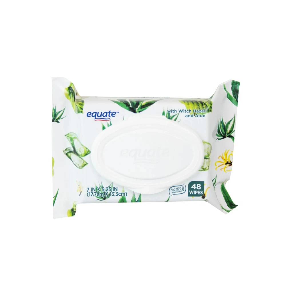 About this item Product details Enhance your bathroom experience with Equate Witch Hazel and Aloe Scented Flushable Wet Wipes. Infused with chamomile, aloe, and vitamin E these soft wet wipes leave you feeling clean and fresh with the scent combination of Witch Hazel and Aloe. This pack contains two packages with 48 wipes each - totaling 96 wipes. The Easy Pop-Ups® Dispensing, resealable closure ensures the wipes stay moist and allows for easy access whenever you need them. Made with 100% plant-based fibers these clean quilt wipes are alcohol-free, paraben-free, dye-free, and phenoxyethanol-free with no harsh ingredients to provide a refreshingly clean experience. Making the right health decisions can be challenging. With a complete range of products and simple solutions, Equate allows you to take care of your family with confidence. Contains 2 Flip-Top Packs each containing 48 Wipes - 96 Total Flushable Wipes Witch Hazel and Aloe Scented Hypoallergenic Contains Aloe and Vitamin E Alcohol, phenoxyethanol and paraben free Great for the whole family! Easy Pop-Up Dispensing Made with 100% plant-based fibers Meets INDA flushable product guidelines (See disposal instructions) Wipes measure 7” x 5.25”