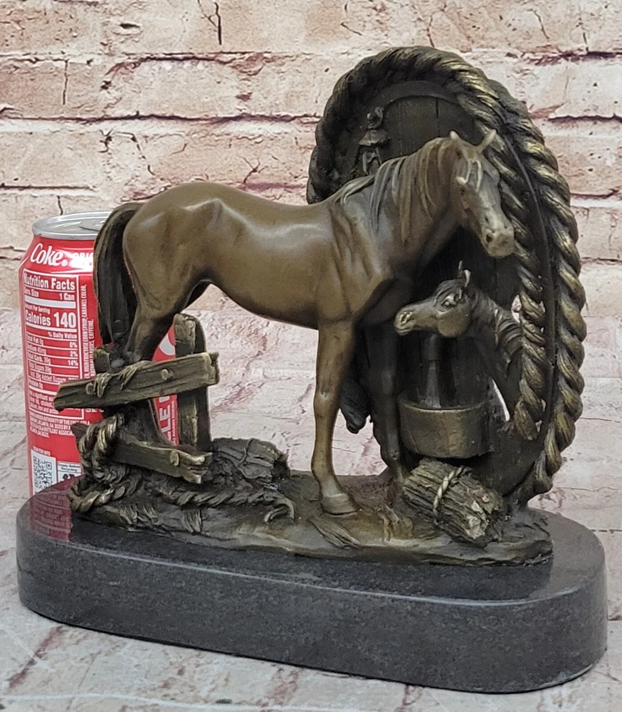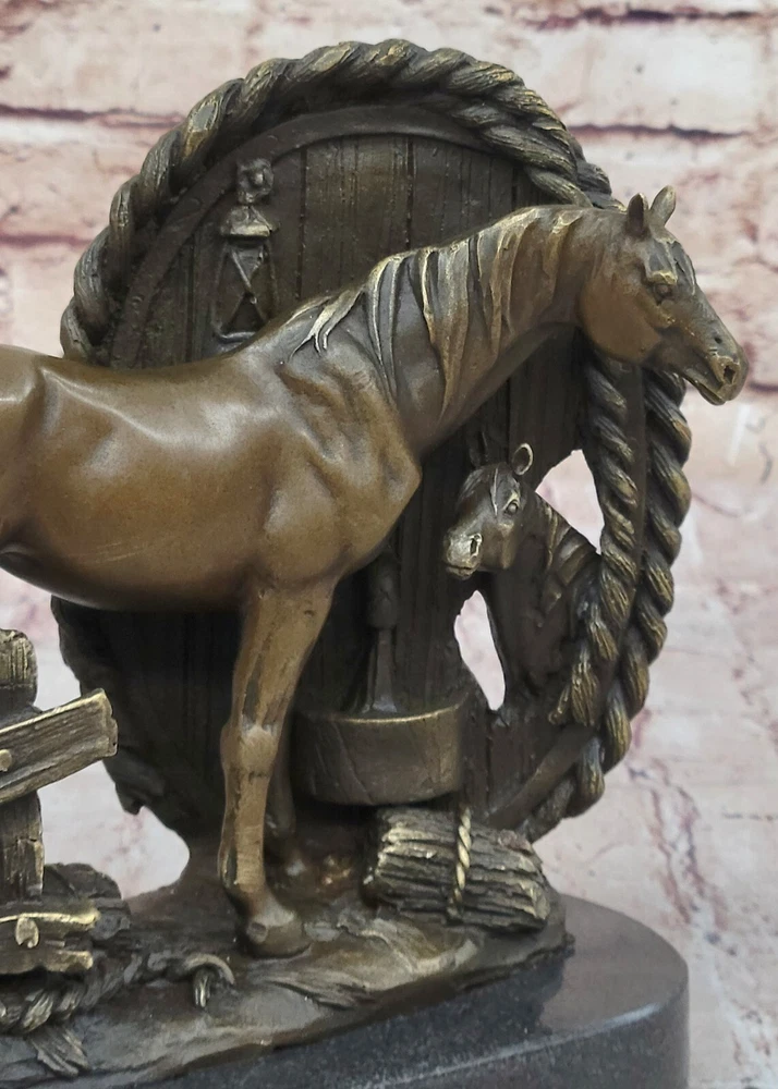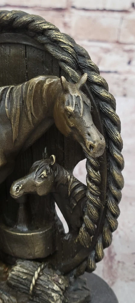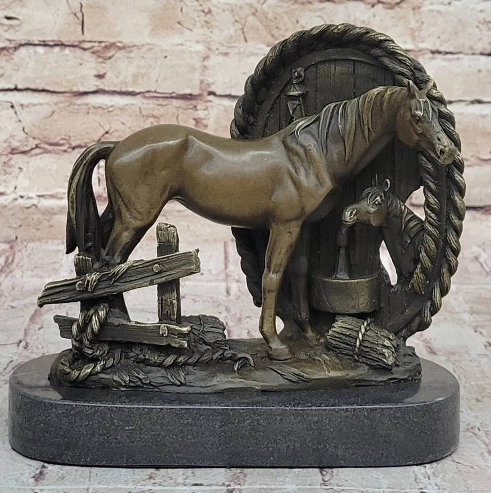 Condition: This sculpture is in perfect condition Bronze Dimensions with Marble Base: Height 8"" X Width 8.5"" Marble Dimensions: Diameter 8.5"" Height without base:7"" Weight:9 LBS Inventory:32YDW1434723 Grace and Freedom in a Spring MeadowIn a picturesque scene of tranquility, a magnificent mare gracefully strolls through vibrant, sunlit green fields on a delightful spring day. Her robust and full-bodied figure is accentuated by a mane that cascades down in long, flowing strands. The muscularity of her body is evident as she raises her head, flaring her nostrils with an air of carefree contentment. With not a worry in the world, she embodies the epitome of grace and freedom.Heartwarming Bond Between Mother and FoalAs the mare revels in her leisurely walk, her attention is shared with a charming baby foal by her side. The foal, eagerly nibbling on luscious green grass, mirrors its mother's carefree demeanor. Every move of the mare is shadowed by the foal, absorbed in the joyous simplicity of the moment. The sculpture skillfully captures this endearing bond between mother and foal, portraying a heartwarming snapshot of nature's beauty.Artistic Dedication in BronzeCrafted using the intricate ""Lost Wax Method,"" the bronze sculpture stands as a testament to artistic dedication. The two-tone brown patina brings the sculpture to life, enhancing the details of the mare and foal. The base of the sculpture artfully depicts grassy patches, subtly indicating the natural setting of a field. A thoughtful gift for any animal lover, this handmade masterpiece is signed by the artist Milo, ensuring its authenticity and unique charm. Hot Cast Large Mare and Baby Horse Bronze Sculpture Figurine Figure Bust by Milo www.bronzhaus.com Video will open in a new window Using the eBay App? Paste link into a browser window: [isdntekvideo]