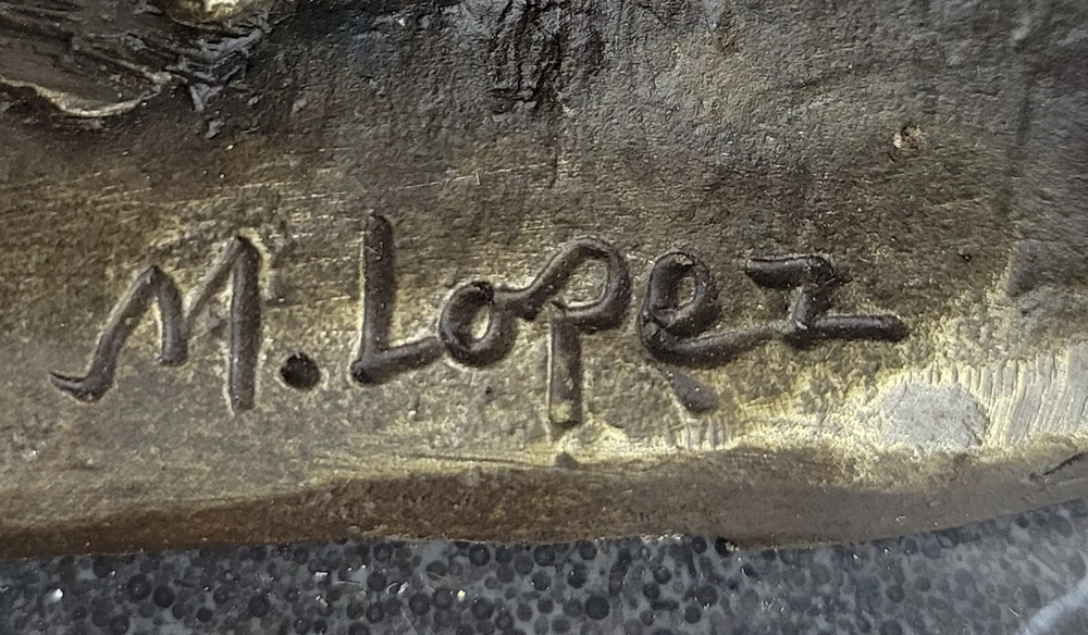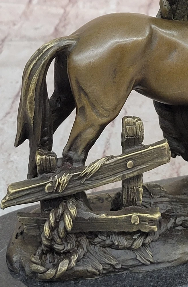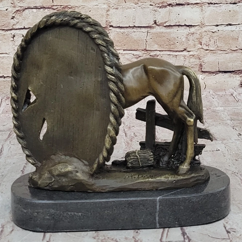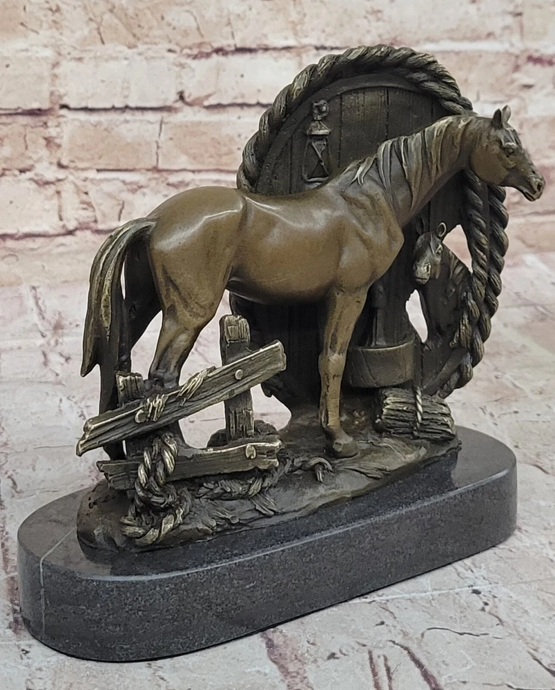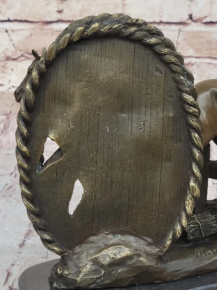 Condition: This sculpture is in perfect condition Bronze Dimensions with Marble Base: Height 8"" X Width 8.5"" Marble Dimensions: Diameter 8.5"" Height without base:7"" Weight:9 LBS Inventory:32YDW1434723 Grace and Freedom in a Spring MeadowIn a picturesque scene of tranquility, a magnificent mare gracefully strolls through vibrant, sunlit green fields on a delightful spring day. Her robust and full-bodied figure is accentuated by a mane that cascades down in long, flowing strands. The muscularity of her body is evident as she raises her head, flaring her nostrils with an air of carefree contentment. With not a worry in the world, she embodies the epitome of grace and freedom.Heartwarming Bond Between Mother and FoalAs the mare revels in her leisurely walk, her attention is shared with a charming baby foal by her side. The foal, eagerly nibbling on luscious green grass, mirrors its mother's carefree demeanor. Every move of the mare is shadowed by the foal, absorbed in the joyous simplicity of the moment. The sculpture skillfully captures this endearing bond between mother and foal, portraying a heartwarming snapshot of nature's beauty.Artistic Dedication in BronzeCrafted using the intricate ""Lost Wax Method,"" the bronze sculpture stands as a testament to artistic dedication. The two-tone brown patina brings the sculpture to life, enhancing the details of the mare and foal. The base of the sculpture artfully depicts grassy patches, subtly indicating the natural setting of a field. A thoughtful gift for any animal lover, this handmade masterpiece is signed by the artist Milo, ensuring its authenticity and unique charm. Hot Cast Large Mare and Baby Horse Bronze Sculpture Figurine Figure Bust by Milo www.bronzhaus.com Video will open in a new window Using the eBay App? Paste link into a browser window: [isdntekvideo]