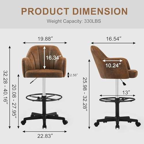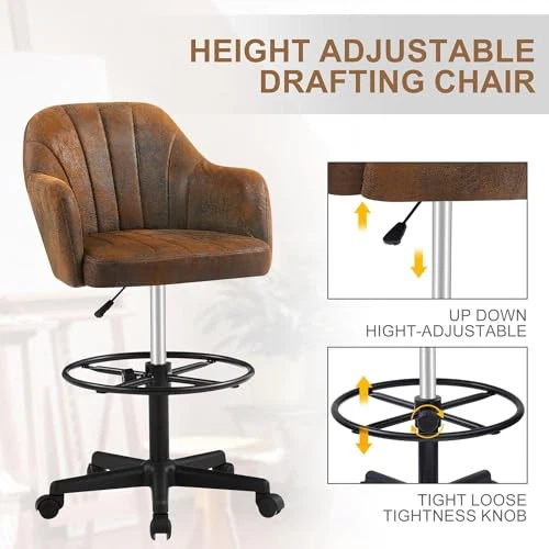 Room Type: Office, Dressing Room, Living Room, Study Room, Drawing Room EAN: Does Not Apply Form Factor: PU Leather Age Range Description: Child Furniture Finish: Leather Country of Origin: China Is Customizable: No Arm Style: With arms Item Weight: 18.12 pounds Brand: Does Not Apply gtin13: Does Not Apply Chair Backrest Width: 16.54 Inches Finish Type: Powder Coated Item Height: 1 Theme: Modern Type: Does Not Apply Indoor Outdoor Usage: Indoor Model Name: Does Not Apply Maximum Weight Recommendation: 330 Pounds MPN: Does Not Apply Shape: Rectangular Pattern: Solid Product Dimensions: 16.54"D x 19.88"W x 40.16"H Fill Material: Foam Special Feature: Adjustable Height, Arm Rest, Ergonomic, Rolling Leg Style: Tapered Leg Arm Height: 9.84 Inches Number of Height Positions: 3 Surface Recommendation: Hard Floor Manufacturer: Does Not Apply Back Style: Slat Back Is Foldable: No Included Components: 1*Drafting Chair, 1* Install Instruction Cushion Style: Boxed Edge UPC: 840408902793 Color: Brown Item Length: 1 Recommended Uses For Product: Drafting Unit Count: 1.0 Count Item Width: 1 Product Care Instructions: Wipe Clean Tilting: No Style: Modern Furniture base movement: Swivel