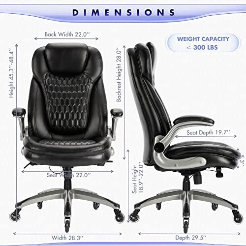 Return Policy Fast Delivery Trusted seller Executive Office Chair-Ergonomic Computer Desk Chair, High Back Leather Chair with Padded Flip-up Arms, Swivel Home Office Chair Upgraded Caster-Black Product Description MODERN HOME OFFICE CHAIR: newly upgraded office chair with eye-catching outlook makes your office chair no longer ordinary and matches with office, home, study and meeting room. Of course, COMFORT is the first essence of the office chair! Advanced ergonomic design and thick bonded upholstered leather are used to provide strong support EXTRA COMFORT: Adopt advanced ergonomic design and invest in materials! High backrest design and bionic spine contour help keep your spine in a relaxed state and maintain the correct sitting posture. The headrest is thickened in three layers to make when you lean on it, you can feel the ultimate soft support; The seat cushion is wider and double padded to offer a soft sitting feeling and long-lasting support. Padded flip-up armrests provide optimal support for forearms without cold touch UPGRADED WHEELS: Upgraded large caliber nylon casters, which are more solid and fashionable, more flexible for swivel rolling. Also, the caster is friendly to any floors and will not cause scratches. No floor mat is extra required. When swivel or rolling, t will be no abnormal noise, help you create a more efficient and silent working environment. The upgraded casters are not easy to fall off from the chair, durable enough for years of use FULLY ADJUSTABLE OFFICE CHAIR: Flip-up armrests improve flexibility for space-saving, excellent choice for working-from-home chair. Seat height can be adjusted between 18.9"-22". Pull the left lever to enjoy rocking from 90°-113°. With this office chair you can get the most comfortable sitting experience under different conditions, relax your back muscles and increase blood circulation while working and immersing yourself in study and gaming in front of your desk INVEST IN MATERIAL: Thick bonded and skin-friendly leather material provides soft-touch. The points on the leather can effectively prevent the leather from cracking. Strong integrated metal frame and heavy duty nylon base made the chair withstand up to 300lbs. Class 3 gas lift cylinder offering a more safe protection Shipping Returns Payment Shipping Shipping is FREE to all addresses other than APO/PO boxes in the lower 48 states. All our stock ships from US-based warehouses. Shipped via USPS or UPS (depending on location and package weight) Unless stated otherwise, all orders will ship within 24-72 hours of your payment being processed. Check our feedback to see the great reviews of FAST shipping we offer. Returns Seller does not accept returns Payment We currently accept payment via eBay managed payments only. Once payment is cleared, we will dispatch your shipment within 1-3 business days. Please refer to the "Shipping" tab for more information regarding shipping speed to your destination.