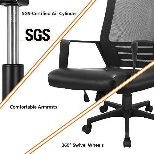 Return Policy Fast Delivery Trusted seller Ergonomic Office Chair Leather Seat and Mesh Back Computer Chair Executive Chair Mid-Back Rolling Swivel Chair with Lumbar Support and Armrests Adjustable Height for Office Meeting, Black Product Description Mesh & Leather Combination: The match of mesh and PU Leather is the highlight of this rolling desk chair. Smooth faux leather upholstery brings exceptional comfort and understated elegance, while the breathable mesh back keeps you naturally cool even after prolonged use. An ideal addition to the home office, computer workstation or study room Comfortable & Sturdy: With its generous 20’’ (W) x 21’’ (D) seat and high-density foam cushion, this modern desk chair provides great cushioned support to reduce seating muscle fatigue. Capable of up to 265lb with SGS-certified gas lift, quality nylon base and non-marking swivel casters Ergonomic Office Chair: Curved backrest perfectly fits the human body and adapts to the spine’s natural curve, alleviating back tension and discomfort during long office/meeting/studying sessions. This computer chair has a rocking function and can be adjusted from 18’’ to 22’’ in seat height to match various sitting positions Tilt Tension Knob: Back tilt tension is easy to control, and you can choose to tighten or release the tilt-tension by turning the knob beneath the seat while rocking back and forth 360° Smooth Mobility: Twisting and turning about is integral within the office. So this ergonomic swivel chair adopts a 23.5’’ wide star base and comes with 5pcs 360-degree swivel wheels, ensuring fluent and quick movement from one task to another without scratching the wooden floor Shipping Returns Payment Shipping Shipping is FREE to all addresses other than APO/PO boxes in the lower 48 states. All our stock ships from US-based warehouses. Shipped via USPS or UPS (depending on location and package weight) Unless stated otherwise, all orders will ship within 24-72 hours of your payment being processed. Check our feedback to see the great reviews of FAST shipping we offer. Returns Seller does not accept returns Payment We currently accept payment via eBay managed payments only. Once payment is cleared, we will dispatch your shipment within 1-3 business days. Please refer to the "Shipping" tab for more information regarding shipping speed to your destination.