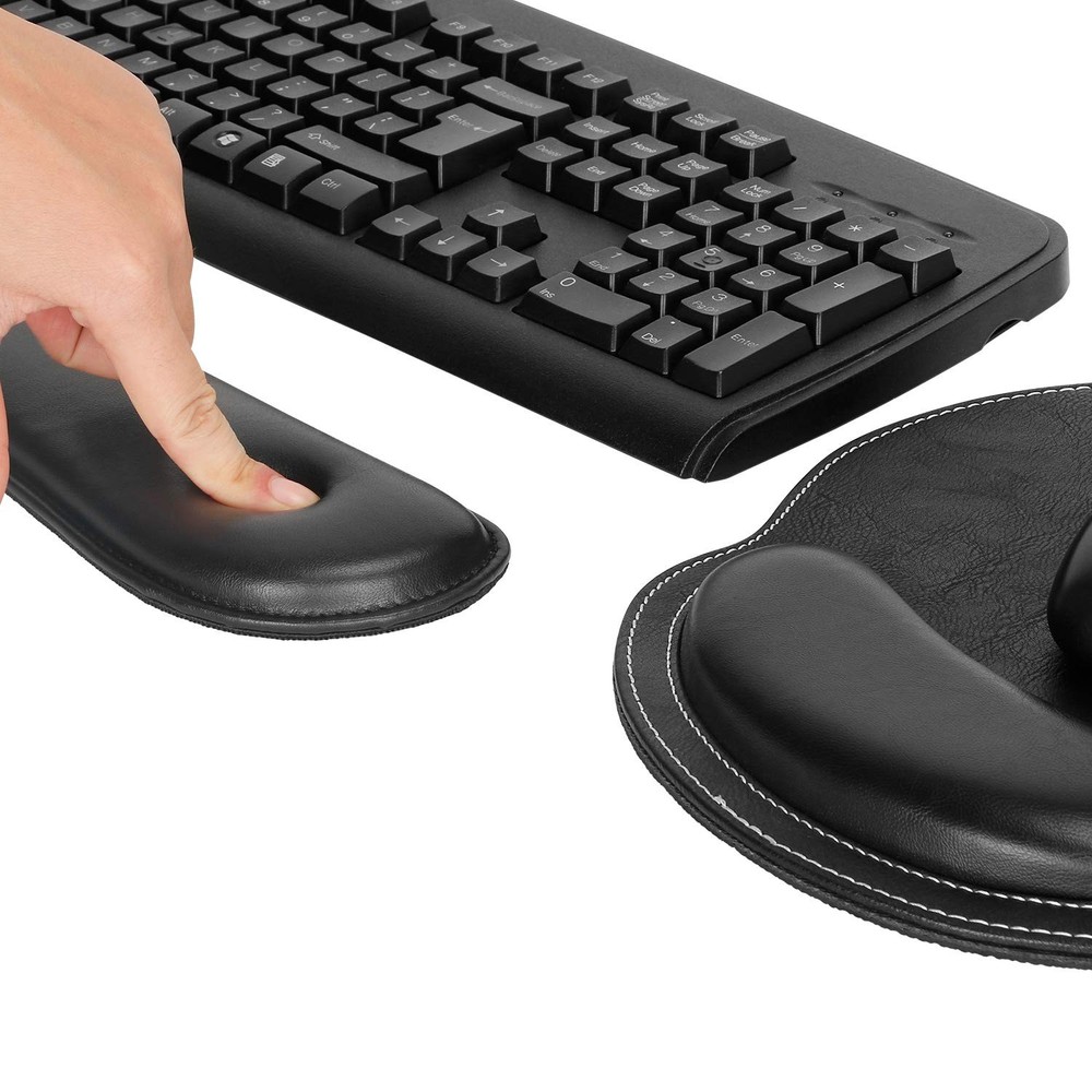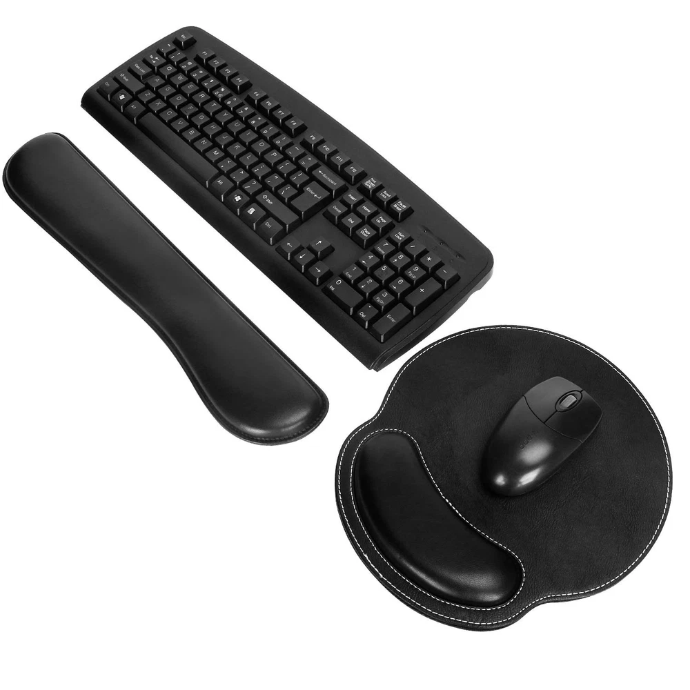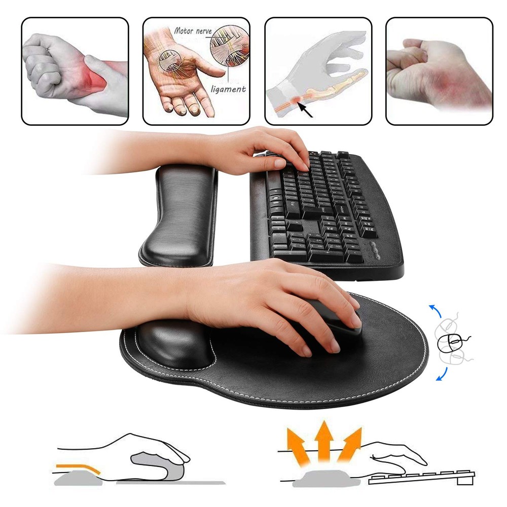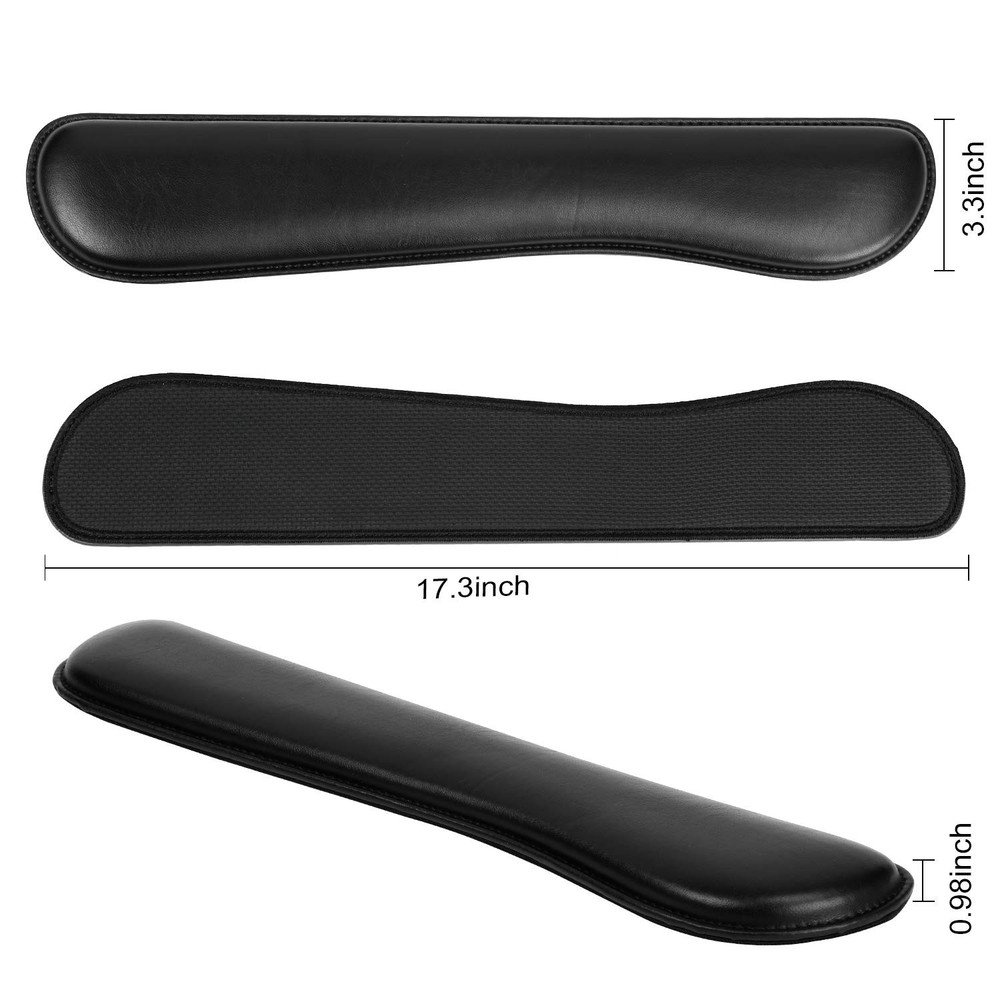 【Fatigue-free Typing Design】This keyboard wrist rest and wrist rest pad set is contoured ergonomically to keep the wrist well supported for higher while working and gaming for long periods of time. Perfect wrist & hand fatigue reliever for workers, gamers, writers, editors who are engaged at long typing work. 【Lightweight & Soft & Sturdy】Soft PU leather and interior spongy memory foam elastic materialto the pads,supply Lightweight, Comfortable, Sturdy and Ergonomic touch, slow bounces back and not easy to out of shape and Ideal for Longer Hours of Use,prevent your wrist from injury. 【Anti-slip Rubber Base】The backside of this wrist support kit is thickened with textured rubber material, which provides heavy grip preventing sliding or unwanted movement for Keyboard and pads when typing. Double Sticking and Press handing for edge to supply flat and smooth edge and will not roll up nor split open. 【Standard Size】The keyboard wrist support (44x8.5x2.5 cm/17.3*3.3*0.98 in) and the pad with wrist rest (27x24.5x2.5 cm/ 10.63*9.65*0.98 in) fits most computers or notebooks or , improve hand and wrist posture, avoid joint and wrist problems and release your elbows and shoulder for long hours of use on the computer. 【Perfect Gift】Fit for office workers, gamers, designers, students, and others who work on laptops or computers for extended periods of time.a great product use at office, family, school,etc. If there's an issue(man-made damage not included) of the item you received, please feel free to us firstly by , we will help you out promptly and positively.