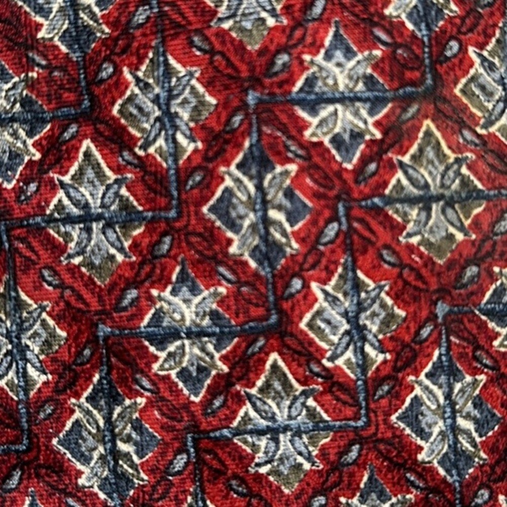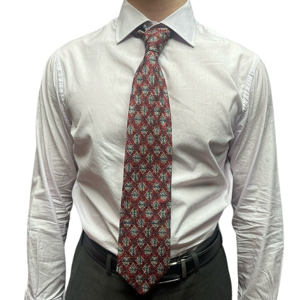 This Ermenegildo Zegna silk tie is absolutely stunning! The rich red and blue geometric jacquard pattern has a luxurious texture, and the craftsmanship is impeccable—just what you’d expect from Italian-made Zegna. The signature lining and woven imprint add a sophisticated touch. At 58.5", it’s the perfect length for a polished look. Even as preowned, it’s in fantastic condition—like new! A must-have for any stylish wardrobe.