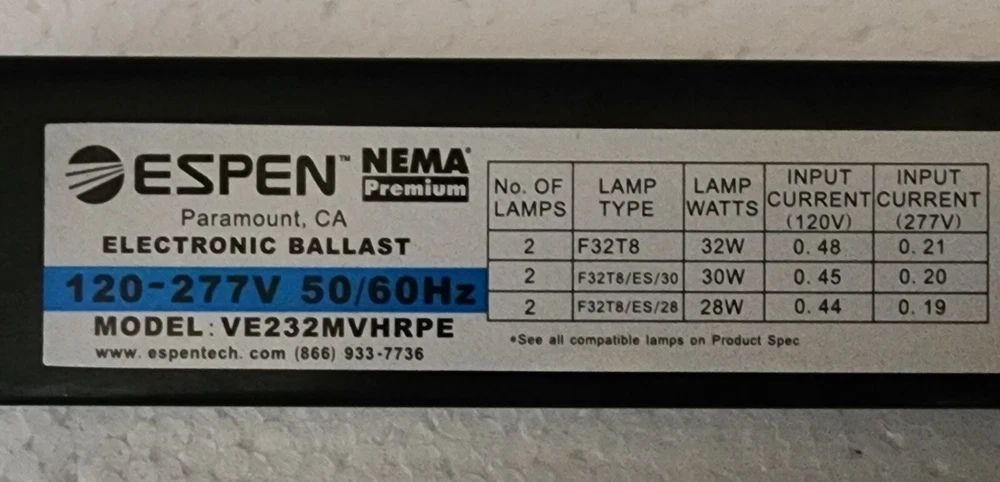 Espen Electronic Ballast 120-277V 50/60Hz Primary service UPS Ground Saver 1 - 6 business days 1 to 6 business days $ Buyer pays $ Each additional cost