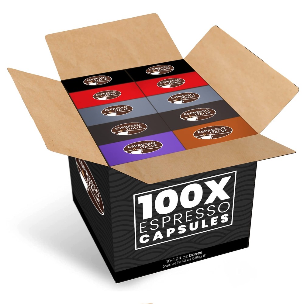 Capsules Compatible with Nespresso Machines, 100 Count - VARIETY PACK, Italian Coffee Pods Expresso Become your own barista - Nespresso Expresso Italia capsules, created to deliver the authentic taste of Italian espresso. These recyclable capsules are compatible with Nespresso Original line machines and come in 13 different intensities. Certified Compatibility - Our capsules have undergone rigorous testing to ensure perfect compatibility with Nespresso Original Line machines, and have been verified by an external laboratory for your peace of mind. Enjoy with confidence - Prepare the perfect espresso in just 2 minutes with capsules. These single-dose capsules are hermetically sealed and contain the same high quality ingredients every time, guaranteeing a consistent and delicious coffee experience. Experience a wide range - From medium to dark roast intensities, including FORTE and DECAF, with capsules for capsule coffee makers. Each set includes 10 capsules with the best coffee blends, offering the taste of European-style espresso in the comfort of your home or office. Disclaimer - Please note that is not affiliated with Nespresso in any way. Nespresso is a registered trademark of Societe des Produits Nestle S.A. Our products are not endorsed, sponsored, authorized or approved by Nespresso USA Inc. Shipping We offer FREE shipping on all orders! We ship within Three business days of payment, usually sooner. We use a selection of shipping services such as UPS, FedEx, USPS etc. We only ship to the lower 48 states, no APO/FPO addresses or PO Boxes allowed. Local pickups and combined shipping options are not provided at this time. Return You can return a product for up to 30 days from the date you purchased it. Any product you return must be in the same condition you received it and in the original packaging. Please keep the receipt. Payment We accept payment by any of the following methods: PayPal Please pay as soon as possible after winning an auction, as that will allow us to post your item to you sooner! Feedback Customer satisfaction is very important to us. If you have any problem with your order, please contact us and we will do our best to make you satisfied. Contact Us If you have any queries, please contact us via ebay. We usually respond within 24 hours on weekdays. Please visit our eBay store to check out other items for sale! Thank you for shopping at our store.