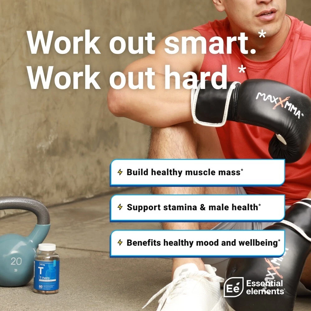 Maintain T Health Essential elements T-hero is skillfully designed to maintain healthy testosteron levels already within the normal range, aid your workout performance, and maintain optimal male health.* Energy, Stamina, Gains The T-hero testosteron booster formula may help men maintain their energy, stamina, and gains from workouts when paired with a well-balanced diet.* Everyday Stress Reducer & Physique Support The inclusion of ashwagandha and shilajit helps support muscle mass while reducing normal, everyday stress that can occasionally hinder workouts.* For Healthy Muscle Mass & Strength Support Even as you age, maintaining healthy testosteron already within a normal range can help you reinforce your workout gains, which can help keep you fit, powerful, and long-lasting.* Broad-Spectrum Formula Whether for bodybuilding help or male health, T-hero supports normal, healthy performance in the areas you want.*