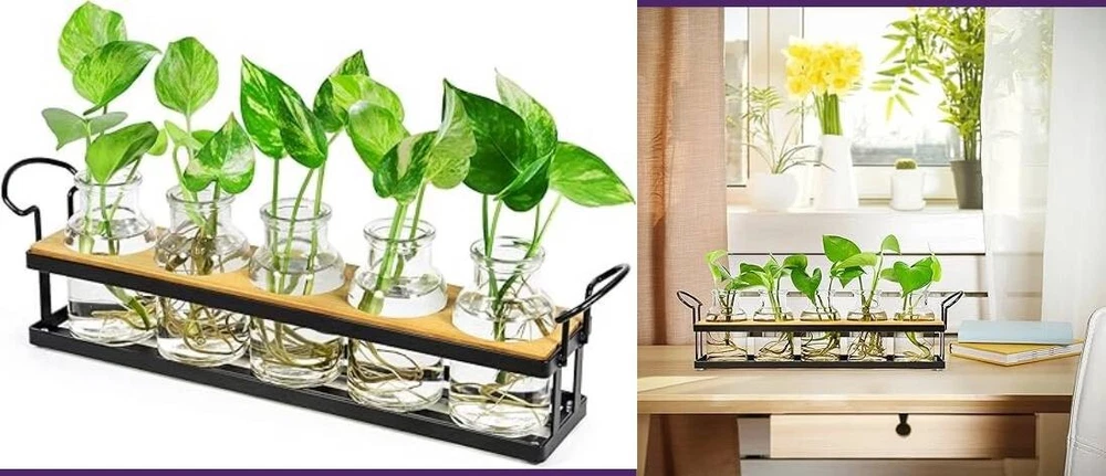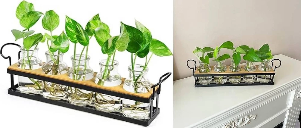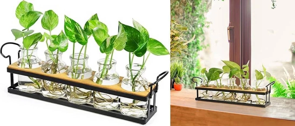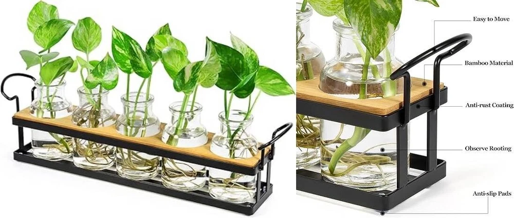 Estación de propagación de plantas: este terrario minimalista y elegante funciona bien para propagar esquejes de plantas de interior. Cada frasco de propagación de gran capacidad proporciona mucho espacio para enraizar las plantas, lo que le permite observar el proceso de crecimiento y disfrutar de la diversión del cuidado de las plantas. Diseño reflexivo: la bandeja de metal viene con almohadillas antideslizantes en la parte inferior para mejorar su estabilidad, lo que garantiza que la maceta de vidrio de propagación se pueda colocar en cualquier lugar de forma segura sin que se caiga o se caiga fácilmente. Las asas le permiten moverlo fácilmente y cambiar el agua. Útil y decorativo: este soporte para plantas hidropónicas, con su apariencia simple y elegante, será una decoración llamativa para su hogar u oficina. Muestre hermosas plantas o flores como potos, monstera, hiedra, menta, verbena, margarita africana, violetas y más, en su escritorio, alféizar de la ventana, mostrador o estante, agregando verde natural y frescura a su vida. Gran idea de regalo: este jarrón de vidrio para plantas funcional y hermoso es un regalo increíble para los amantes de las plantas o los entusiastas de la jardinería. Puede ser un maravilloso regalo de jardinería, regalo de inauguración de la casa para un nuevo hogar, regalo de boda para una pareja o regalo de pronta recuperación para una mujer. No requiere ensamblaje: la estación de propagación hidropónica ya está ensamblada y lista para usar. El paquete incluye: 1 soporte de metal negro con tablero, 5 botellas de 4.4 oz, 1 cepillo de limpieza. Nota: Plantas no incluidas. Si alguna parte del artículo que recibió no es perfecta, infórmenos y resolveremos su problema en 24 horas.