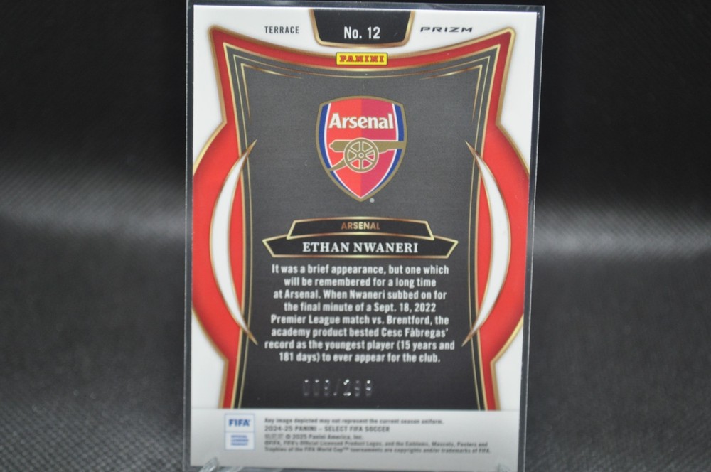 The product is a 2024-25 Panini Select FIFA Soccer trading card featuring Ethan Nwaneri in his Arsenal jersey. The card is a Terrace Pink Mojo parallel, numbered out of 299, and is part of the base set for that season. It is a standard-sized card made of card stock, with a thickness of 35 Pt, and is part of the UEFA Champions League and Premier League leagues. The card is not autographed and is authenticated by Panini Authentic. It is an original release by Panini in the United States, and is a collectible item for soccer fans and trading card enthusiasts.