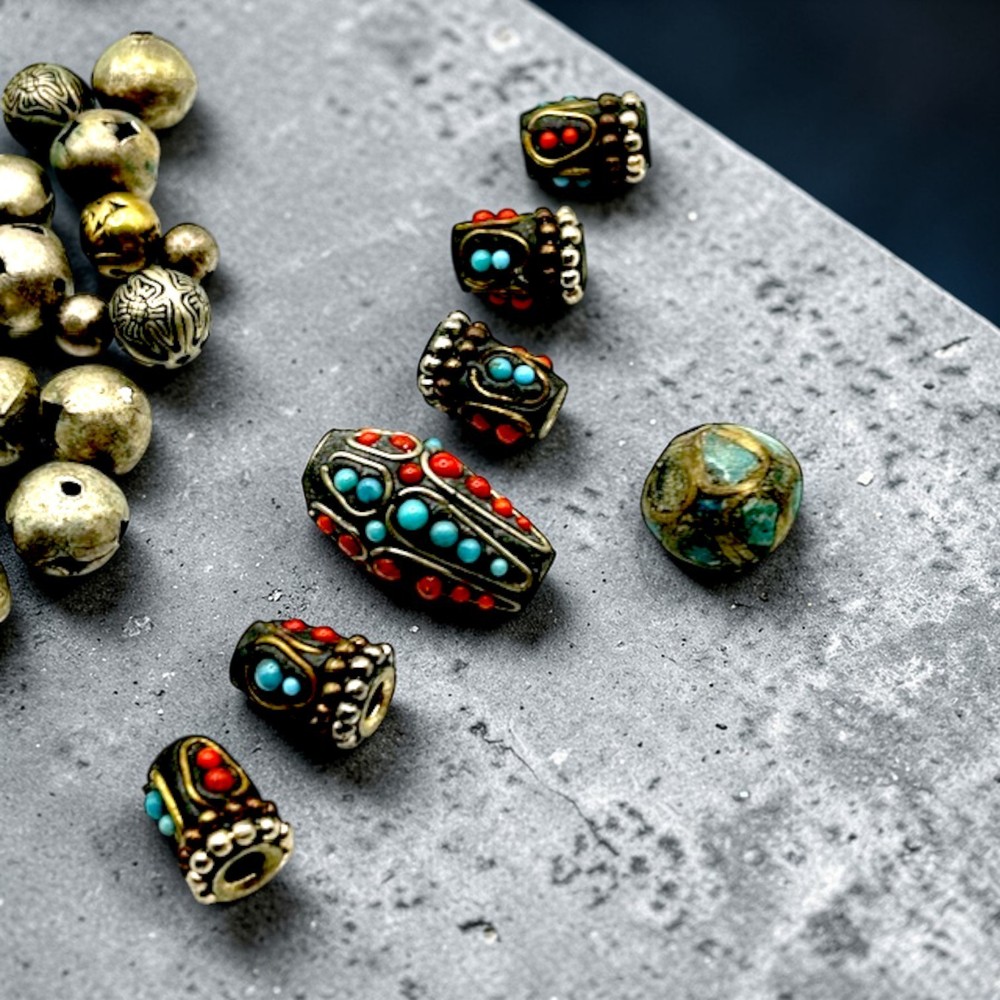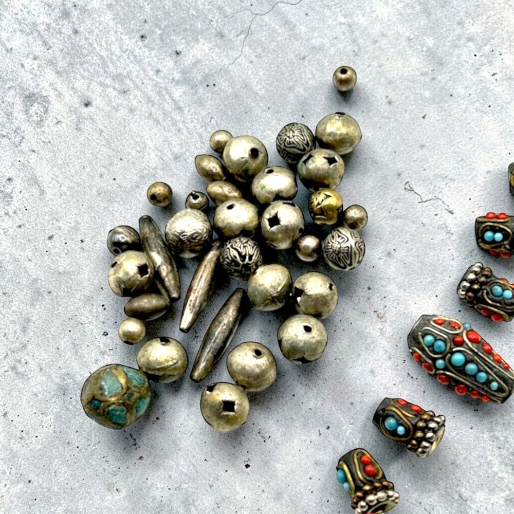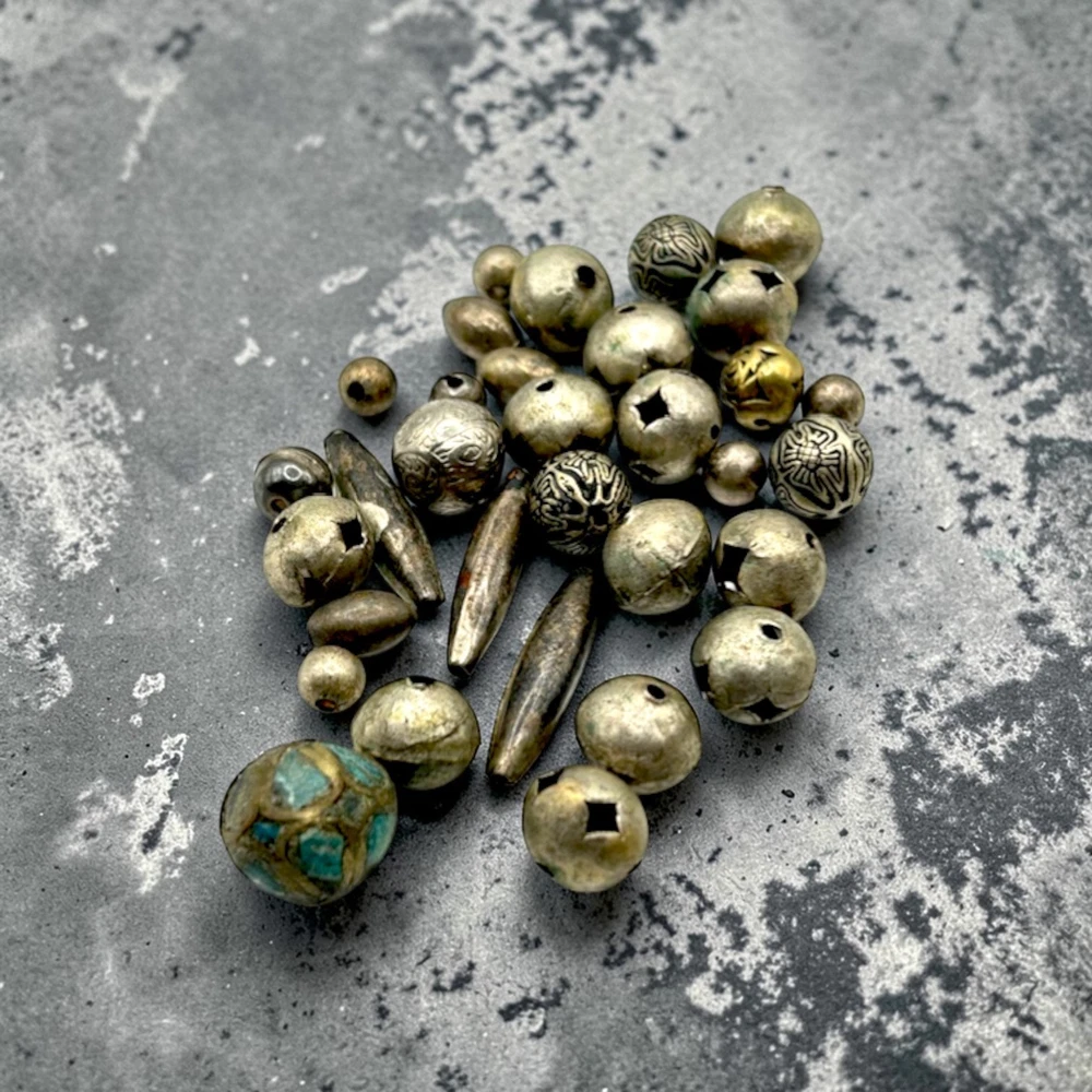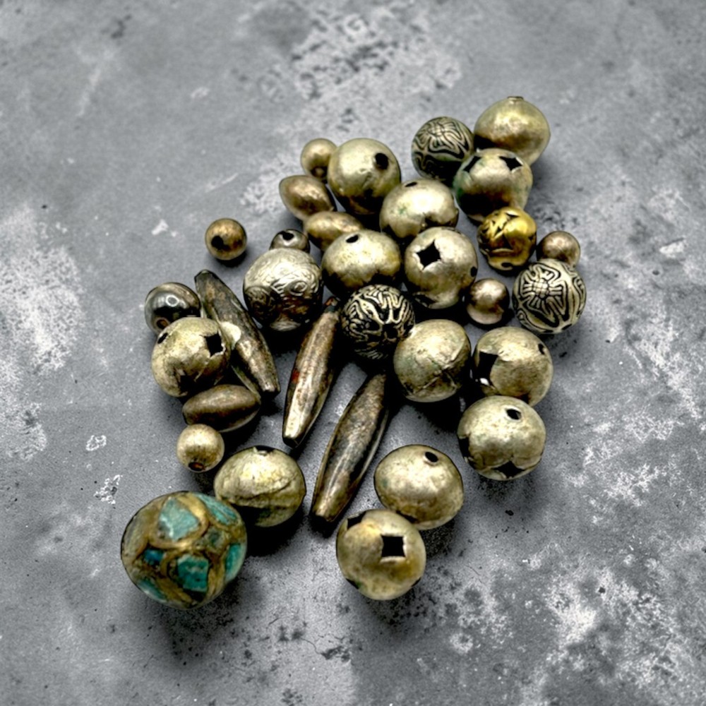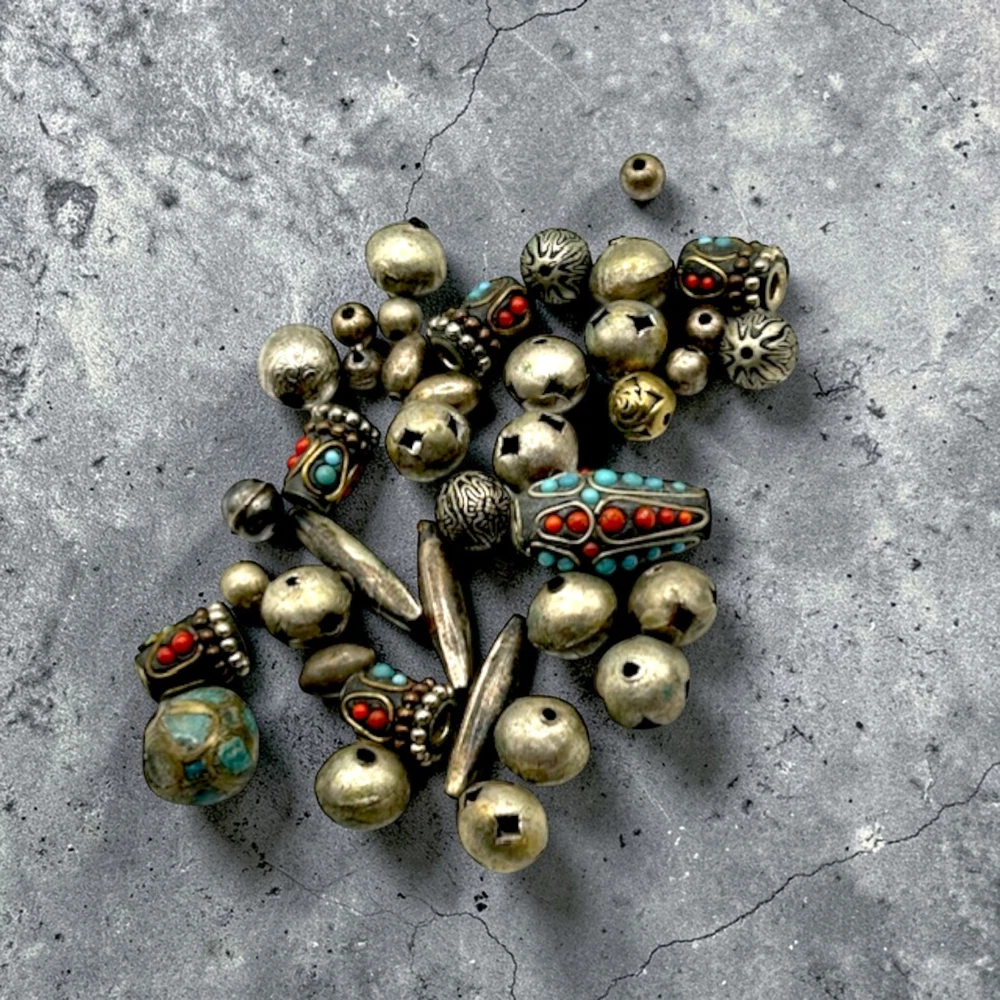 This product is a unique collection of Tibetan clay coral & turquoise beads, and a nice collection of ethnic silver vintage beads, perfect for jewelry making. The beads are loose and handmade, adding a touch of authenticity and cultural flair to any jewelry creation. The combination of the natural beauty of the turquoise stone with the traditional craftsmanship of the Tibetan clay and ethnic silver beads makes for a versatile and eye-catching selection for jewelry enthusiasts and crafters alike. I am not sure of the silver bead origin, they are light and hollow, there is a total of 39 beads in this collection. The beads have not been cleaned and will probably look quite nice when they are all buffed up. total.